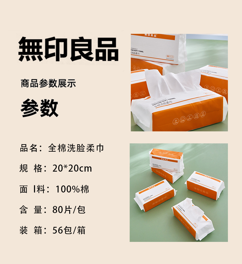 规格:20*20cm 面料:棉 含量:80片/包 箱:56包/箱 1.优选材质:产品材质甄选优质天然的植物纤维(再生纤维素纤维) ,天然植物萃取,亲肤舒爽; 2.整款产品干湿两用,温和亲肤,AB双面天然植物纤维,无任何添加有害成分,呵护您的肌肤.