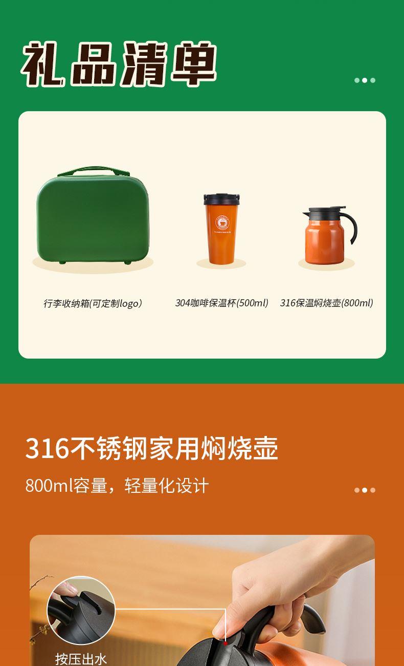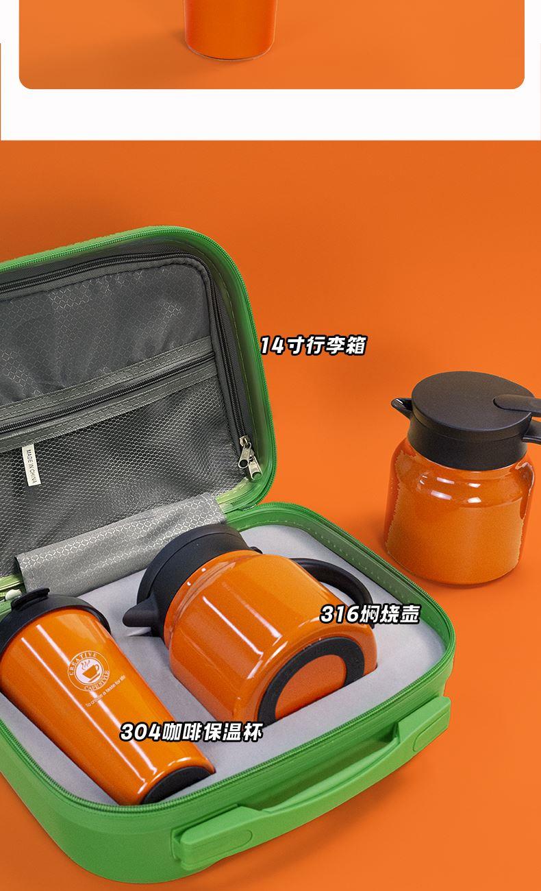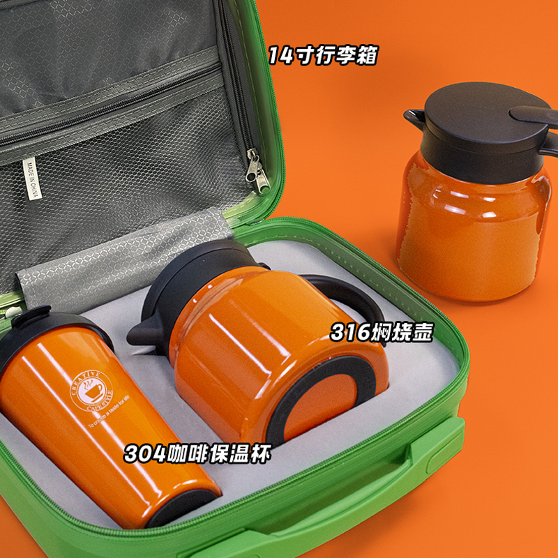行李箱尺寸: 14寸/30X24X15cm 焖烧壶:316不锈钢,约800ml 咖啡杯:304不锈钢,500ml