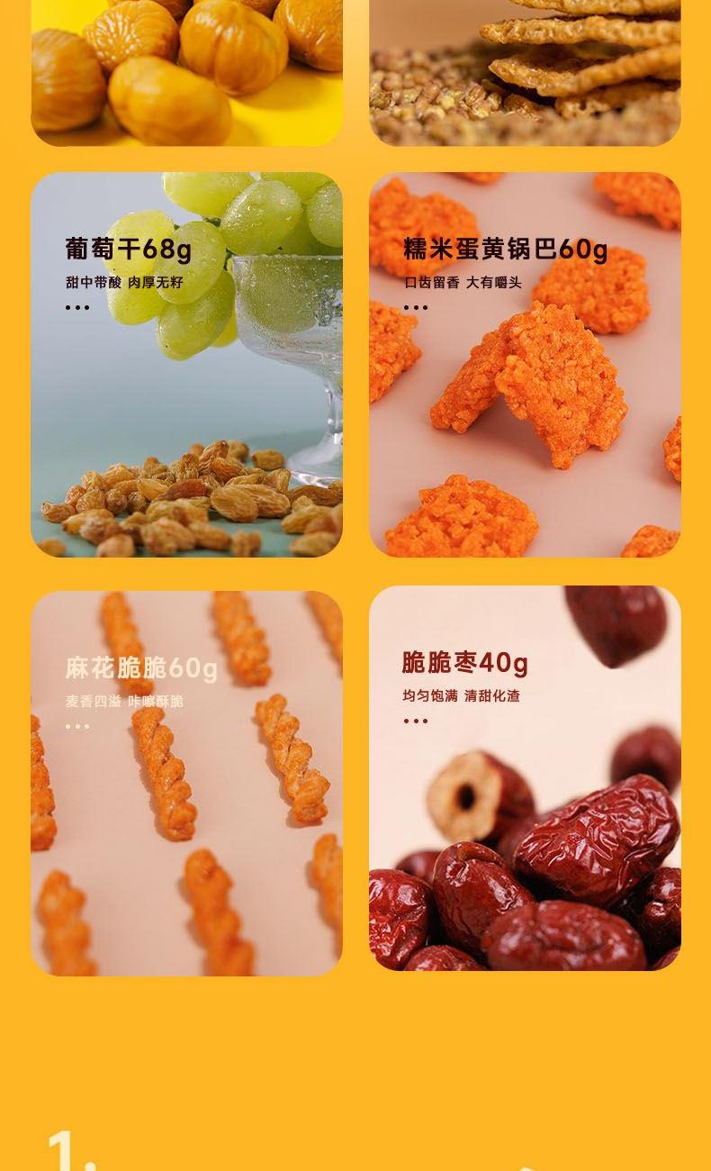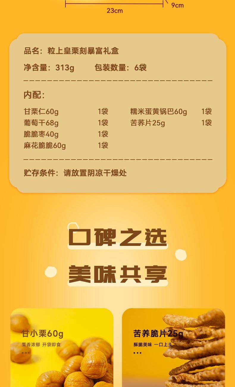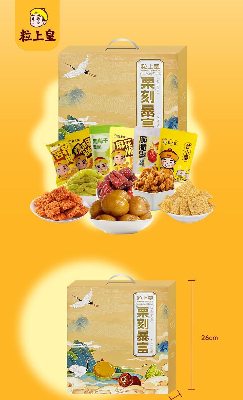 粒上皇甘栗仁60g*1 粒上皇葡萄干68g*1 粒上皇脆脆枣40g*1 粒上皇麻花脆脆60g*1 粒上皇糯米蛋黄锅巴60g*1 粒上皇苦荞片25g*1 精致礼盒*1