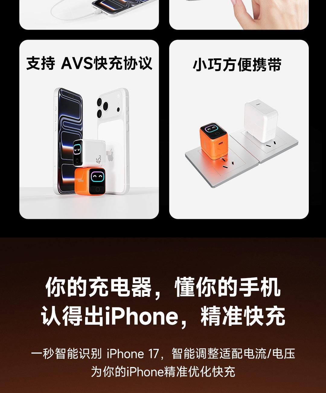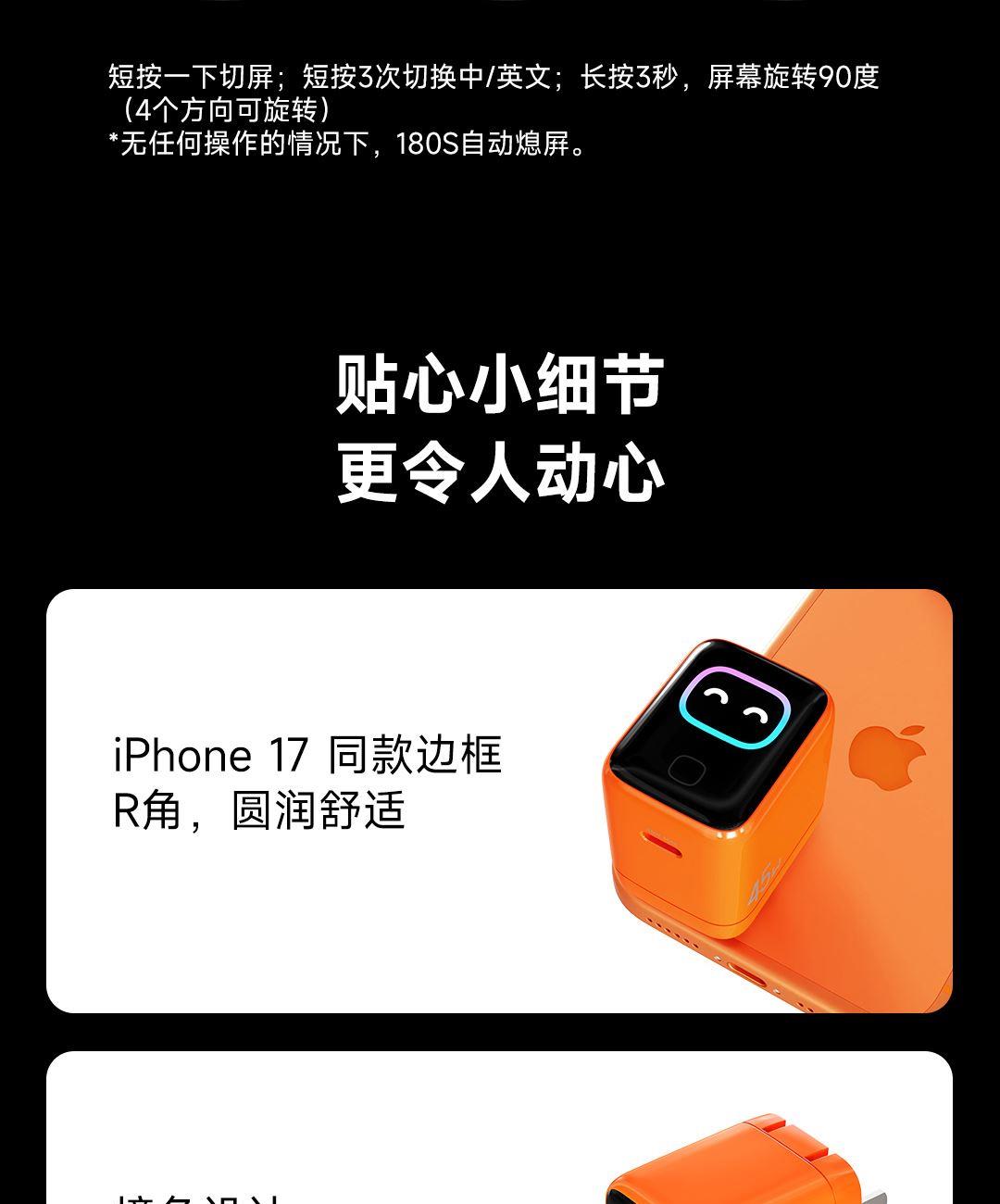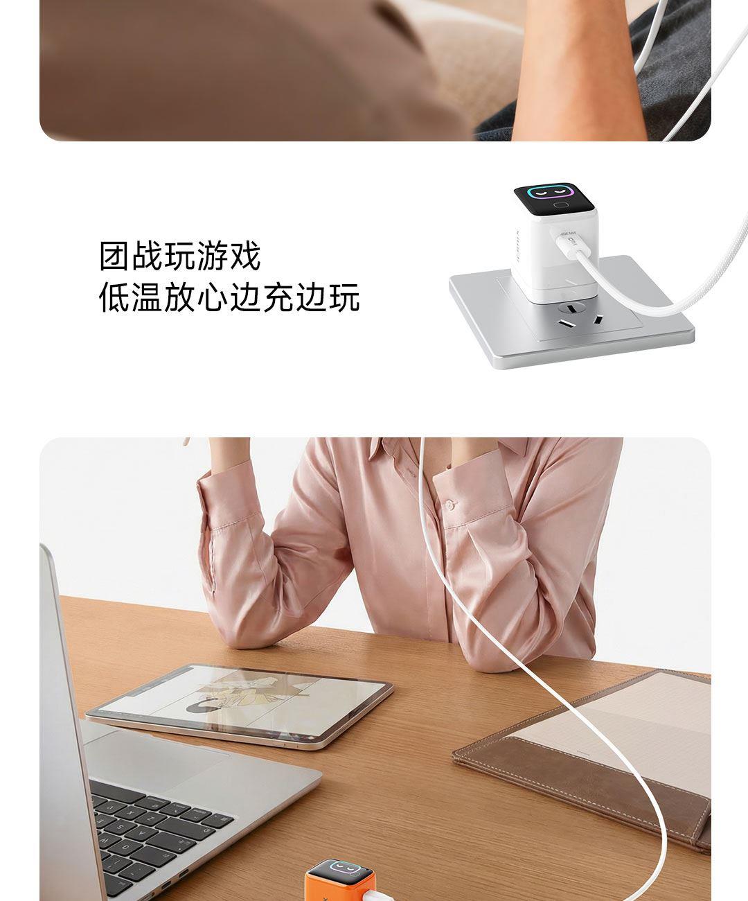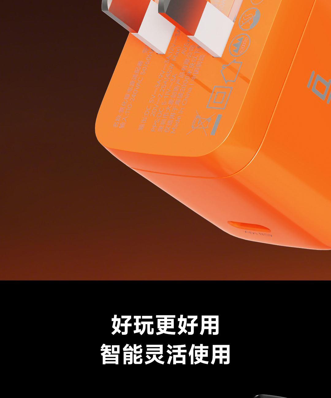 采用航天领域新型半导体材料GaN(氮化镓),使芯片集成度和能量转化率更高,体积更小,效率更高,发热更低 TYPE-C支持PD45w输出,兼容 PD3.0、QC4.0、FCP、AVS等主流协议可为苹果/安卓/MacBook等轻松补电,应急办公无忧 90°可折叠插脚,不划伤物品,轻松收纳,差旅携带方便 当手机电量过低,智能开启快充模式。80%电量切换涓流充电,保护电池不过充,智能涓流模式,不过充更安心 屏幕实时显示电量,待机状态下,萌趣表情包提示,好玩更好用,中英文切屏,屏幕旋转 外壳采用V0级防火阻燃材质,耐磨耐用。新3C安全认证,使用更安全 输入:110-240VAC 50/60Hz 1.0A Max 输出:DC 5V-3A,9V-3A,12V-3A,15V-2.5A,20V-2.25A(45W Max) PPS:DC 5-11V-3A,AVS+UFCS:9-20V-2.25A 尺寸:41.5*32.1*40.8mm 重量:约72g 顏色:白色、橙色