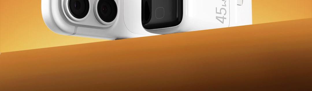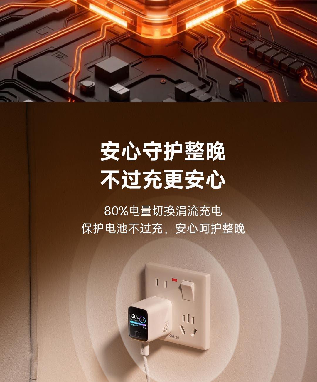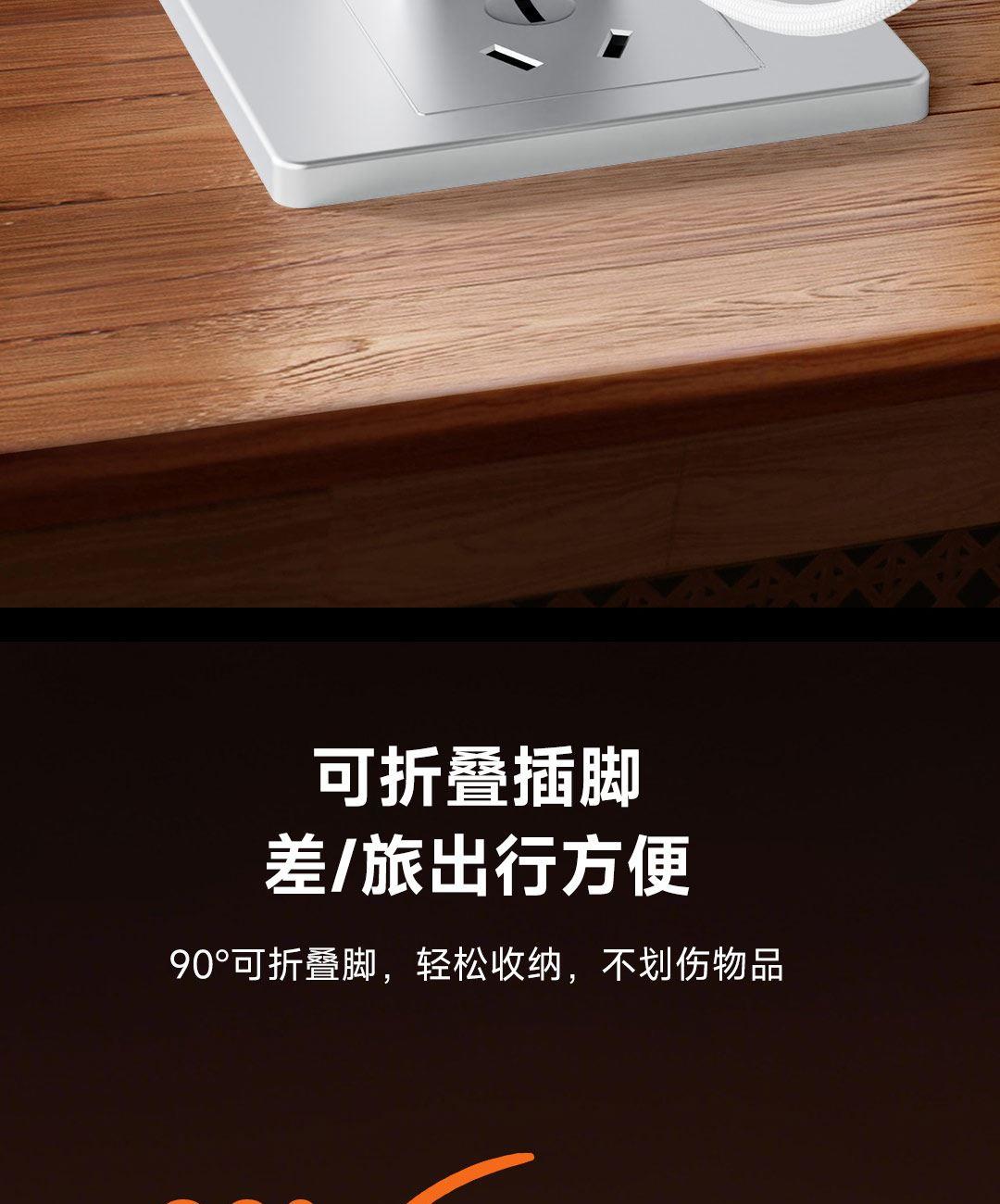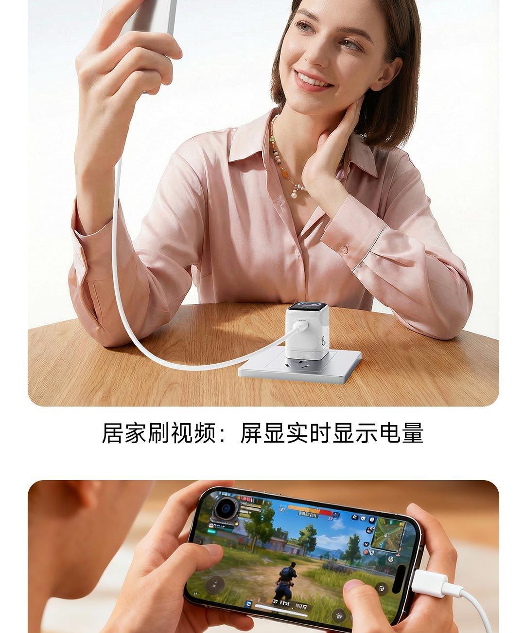 采用航天领域新型半导体材料GaN(氮化镓),使芯片集成度和能量转化率更高,体积更小,效率更高,发热更低 TYPE-C支持PD45w输出,兼容 PD3.0、QC4.0、FCP、AVS等主流协议可为苹果/安卓/MacBook等轻松补电,应急办公无忧 90°可折叠插脚,不划伤物品,轻松收纳,差旅携带方便 当手机电量过低,智能开启快充模式。80%电量切换涓流充电,保护电池不过充,智能涓流模式,不过充更安心 屏幕实时显示电量,待机状态下,萌趣表情包提示,好玩更好用,中英文切屏,屏幕旋转 外壳采用V0级防火阻燃材质,耐磨耐用。新3C安全认证,使用更安全 输入:110-240VAC 50/60Hz 1.0A Max 输出:DC 5V-3A,9V-3A,12V-3A,15V-2.5A,20V-2.25A(45W Max) PPS:DC 5-11V-3A,AVS+UFCS:9-20V-2.25A 尺寸:41.5*32.1*40.8mm 重量:约72g 顏色:白色、橙色