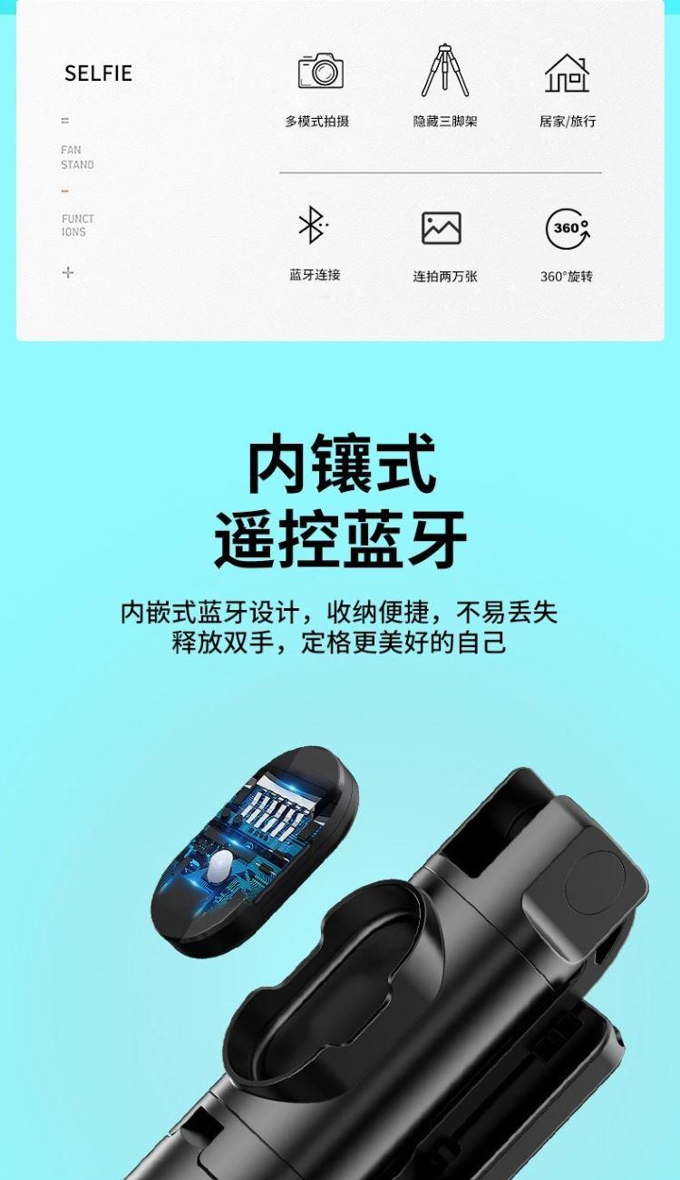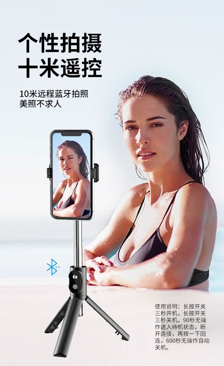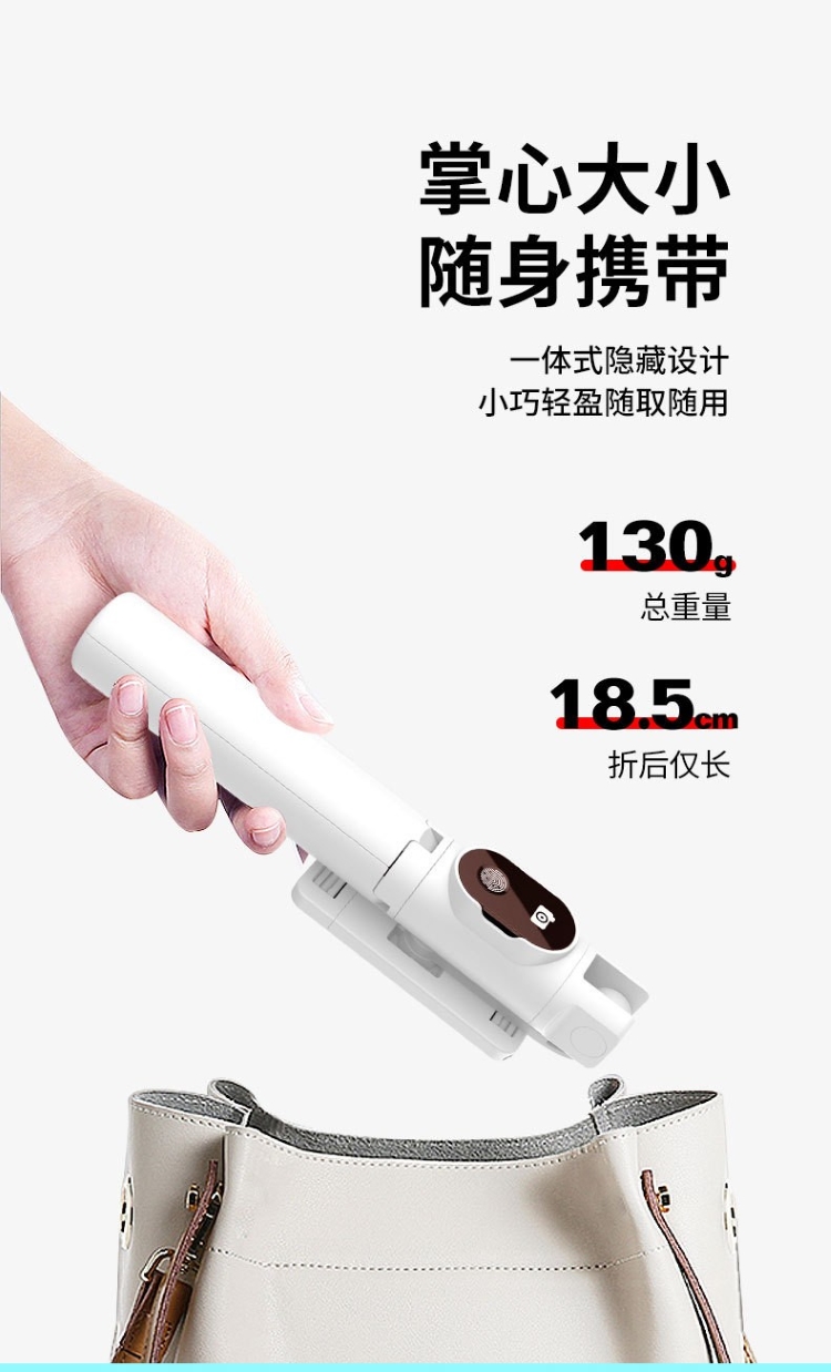 主 材 质: 不锈钢+ABS 产品颜色: 黑色 白色 净 重: 123g 载 重 量: 500g 可夹范围:65-65mm 伸缩长度:18.5-71cm 伸缩节数:5 电池容量:70mAh 充电电压:3V 待机时间:100小时以上 连拍次数:500次以上