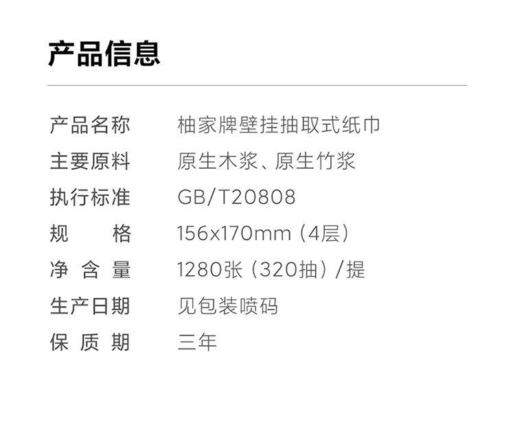 产品货号:40320-1 纸面规格:156*170mm(4层/抽) 产品规格:1280张(320抽)/提 主要原料:原生木浆 保 质 期:3年