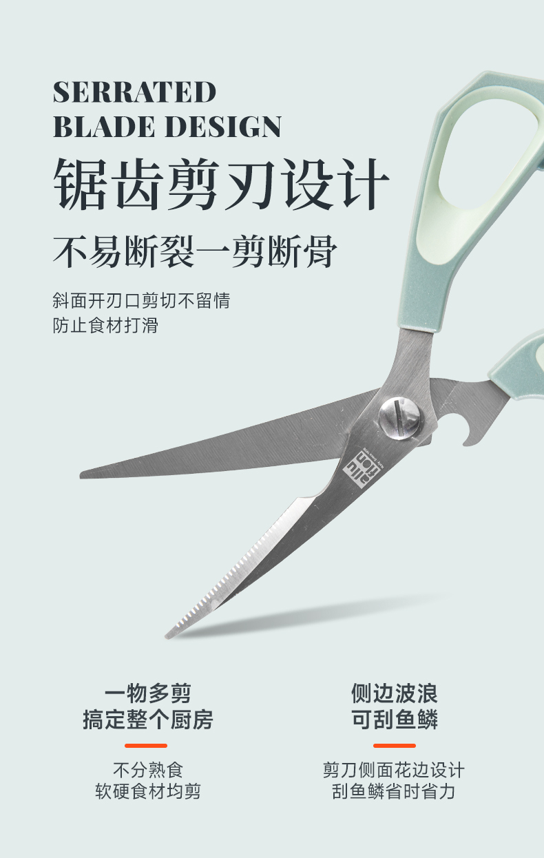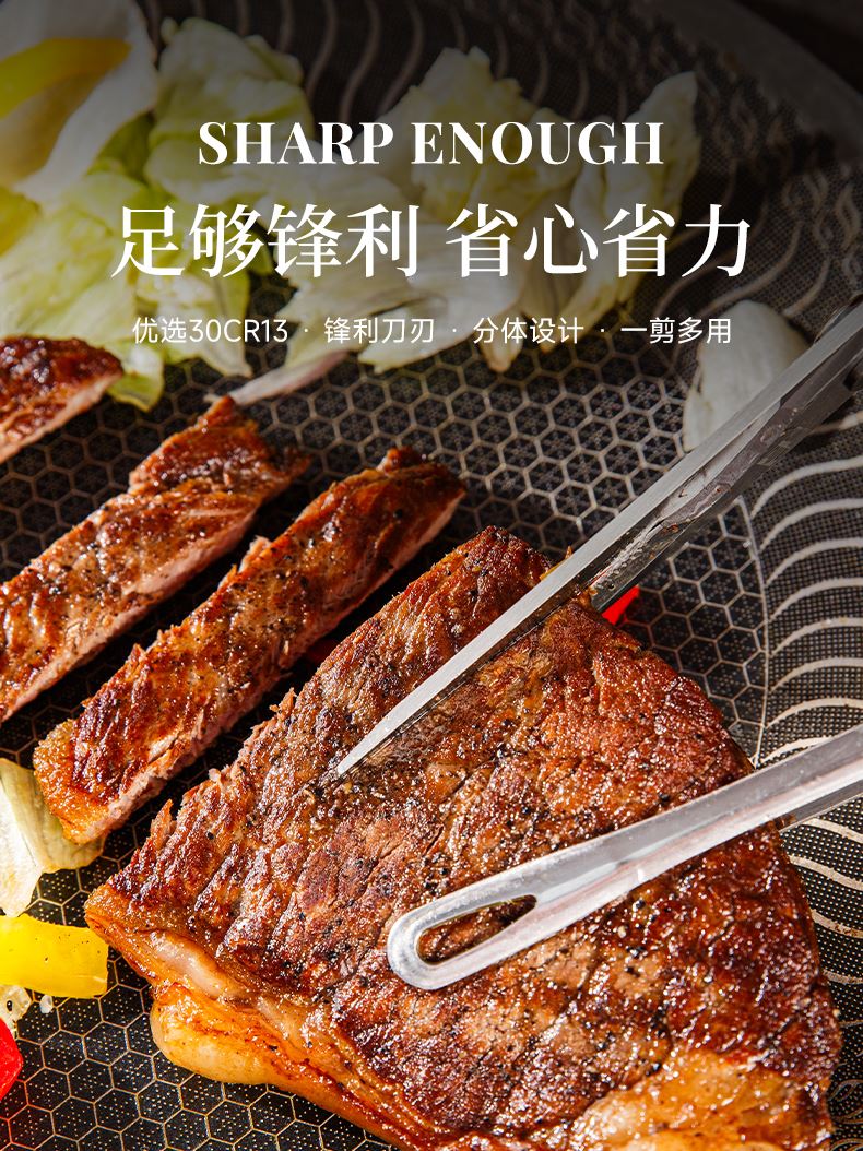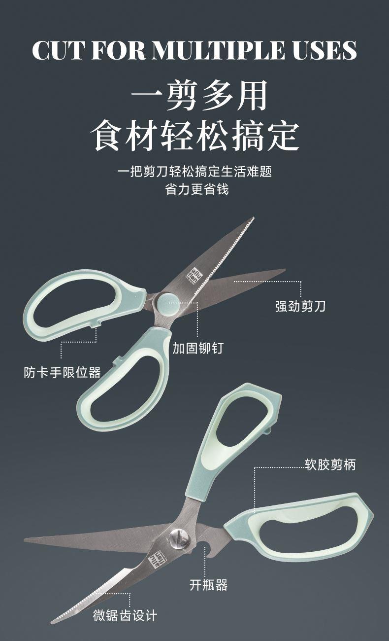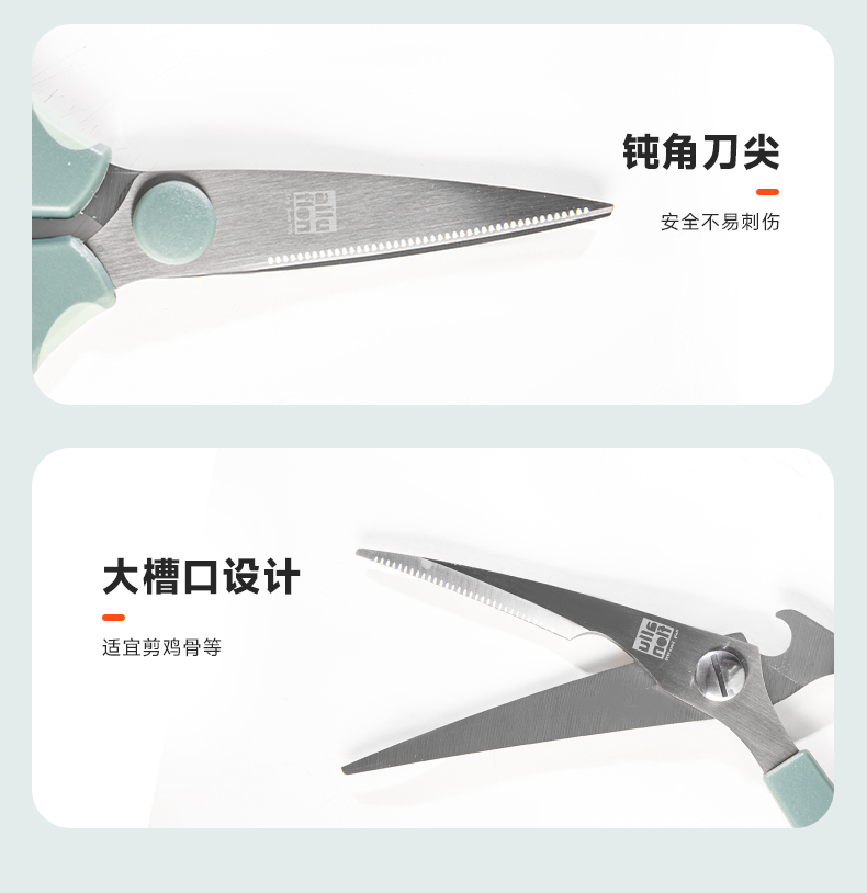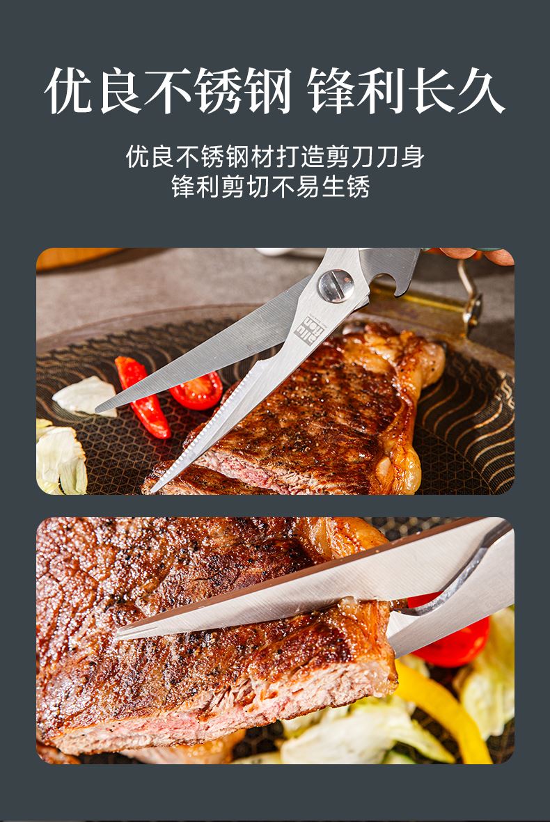 产品配置:厨房剪+烤肉剪 产品货号:2215051802 外箱尺寸:460*335*465mm 1、锯齿剪刀设计,刀刃锋利不易卷 2、加厚手柄,防烫防滑防断裂 3、钝角刀尖,安全不易刺伤 4、强劲铆钉加固,提升剪刃贴合度