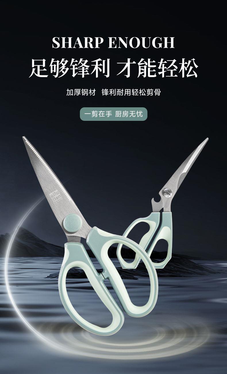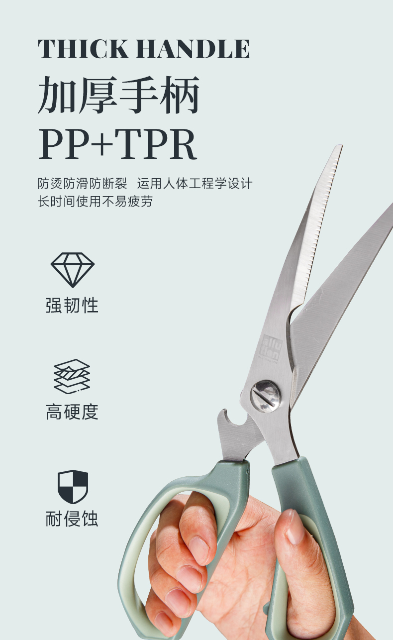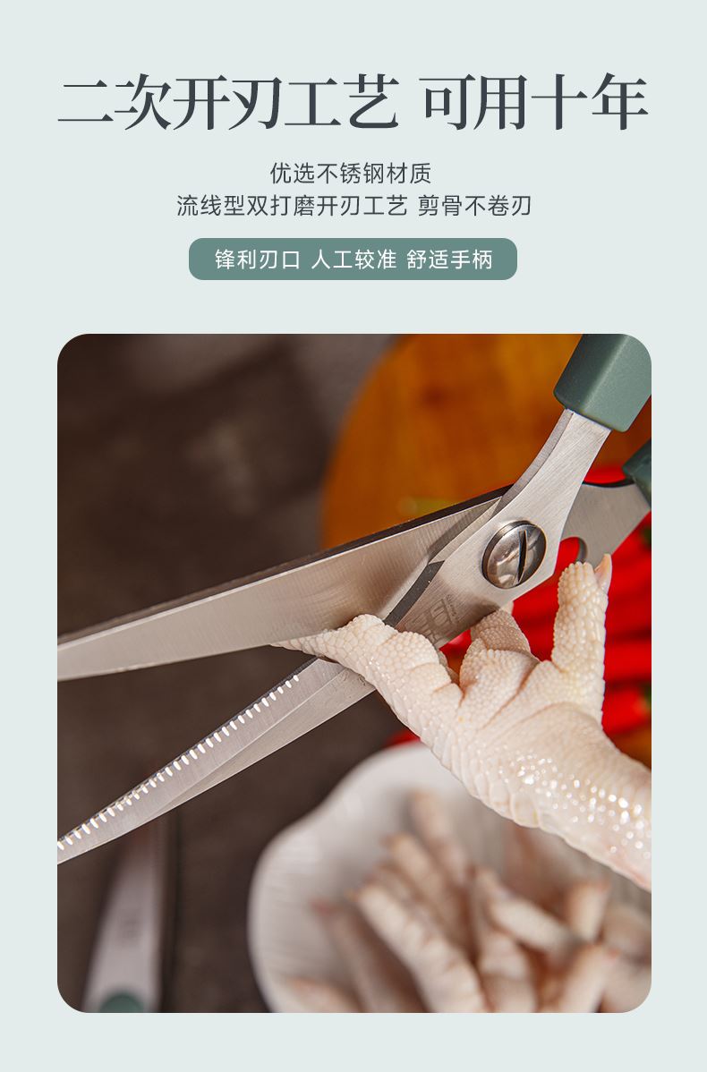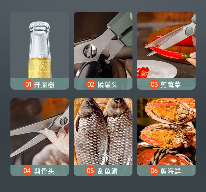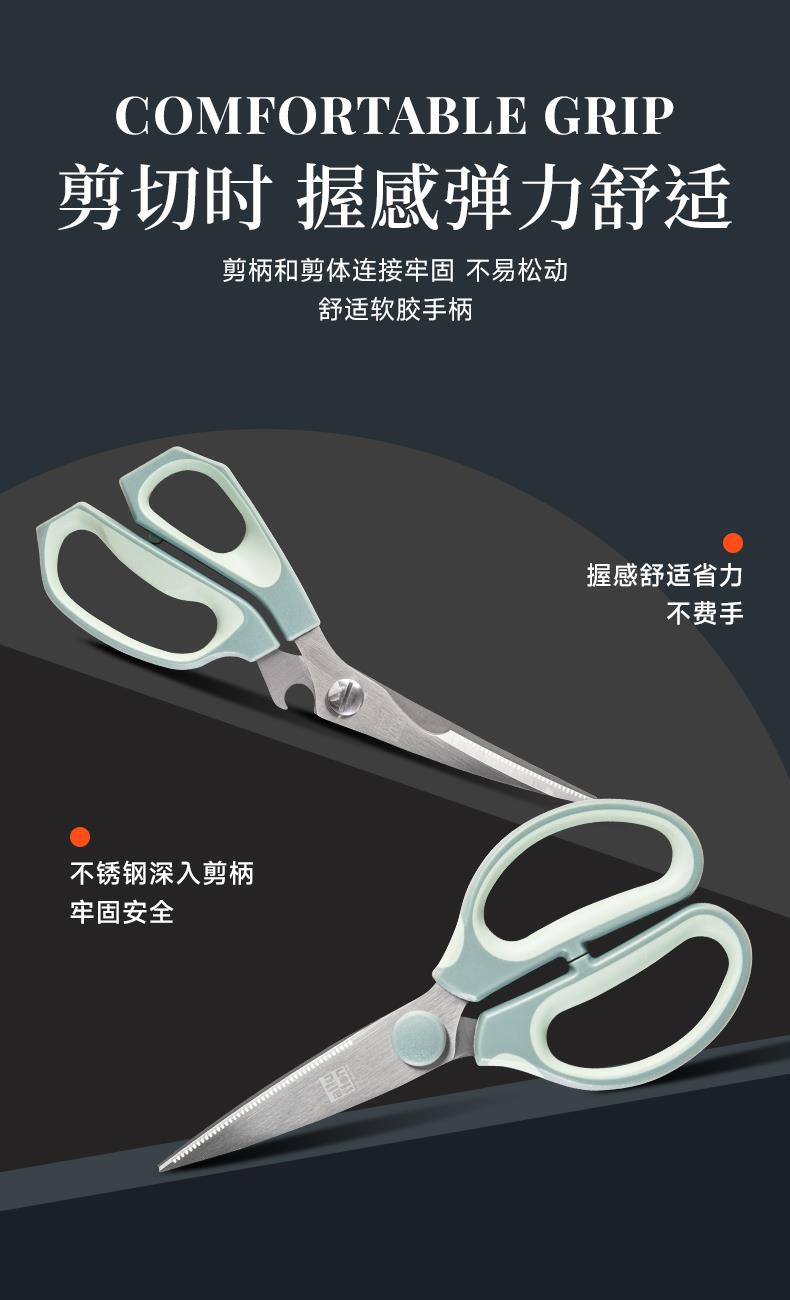 产品配置:厨房剪+烤肉剪 产品货号:2215051802 外箱尺寸:460*335*465mm 1、锯齿剪刀设计,刀刃锋利不易卷 2、加厚手柄,防烫防滑防断裂 3、钝角刀尖,安全不易刺伤 4、强劲铆钉加固,提升剪刃贴合度
