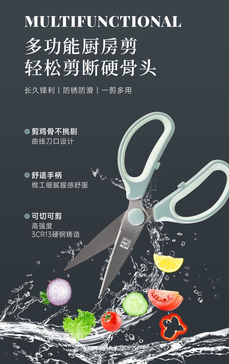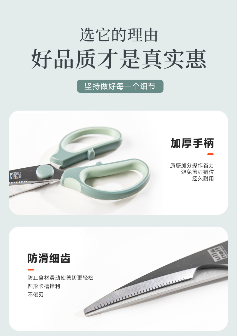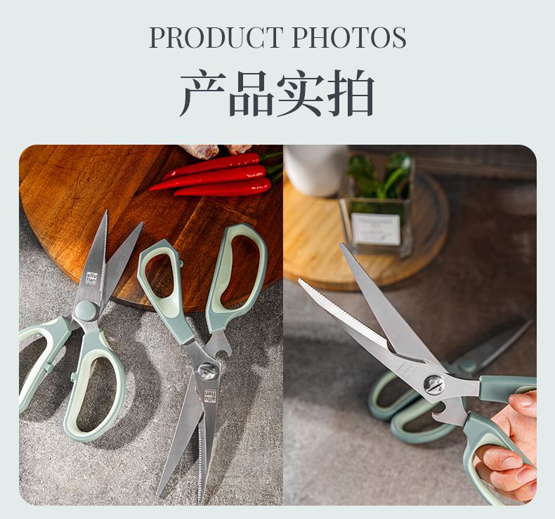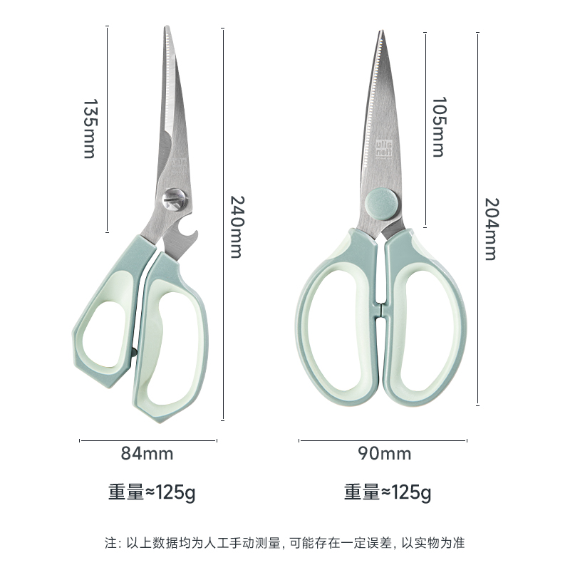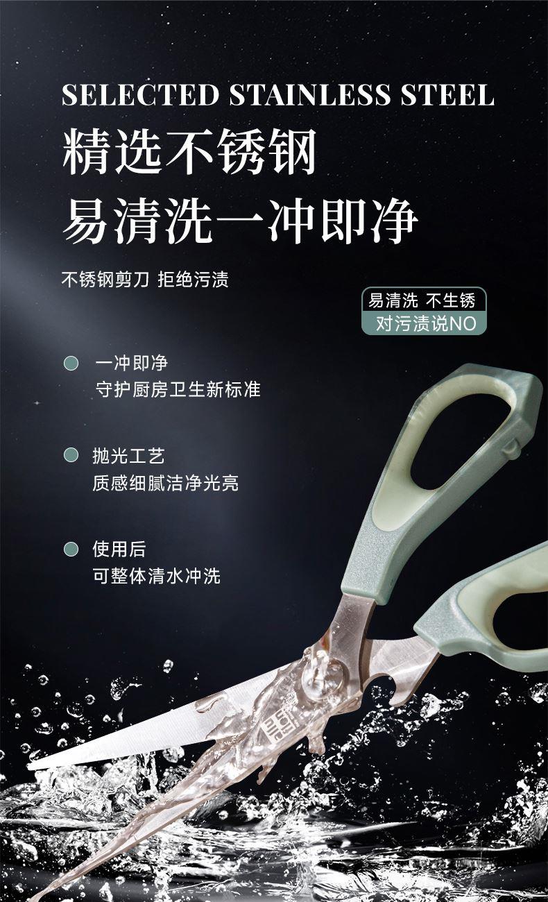产品配置:厨房剪+烤肉剪 产品货号:2215051802 外箱尺寸:460*335*465mm 1、锯齿剪刀设计,刀刃锋利不易卷 2、加厚手柄,防烫防滑防断裂 3、钝角刀尖,安全不易刺伤 4、强劲铆钉加固,提升剪刃贴合度