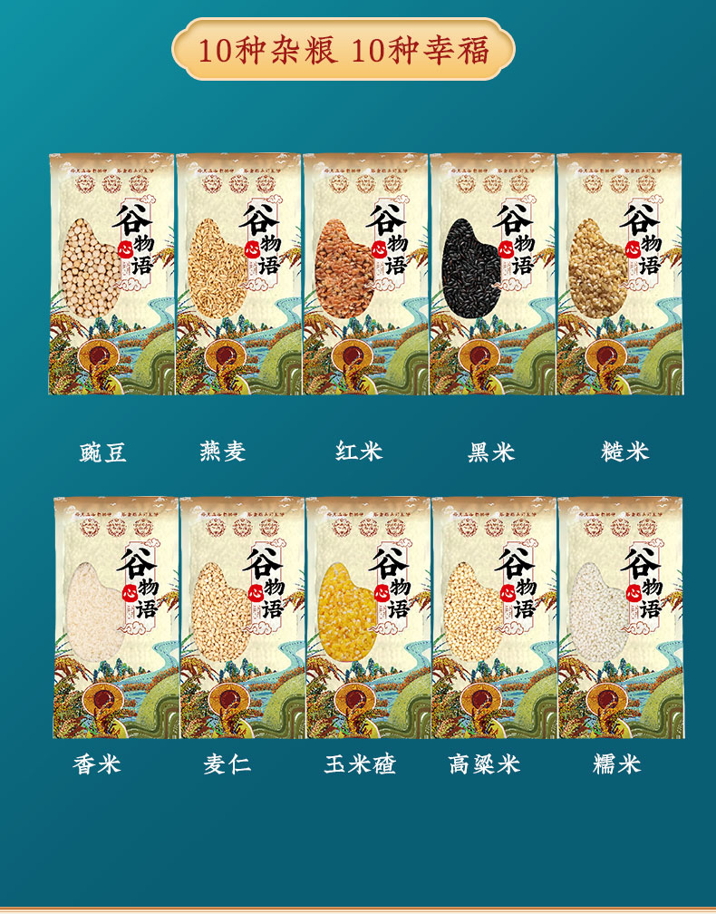 谷物心语 净含量:2500g 条码:6972761600246 产品规格配置:豌豆、糙米、玉米碴、高粱米、麦仁 红米、燕麦、黑米、香米、糯米(250gx10袋) 盒尺寸:42*9.5*28.5cm 尺寸:59.5*43*30 箱重量:18.27kg 箱体积:0.077方