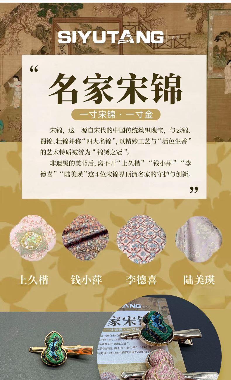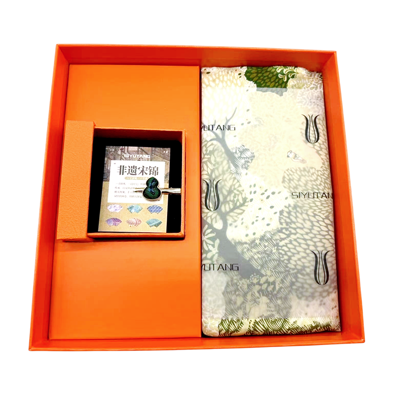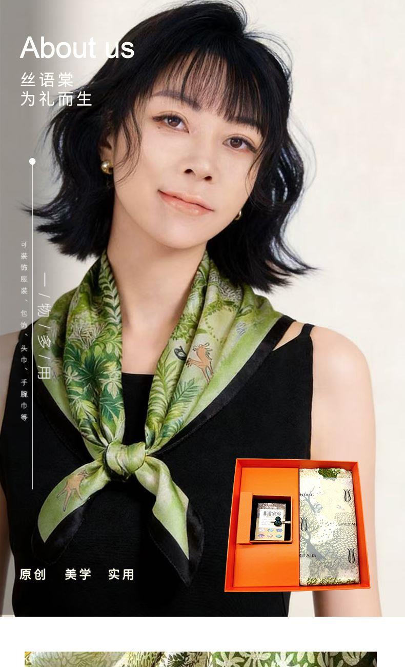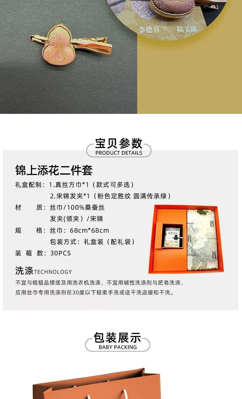 礼盒配制:1.真丝方巾*1(款式可多选) 2.宋锦发夹*1(粉色定胜纹/圆满绿) 材质:丝巾/桑蚕丝 发夹(领夹)/宋锦 规格:丝巾:68cm*68cm 包装方式:礼盒装(配礼袋)