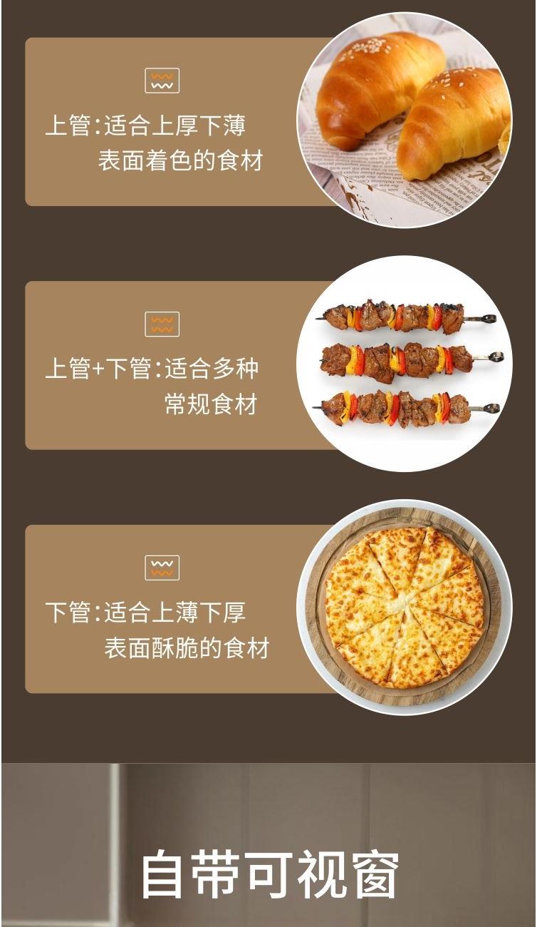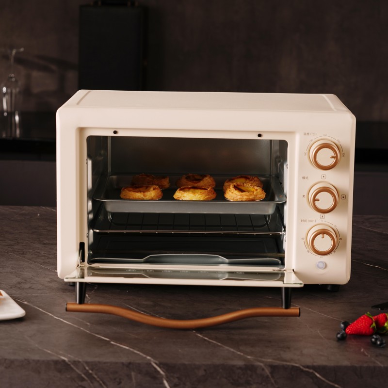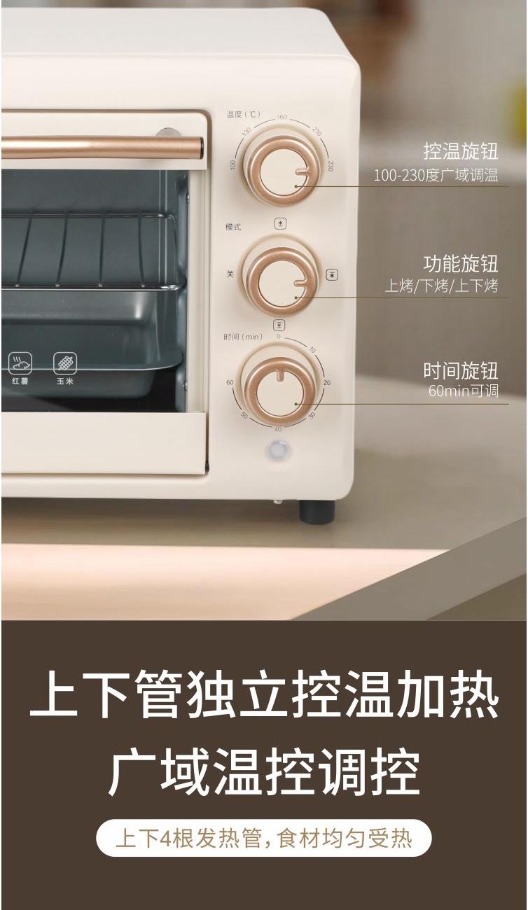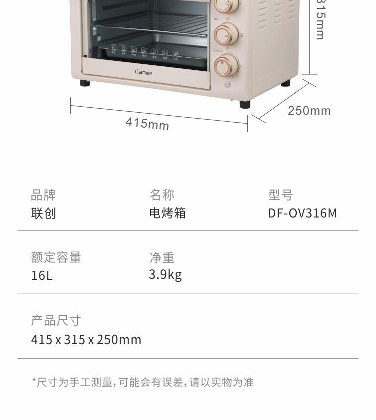 产品参数 额定功率:1300W 额定容量:16L 产品特点 1、16L容量,立体烘焙,三旋钮便捷调控 2、上下管独立控温加热,广域温控调控 3、内置三层烤位,多层抽屉卡槽位置可调节 4、自带可视窗烘焙全程,尽收眼底,可查看烹饪情况,美味不翻车