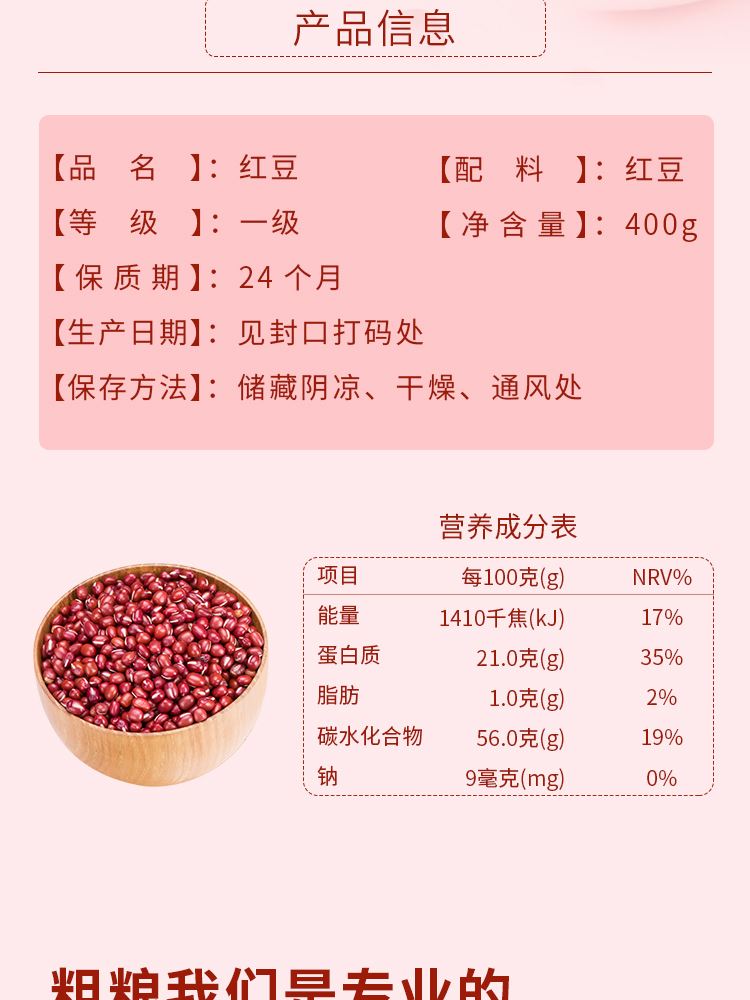 注:该产品二盒起发! 配料:红豆 净含量:400g 等级:一级 保质期:24个月