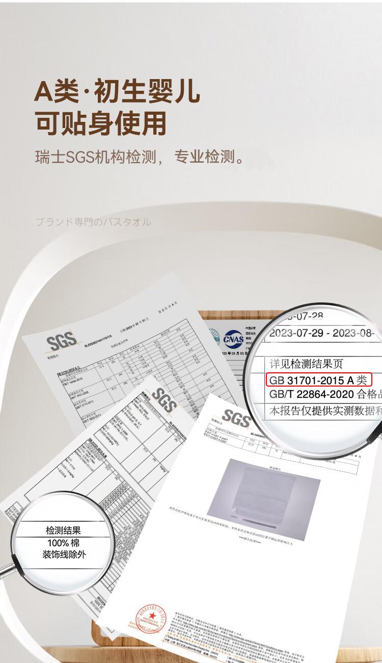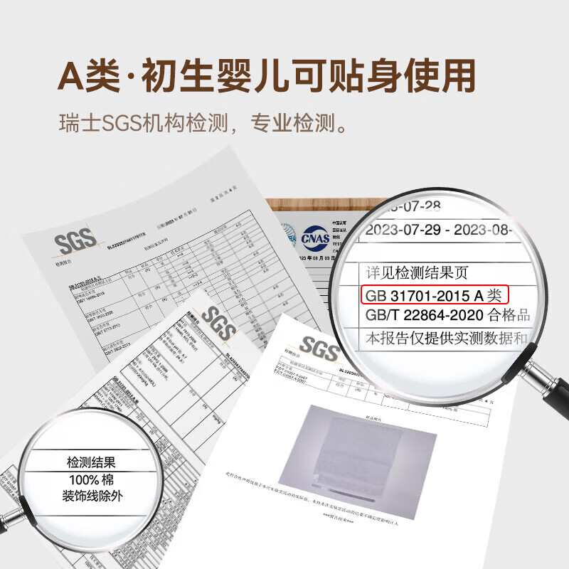 A类 · 婴幼儿可用标准, 通过瑞士SGS机构检测认证 安全环保:无甲醛、无芳香胺、 零添加荧光剂,PH安全值