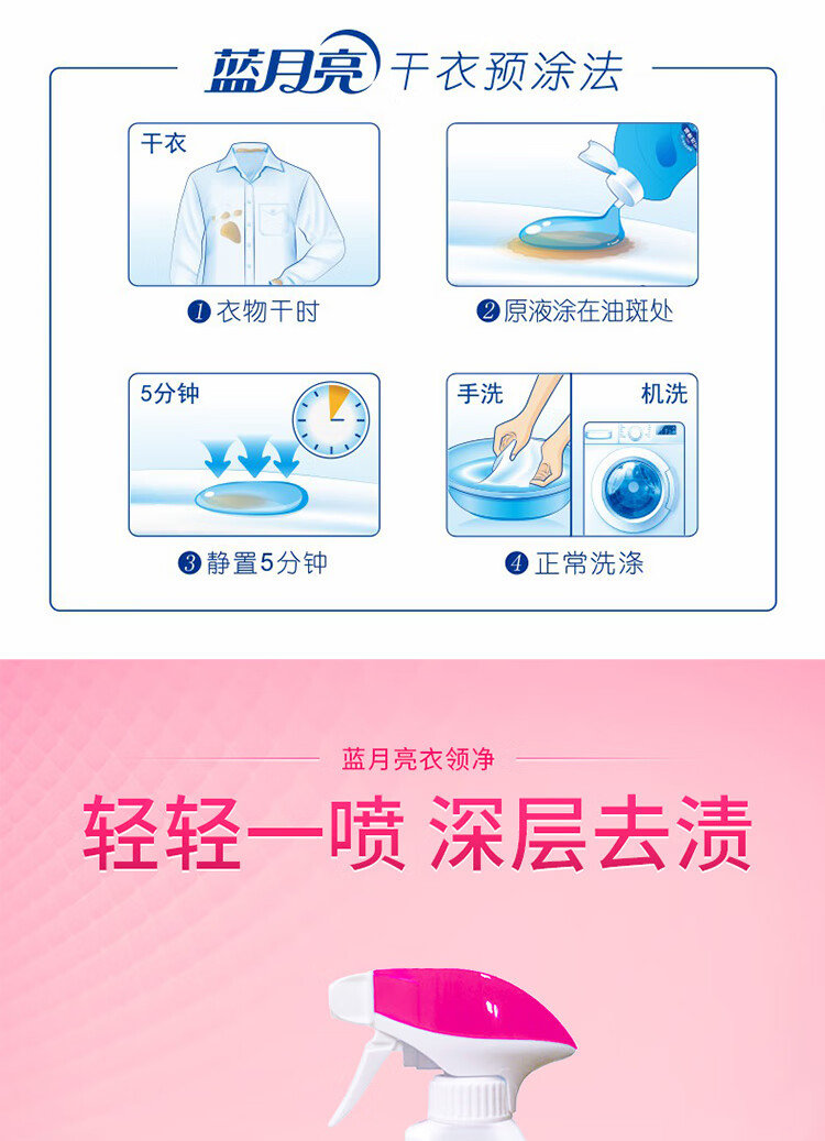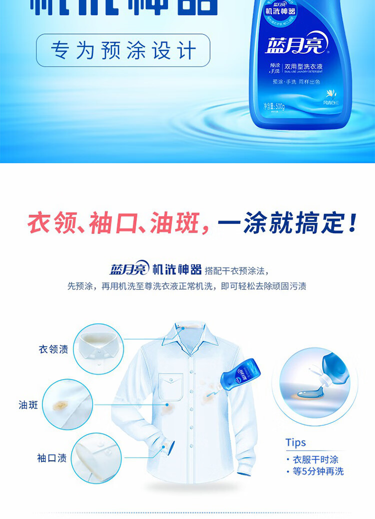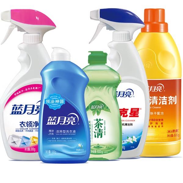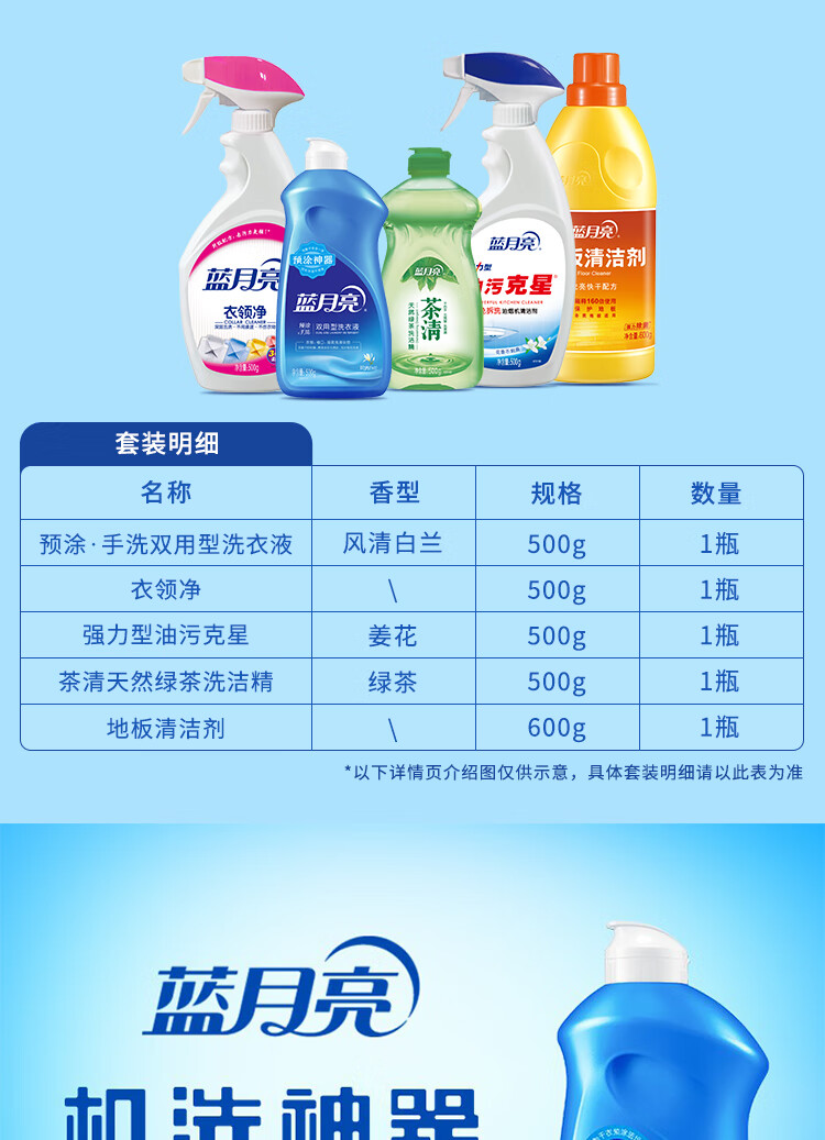 蓝月亮预涂手洗双用型洗衣液 500g×1 蓝月亮衣领净 500g×1 蓝月亮强力型油污克星 500g×1 蓝月亮绿茶茶清洗洁精 500g×1 蓝月亮地板清洁剂 600g×1 单品发货 自行组装
