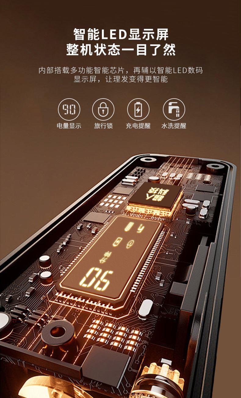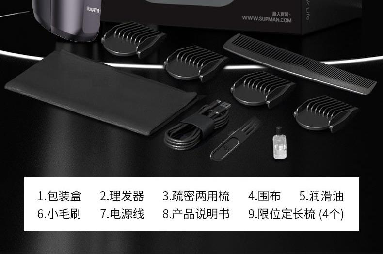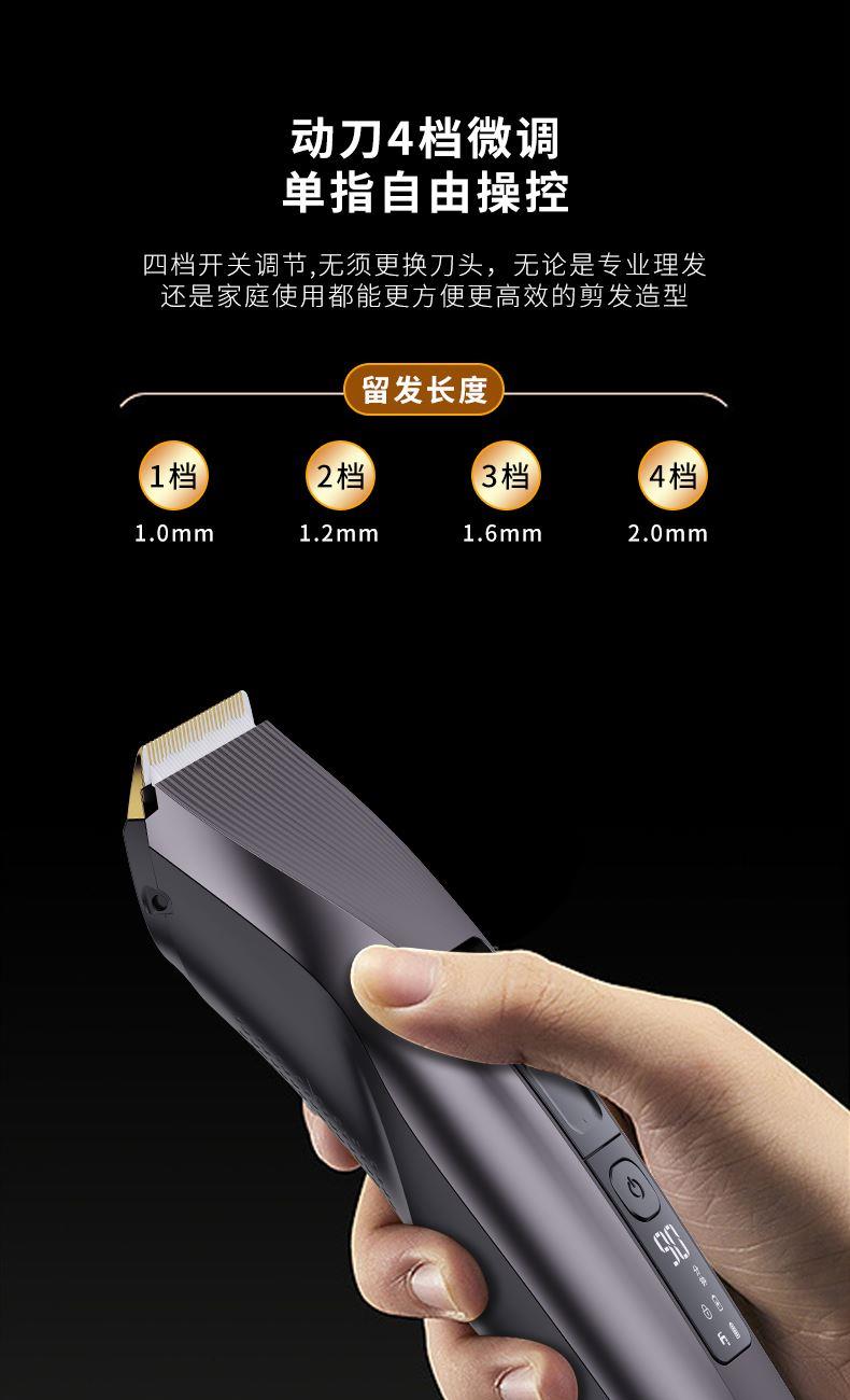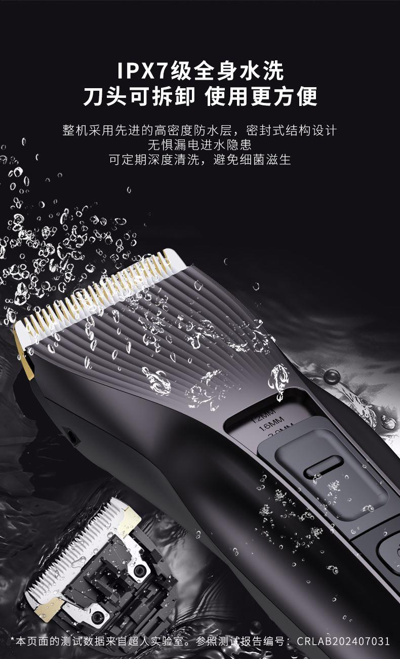 产品尺寸:178x47x45mm 彩盒尺寸:145x80x202mm 包装清单:1.包装盒 2.理发器 3.疏密两用梳 4.围布 5.润滑油 6.小毛刷 7.电源线 8.产品说明书 9.限位定长梳 (4个) 钛金陶瓷刀头,配置4个限位梳,动刀调节设计 IPX7级全身水洗,高转速电机马达 高性能锂电池,Type-C充电接口,即插即用,2-3小时充电,使用时长>90分钟 智能旅行锁,水洗提醒,充电提醒,智能LED数码显示屏,智能防夹发 功率:10W