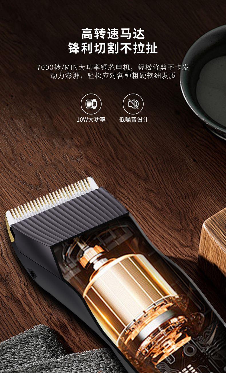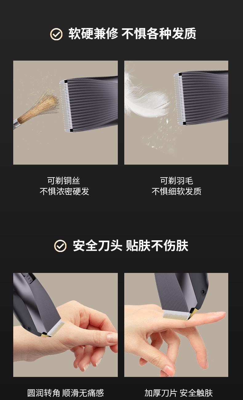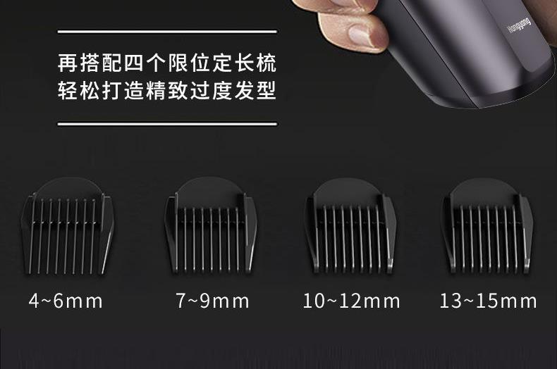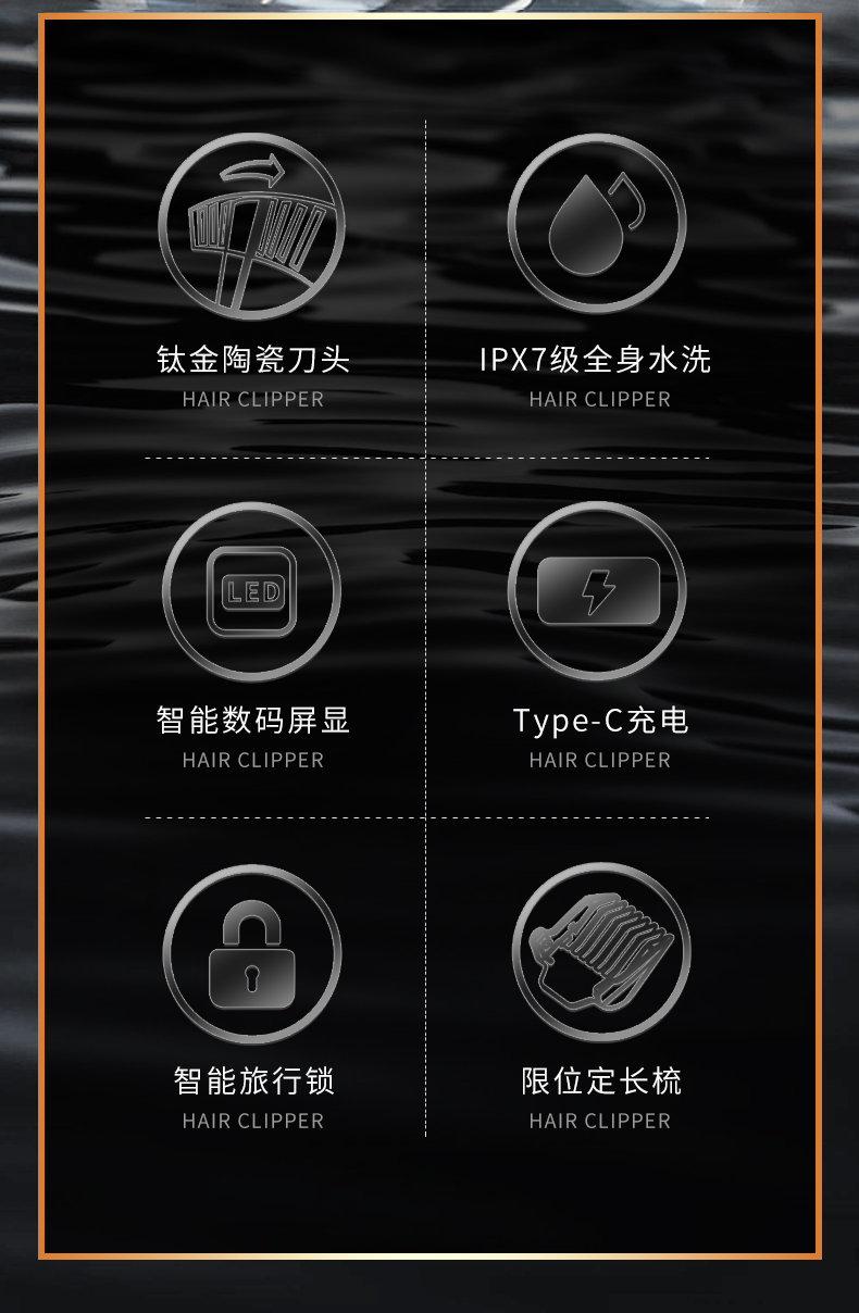 产品尺寸:178x47x45mm 彩盒尺寸:145x80x202mm 包装清单:1.包装盒 2.理发器 3.疏密两用梳 4.围布 5.润滑油 6.小毛刷 7.电源线 8.产品说明书 9.限位定长梳 (4个) 钛金陶瓷刀头,配置4个限位梳,动刀调节设计 IPX7级全身水洗,高转速电机马达 高性能锂电池,Type-C充电接口,即插即用,2-3小时充电,使用时长>90分钟 智能旅行锁,水洗提醒,充电提醒,智能LED数码显示屏,智能防夹发 功率:10W