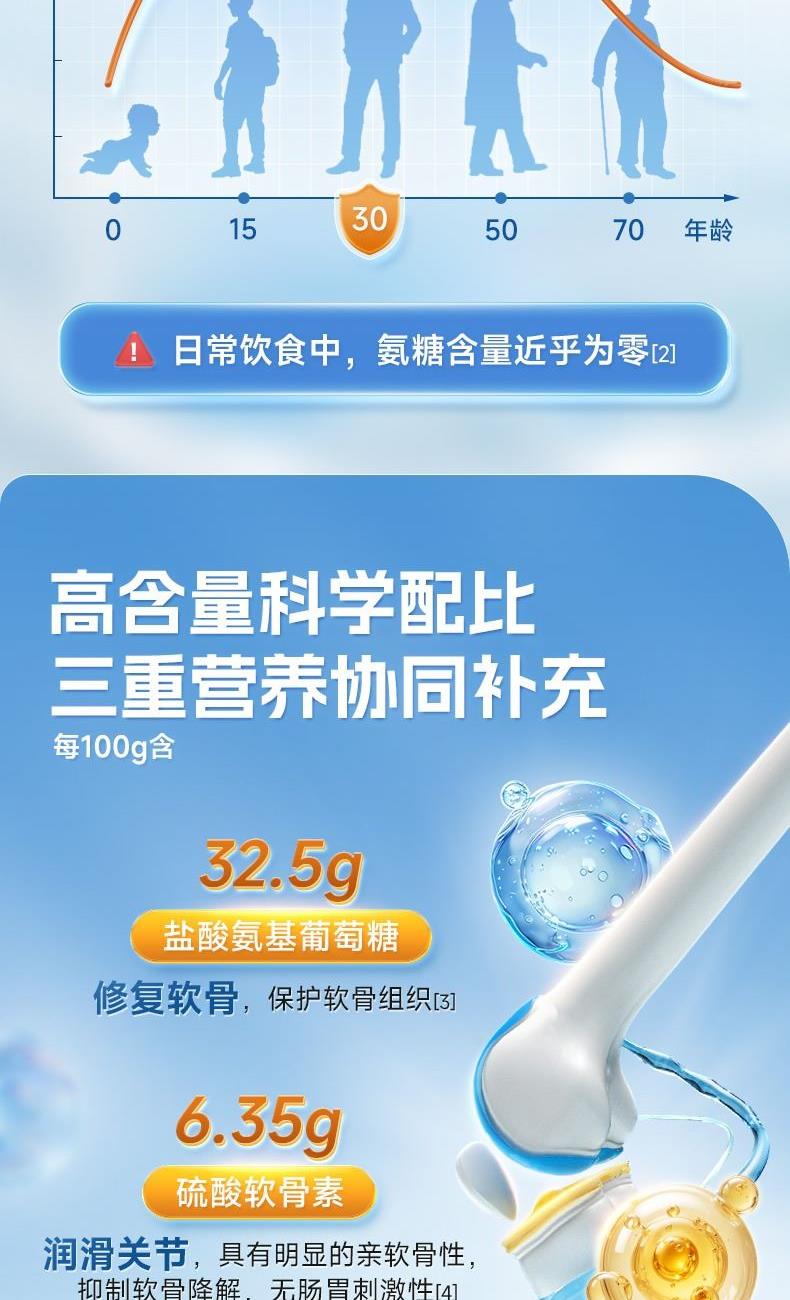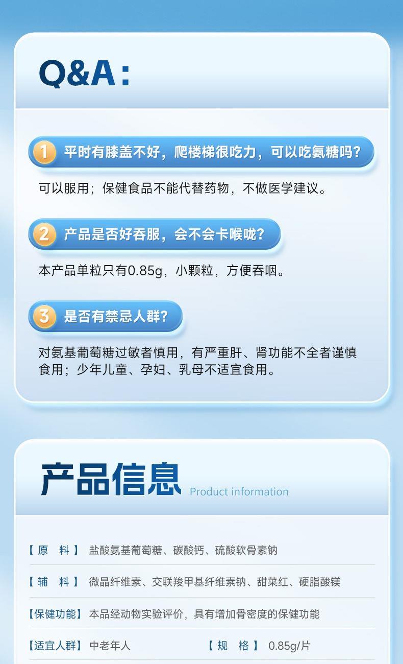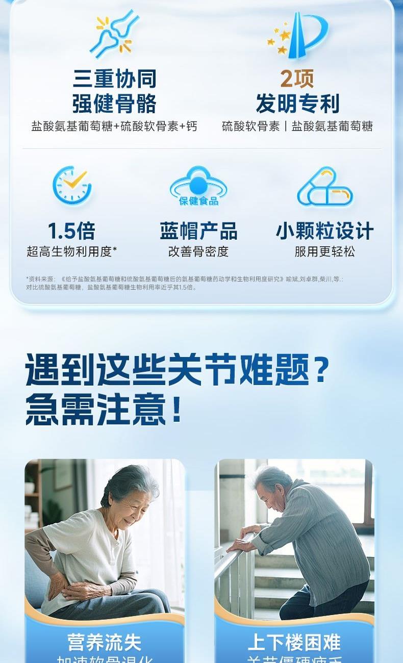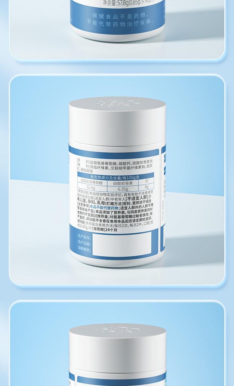 0.85g/片*68片*1 三重营养协同强健骨骼:盐酸氨基葡萄糖+硫酸软骨素+钙 2项发明、1.5倍超高生物利用度 颗粒小巧精致顺滑入喉,食用轻松