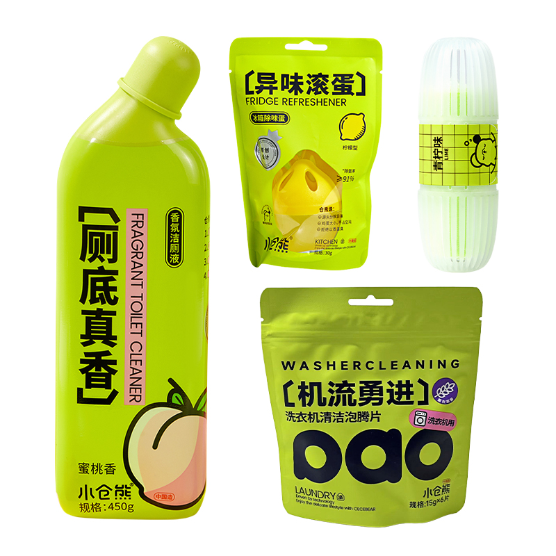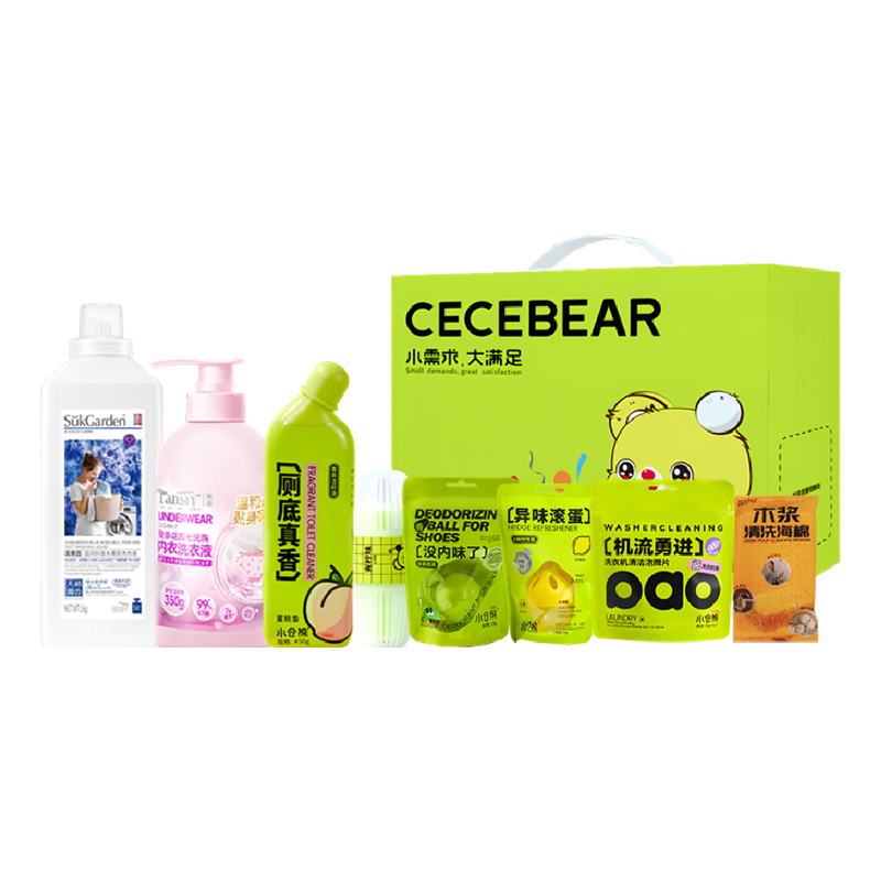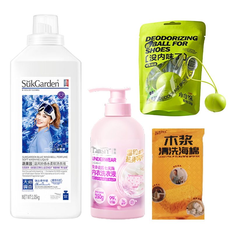 SukGarden蔬果园蓝风铃香水柔软洗衣1050g Tansiy唐茜莫奈花园七元酶内衣洗衣液350g 小仓熊香氛洁厕液(蜜桃香)450g 小仓熊冰箱除味蛋-柠檬30g 小仓熊马桶挂篮-(单个装)50g 小仓熊洗衣机清洁泡腾片15g*6颗 小仓熊除臭鞋球12g 赠:Sckoes诗寇丝木浆清洗海绵1块 小仓熊甄选礼盒(265*95*270mm)