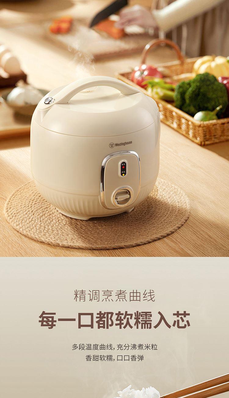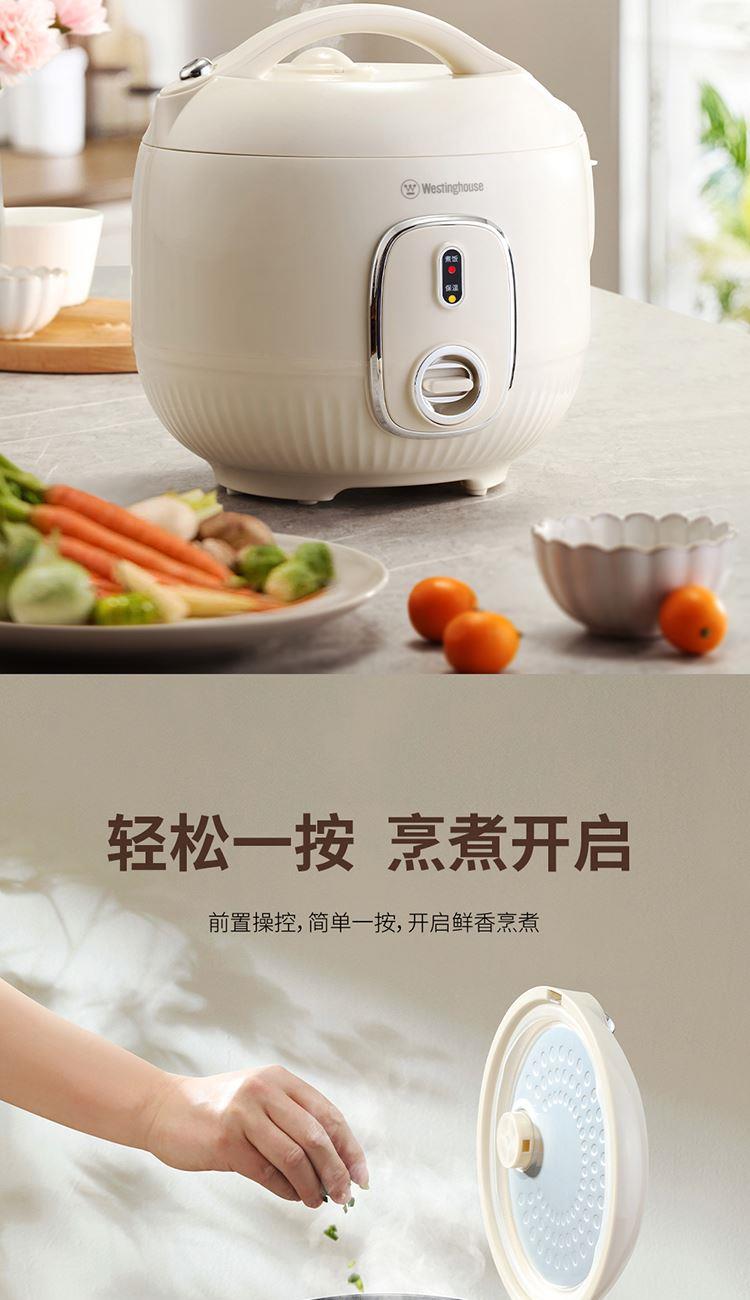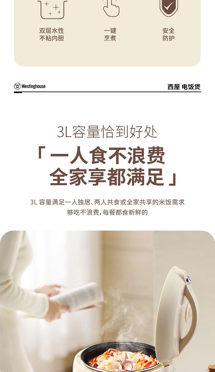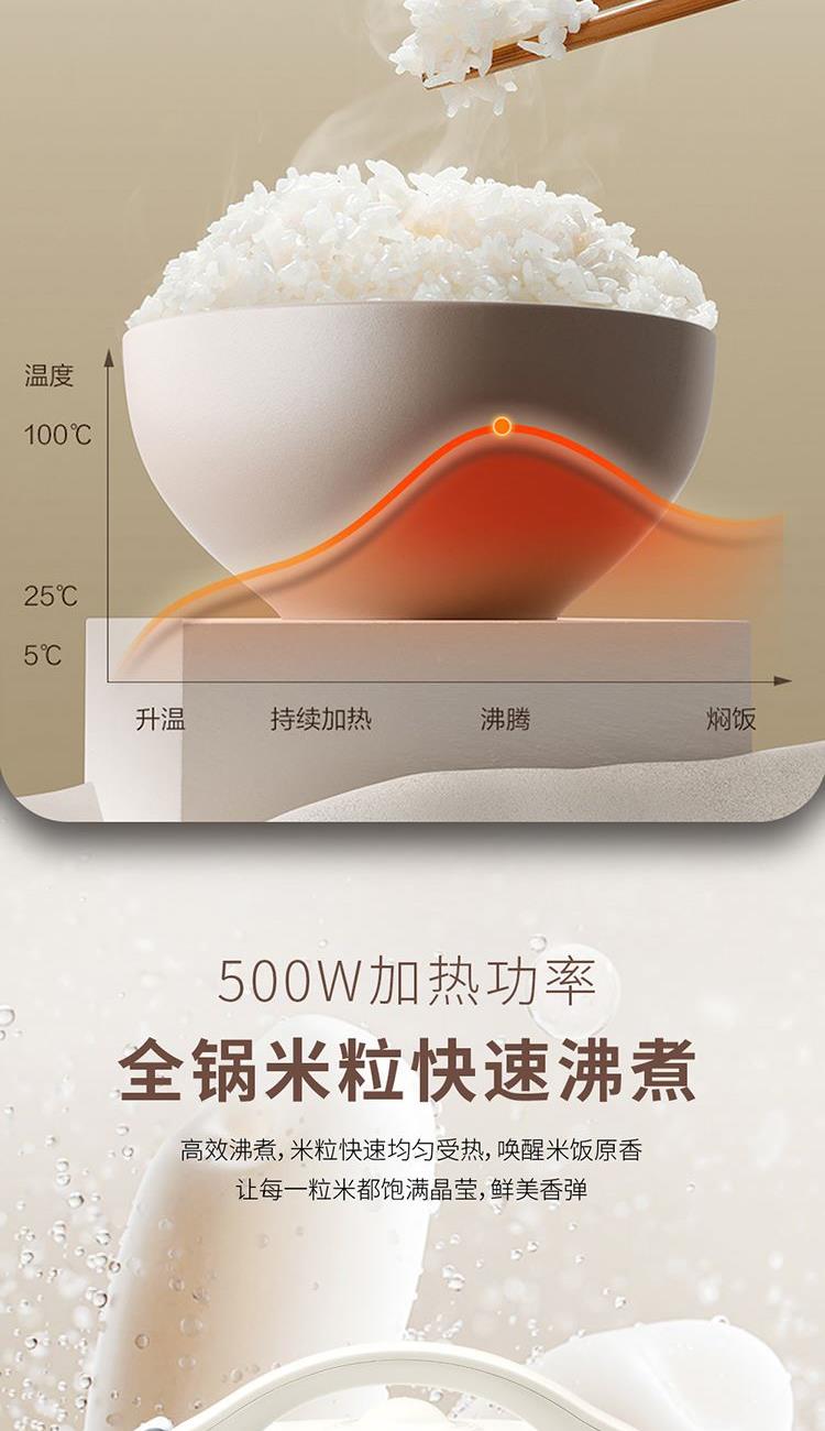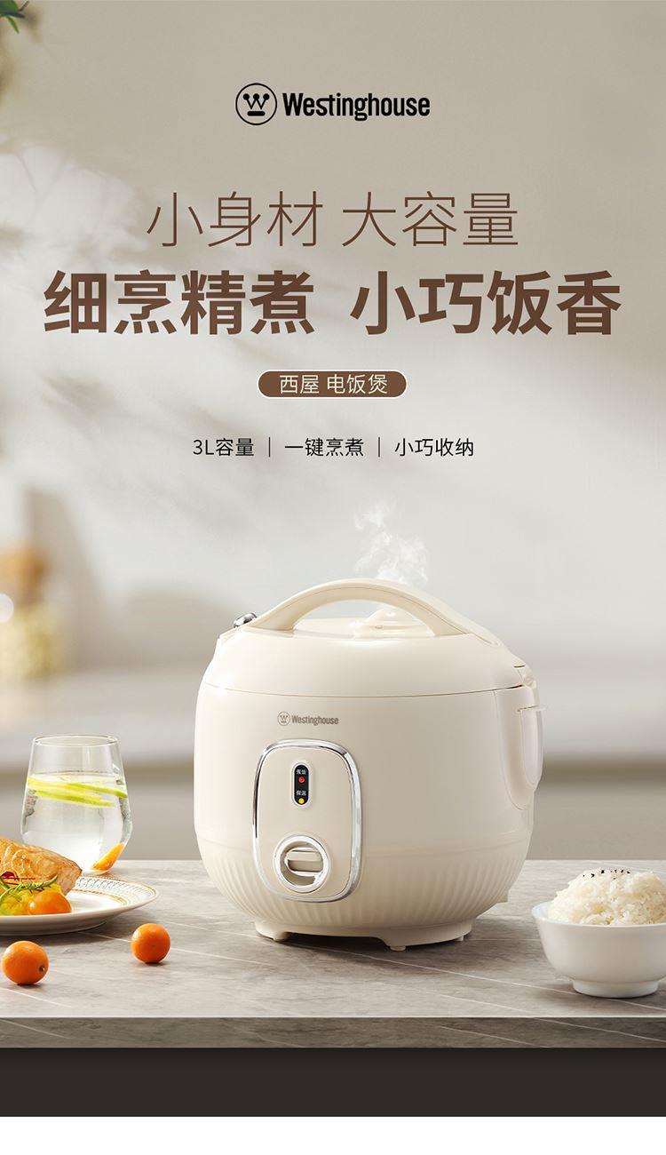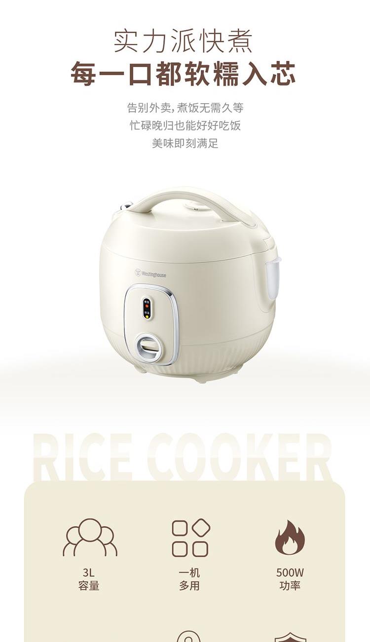 产品规格: 额定电压:220V~50Hz 额定功率:500W 额定容量:3L 内胆材质:铝合金 操作方式:按键式 配件:量杯、电源线、饭勺、蒸笼 产品特点: 3L容量,圆润小身材,不占地,易收纳; 一键烹煮,操作简单; 500W加热功率,高效沸煮,米粒受热均匀; 铝合金内胆,加热快,更健康; 双层锅身,隔热防烫; 可拆卸排气阀,方便清洗