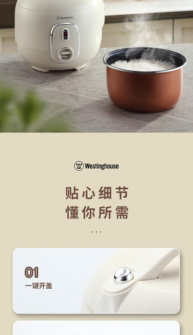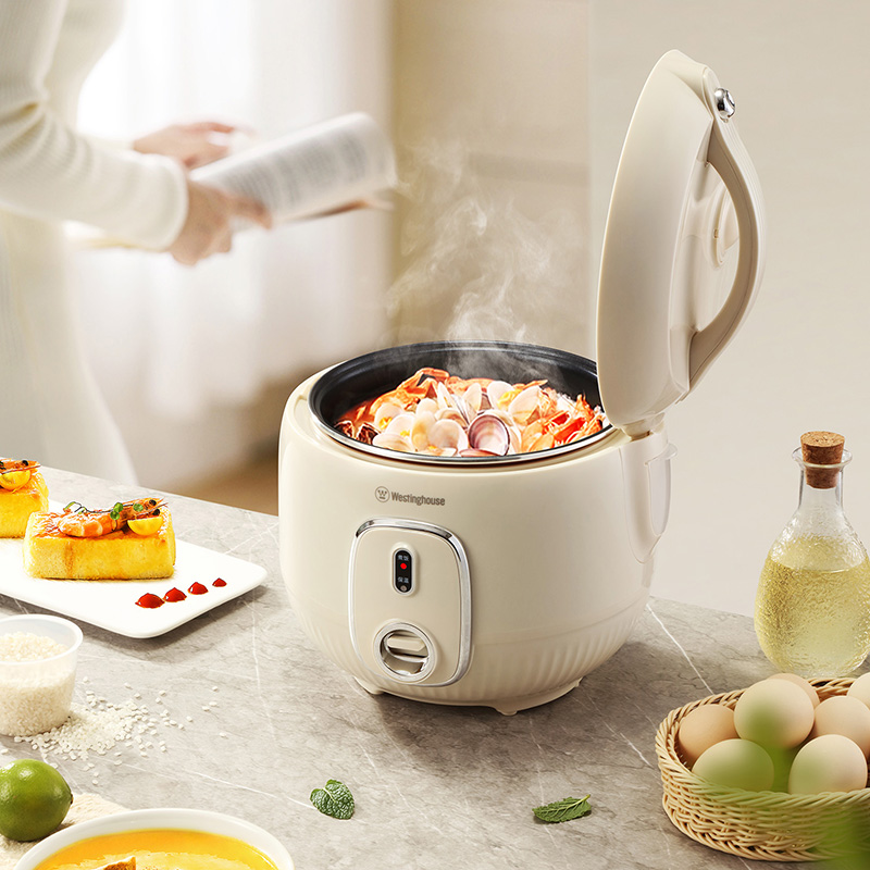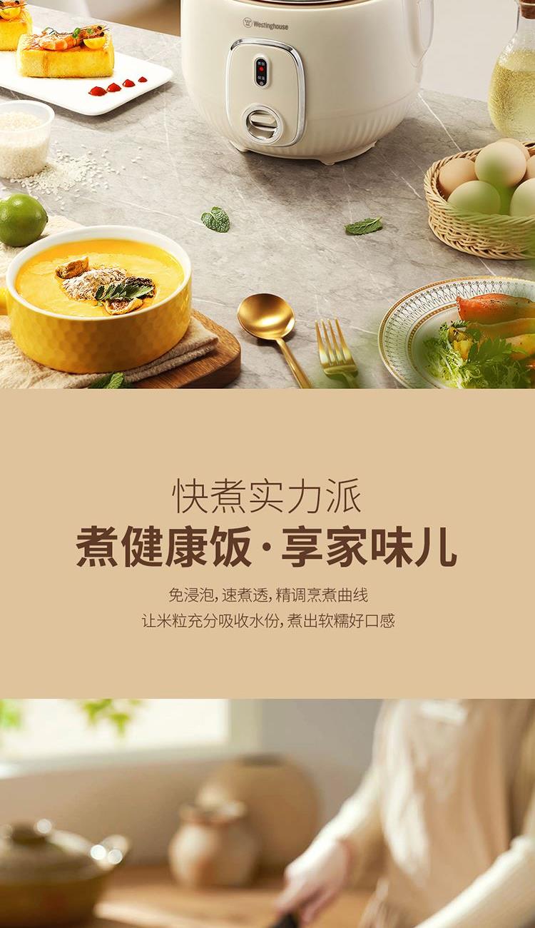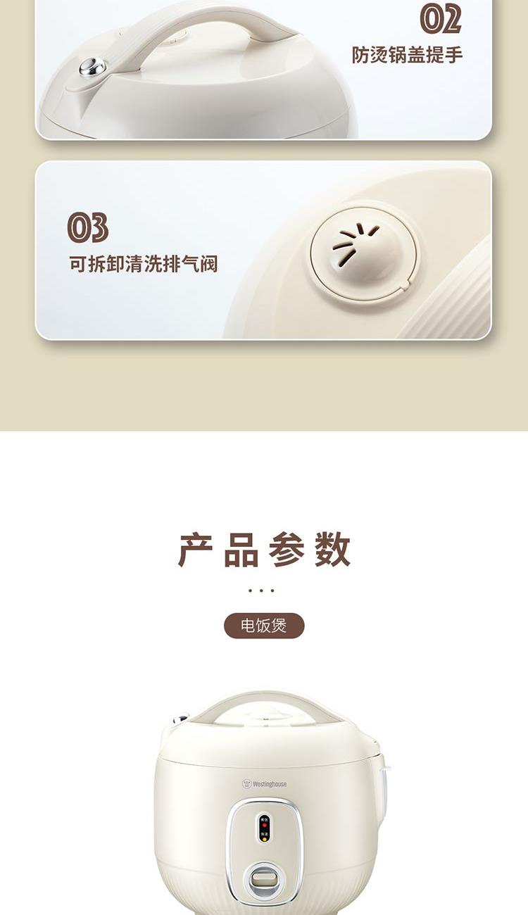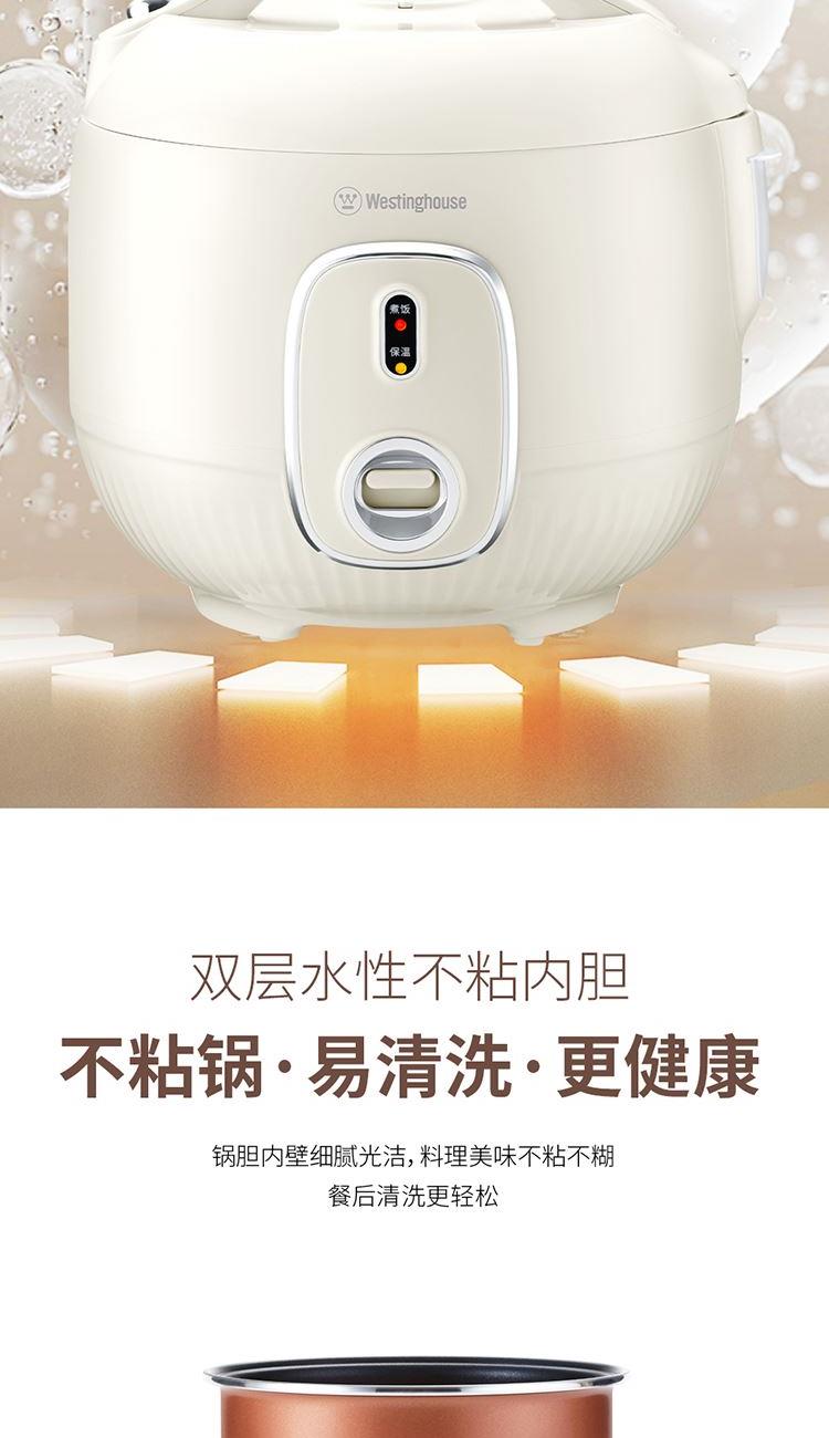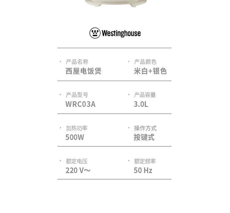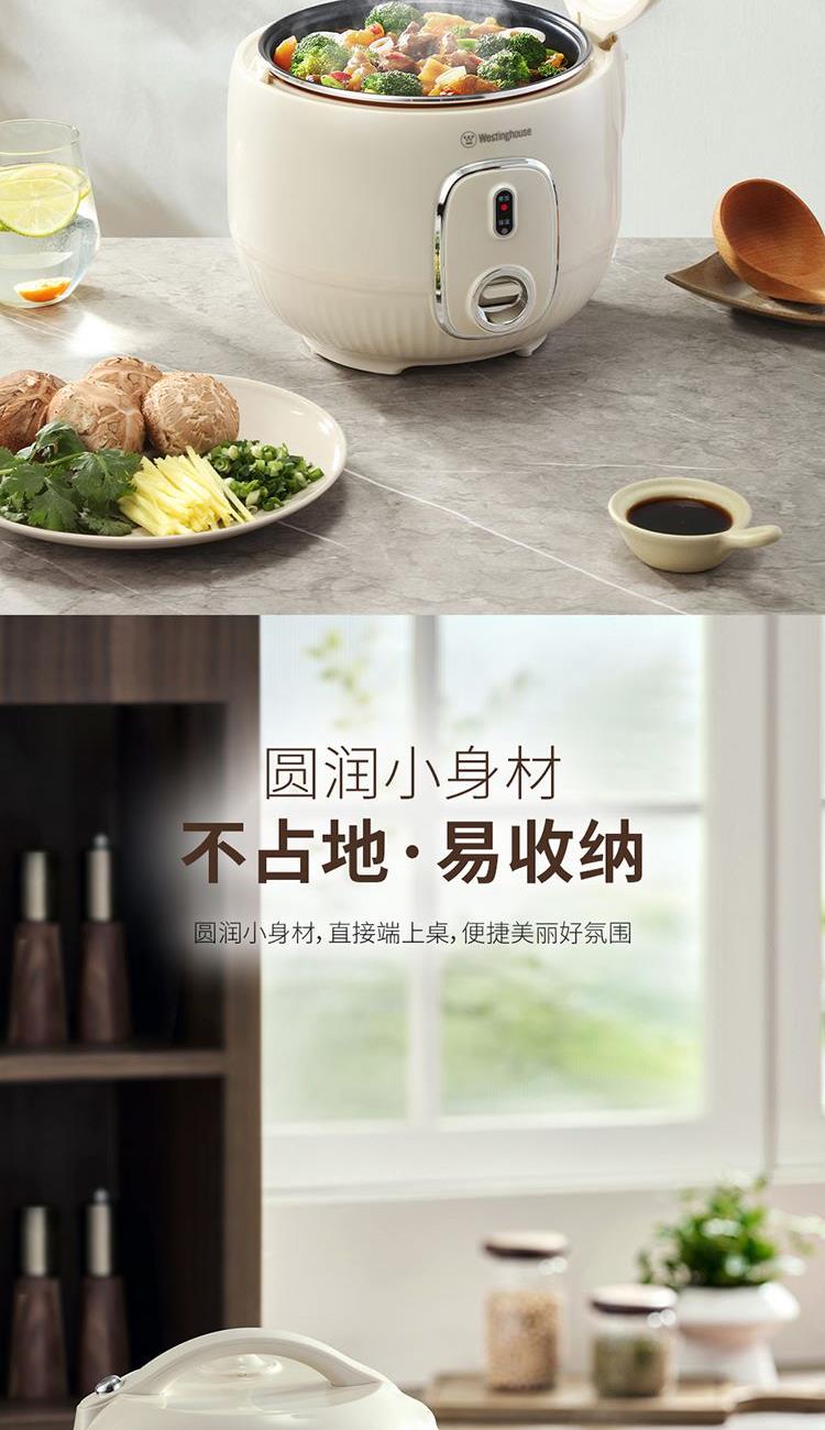 产品规格: 额定电压:220V~50Hz 额定功率:500W 额定容量:3L 内胆材质:铝合金 操作方式:按键式 配件:量杯、电源线、饭勺、蒸笼 产品特点: 3L容量,圆润小身材,不占地,易收纳; 一键烹煮,操作简单; 500W加热功率,高效沸煮,米粒受热均匀; 铝合金内胆,加热快,更健康; 双层锅身,隔热防烫; 可拆卸排气阀,方便清洗