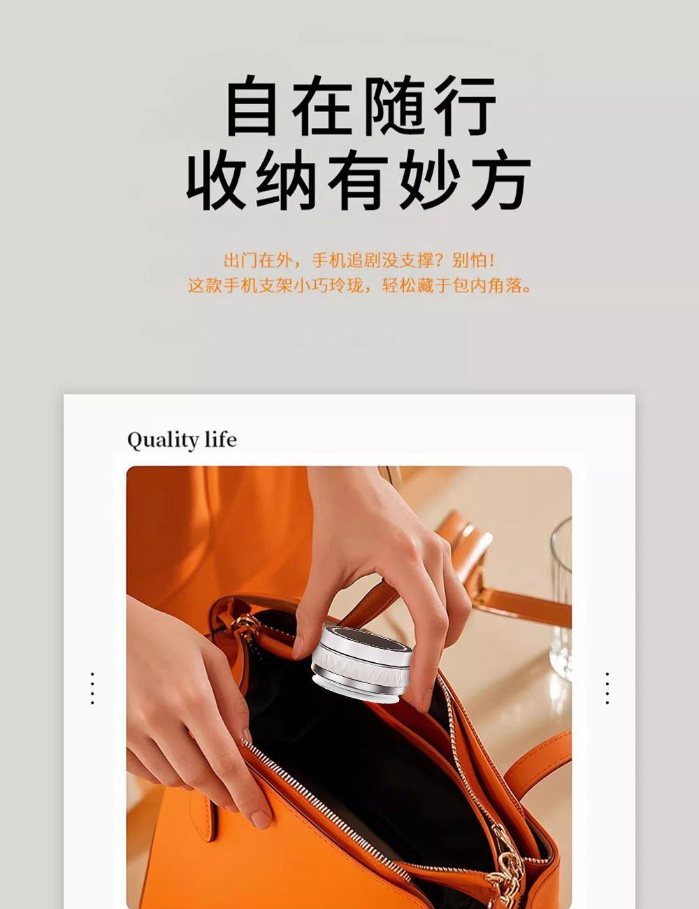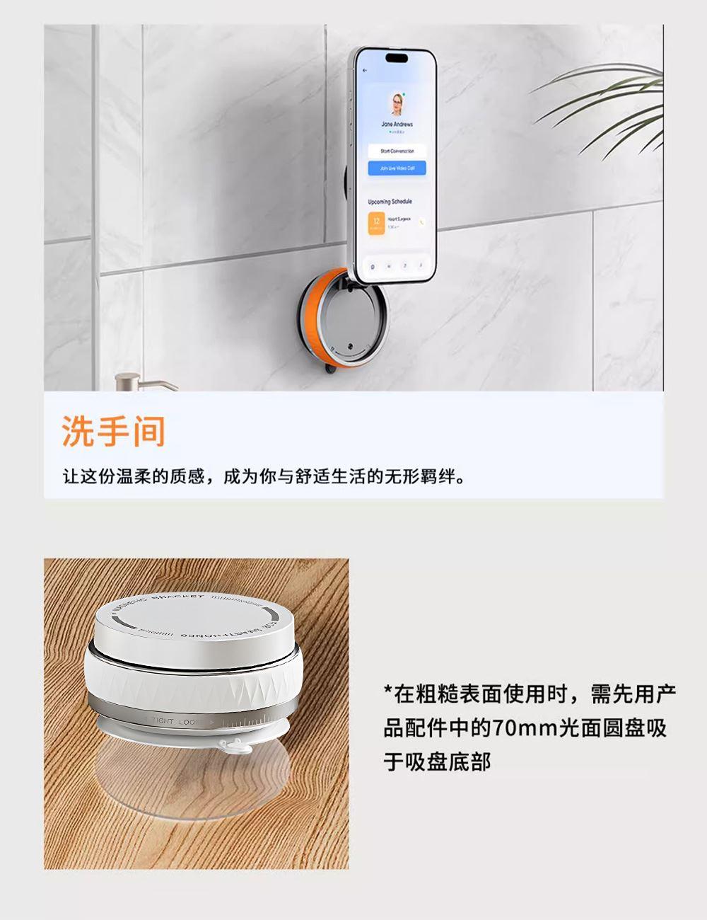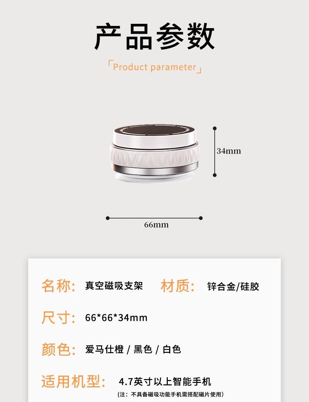 颜色:黑色/白色 材质:锌合金/硅胶 适用:4.7英寸以上手机 注:不具备磁吸功能手机需搭配磁片使用 使用场景:床头、桌面、车载,玻璃门等 产品尺寸:66*66*34mm 包装尺寸:86x50x86mm 整箱数量:100/箱 产品重量:92g