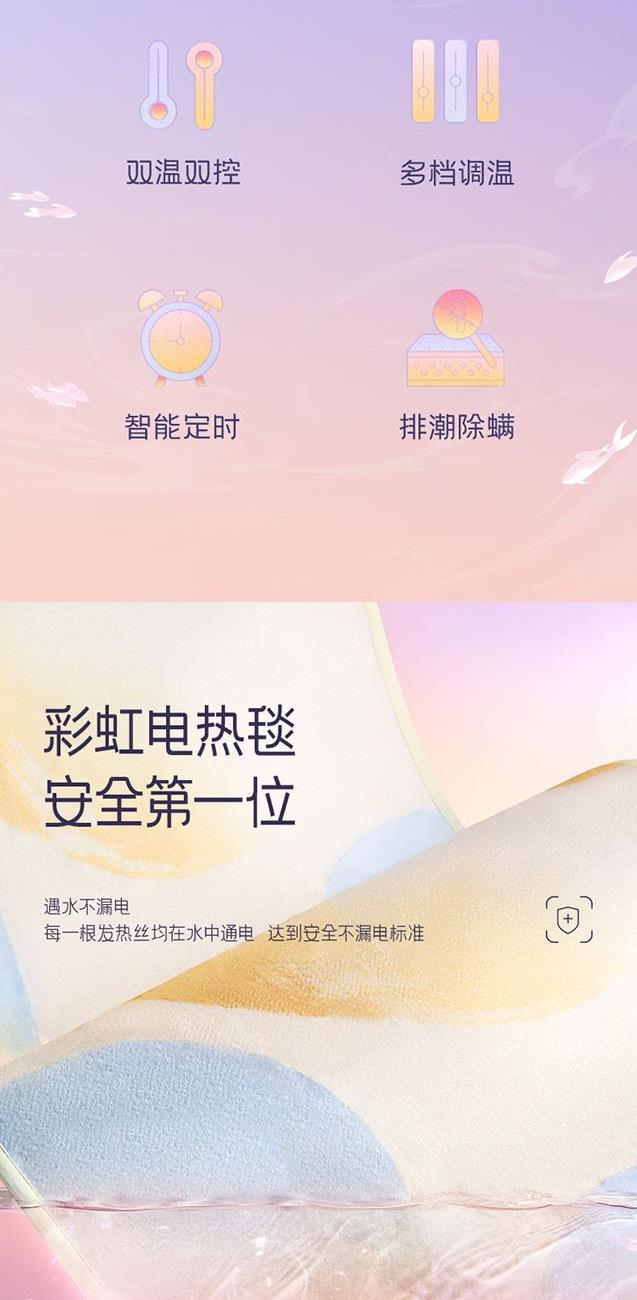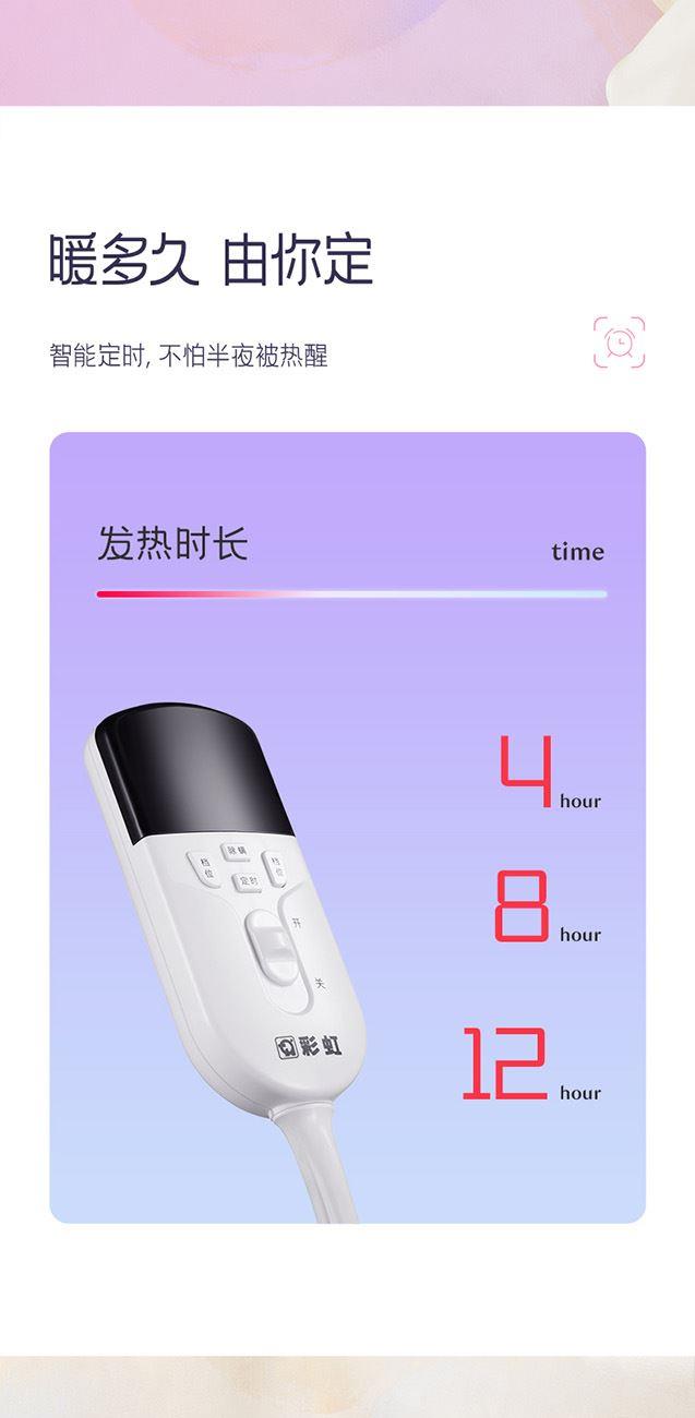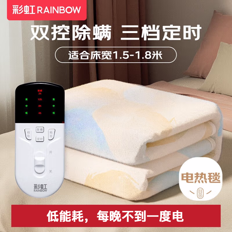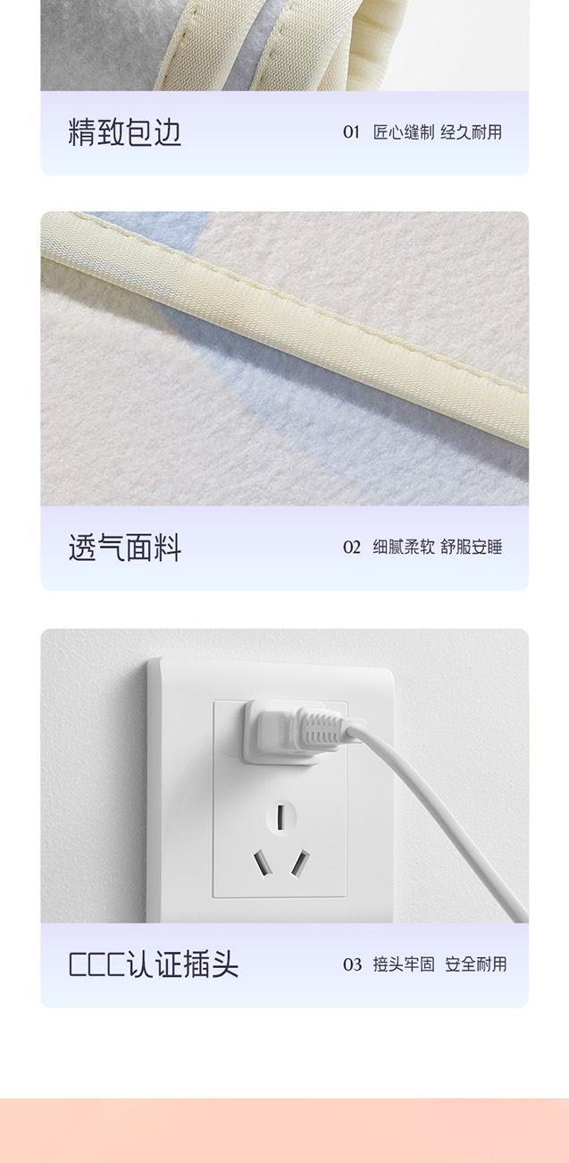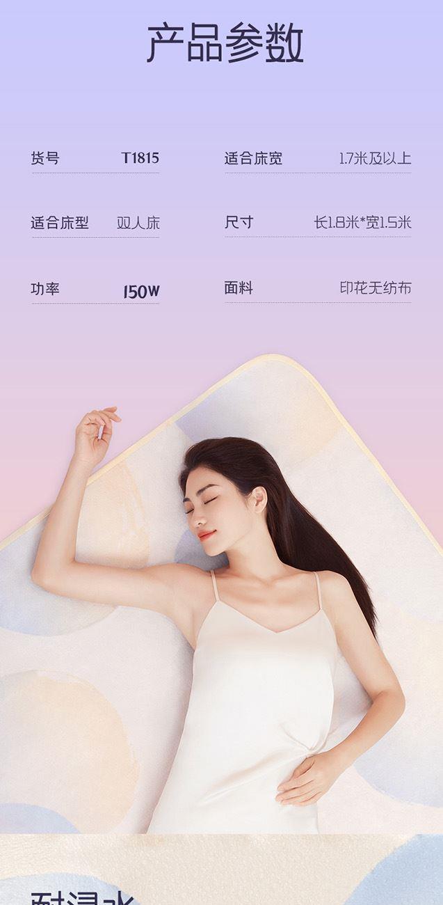 参数: 型号:TT180×150-10XB 功率:150W 功能:高、中、低温三档调节,一键除螨,排潮除湿。 开关:双控双温,可定时。 面料:化纤 包装:彩盒 卖点: 1、多档定时控制 2、左右独立温控 3、一键安全除螨,2小时自动停止加热 4、全线路安全保护,助力安心好眠 5、排潮除湿,四季可用 6、低能耗,每晚不到1度电