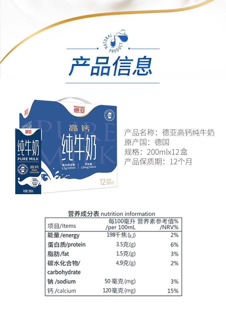 德亚高钙纯牛奶200ml*12(礼盒)