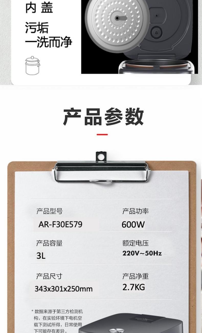 产品型号:AR-F30E579 产品规格:3L/600W 产品尺寸:343*301*250mm 产品净重:2.7KG 额定电压:220V-50HZ 1、精铸发热盘,煮饭不粘锅; 2、魔方造型,金属机身。 3、可拆内盖,方便清洗。 4、蒸煮两用,1.5mm不粘内胆。 5、七大功能,随心挑选。