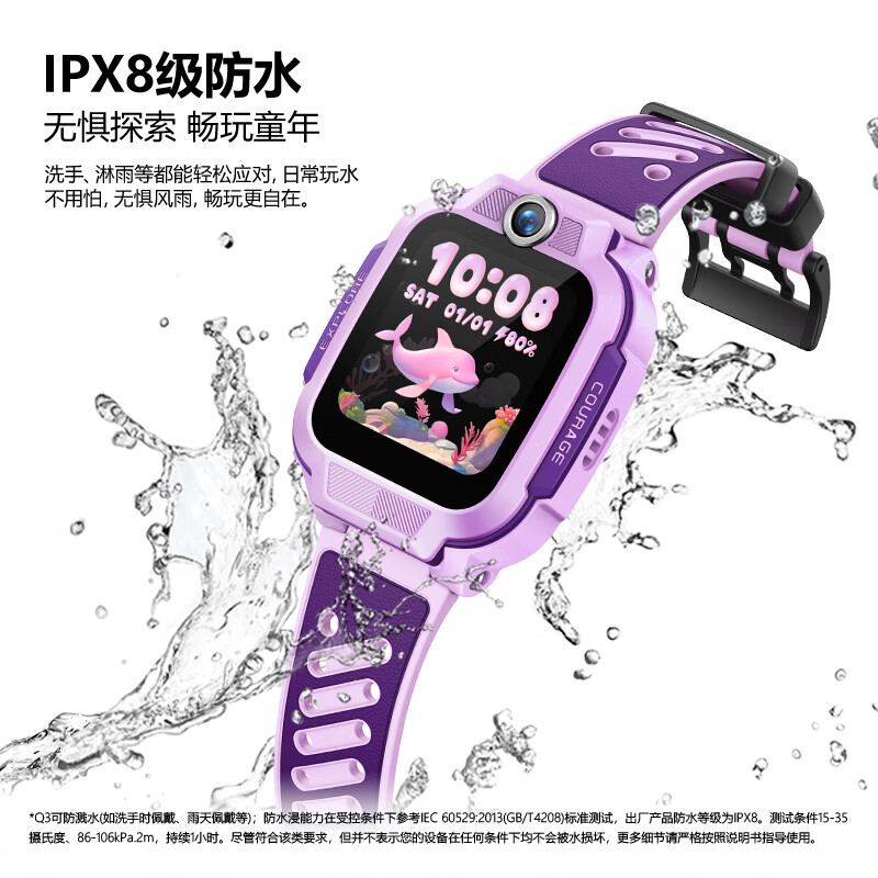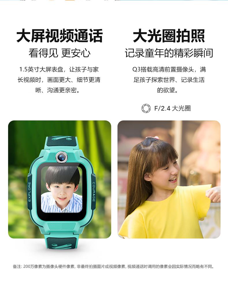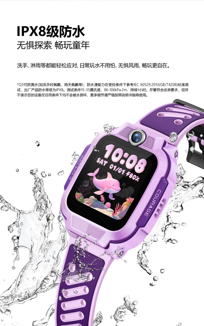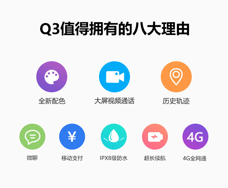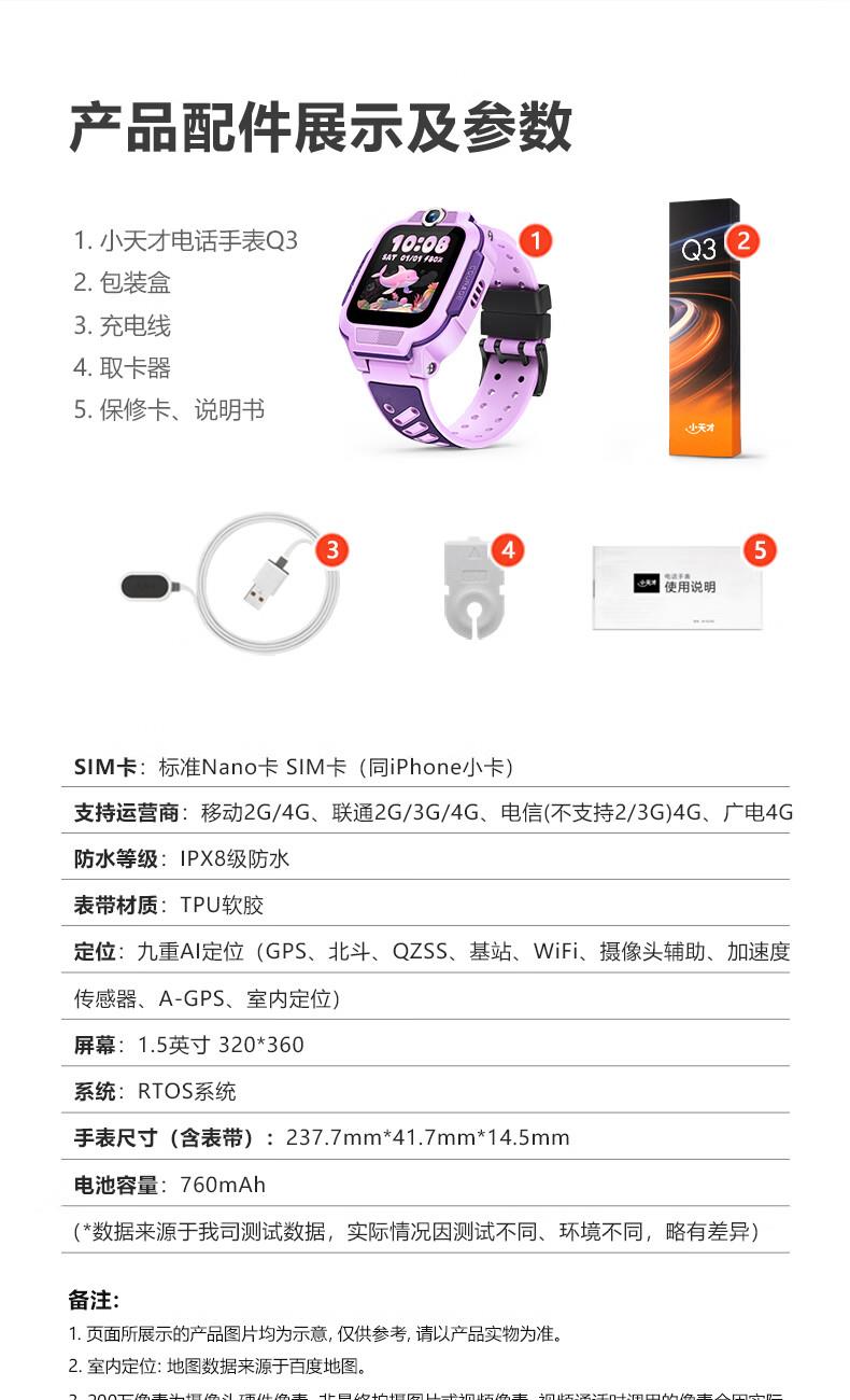 清单:Q3电话手表+充电线+取卡器+说明书+保修卡+包装盒 充电模式:磁吸式充电 屏幕尺寸:1.5英寸彩色屏幕 内存:0.25G+4G 屏幕分辨率:320x360像素;200万前置摄像头 电池容量:760mAh 防水:IPX8级 九重定位:GPS、北斗、QZSS、WiFi、基站、摄像头辅助,加速传感器、A-GPS、室内定位 记录七天天内的定位轨迹,支持全国4000多家大型商场、高铁站、飞机场定位(更多场所持续扩展中) 4G全网通:支持移动、联通、电信、广电卡 实时微聊:语音、文字微聊 移动支付:绑定支付零钱包 上课禁用;上学守护;WiFi联网;拒绝陌生电话、记步、睡眠模式等功能
