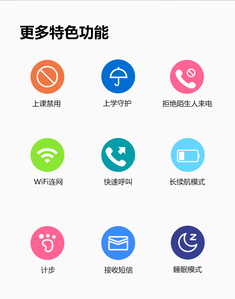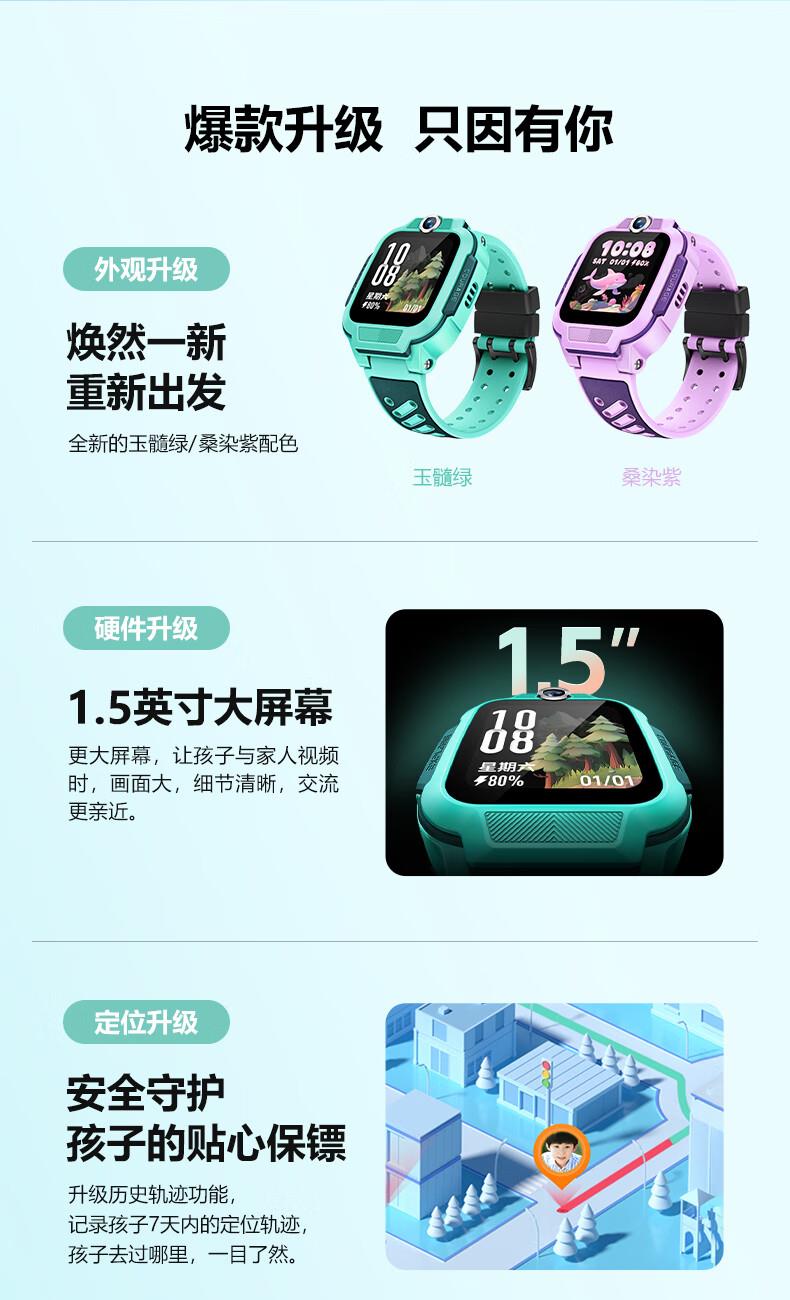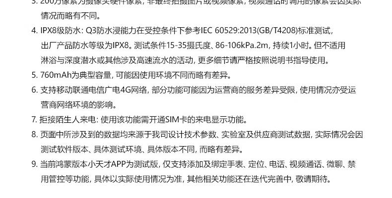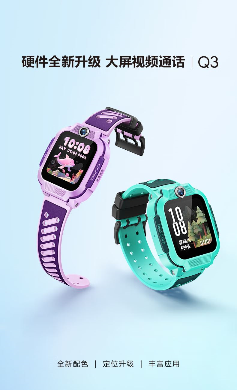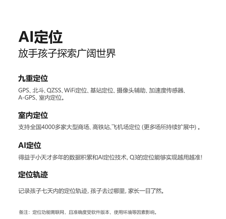 清单:Q3电话手表+充电线+取卡器+说明书+保修卡+包装盒 充电模式:磁吸式充电 屏幕尺寸:1.5英寸彩色屏幕 内存:0.25G+4G 屏幕分辨率:320x360像素;200万前置摄像头 电池容量:760mAh 防水:IPX8级 九重定位:GPS、北斗、QZSS、WiFi、基站、摄像头辅助,加速传感器、A-GPS、室内定位 记录七天天内的定位轨迹,支持全国4000多家大型商场、高铁站、飞机场定位(更多场所持续扩展中) 4G全网通:支持移动、联通、电信、广电卡 实时微聊:语音、文字微聊 移动支付:绑定支付零钱包 上课禁用;上学守护;WiFi联网;拒绝陌生电话、记步、睡眠模式等功能