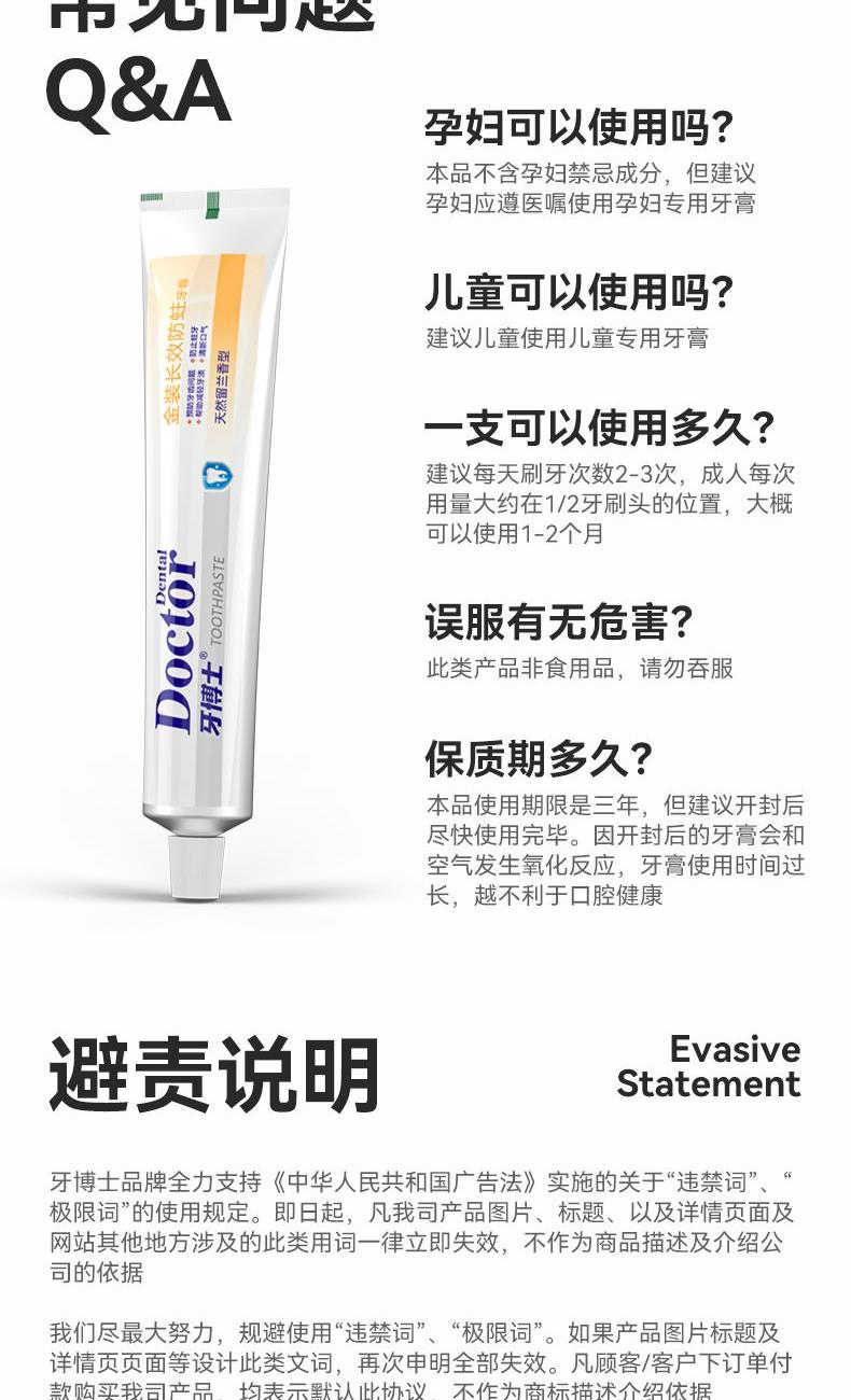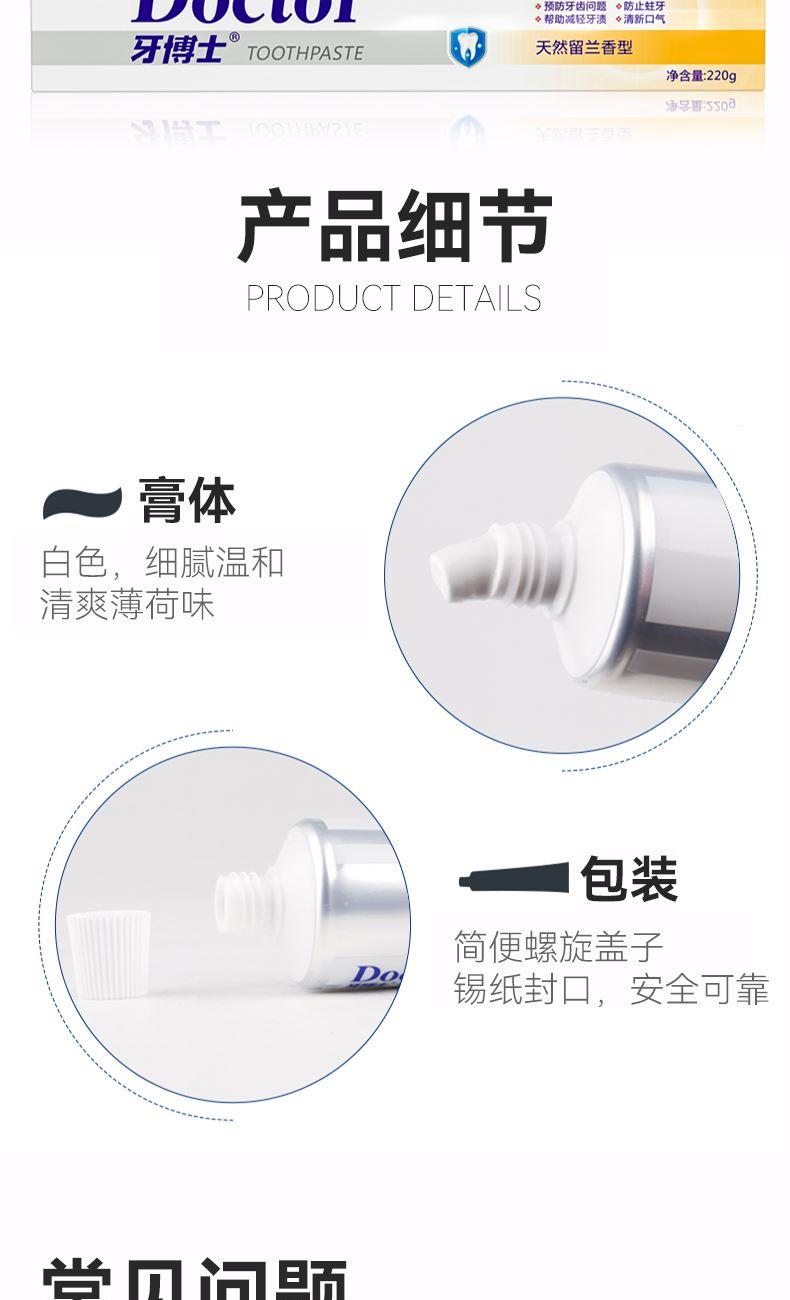 规格:220g 保质期:3年 产品卖点: 防龋健齿 坚固牙齿、减轻牙渍、清新口气