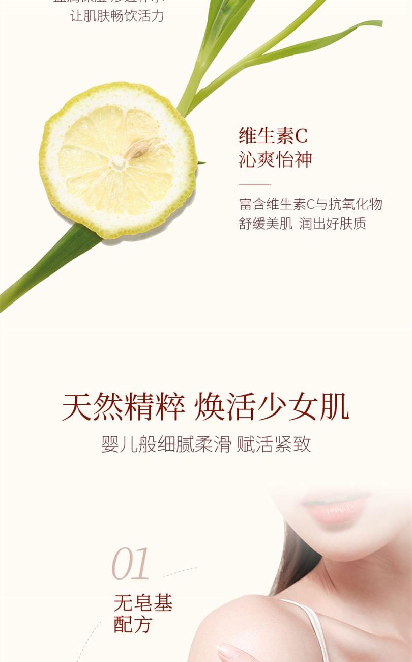 ● 适合肤质:大多数肤质 ● 主要功效:润肤保湿:植物精华,水润光滑; 留香更持久:小分子渗进肌肤留香达24小时 养护更滋润:补水又锁水、维持肌肤水油平衡