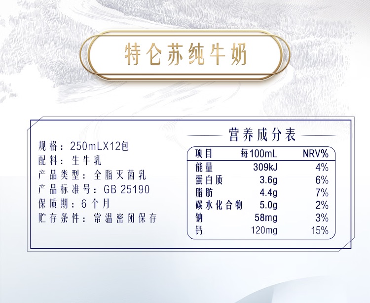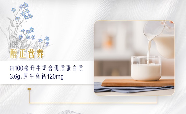 包装规格:12盒 脂肪含量:全脂 醇正营养 每100毫升牛奶含优质蛋白质3.6g,原生高钙120mg