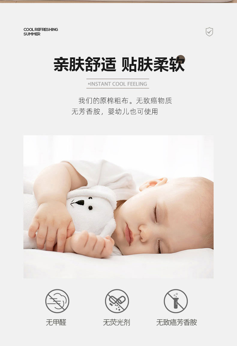 规格:180*200cm 枕套:48*74cm*2 面料:老粗布 执行标准:GB/T22796-2021 安全类别:GB18401-2010 B类 1.原棉老粗布是世代沿用的一种手工织布工艺,它以棉为原料,双线合股并织,质地柔软,手感佳,透气性好,凉而不冰,老少适宜。 2.可折叠收纳,透气性强 冰爽 丝滑 凉感 无睡痕 不夹发 光滑柔软 凉而不冰 此刻尽丝滑形