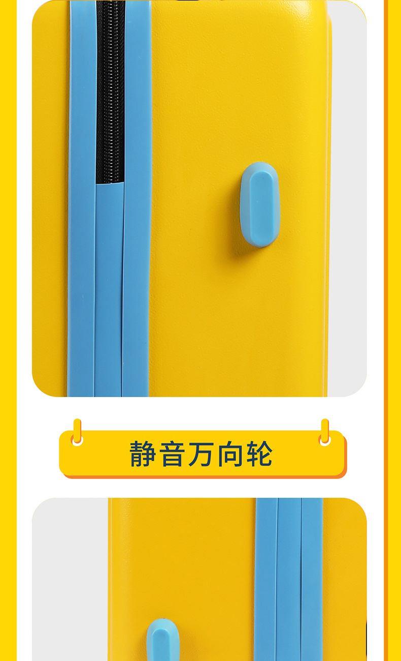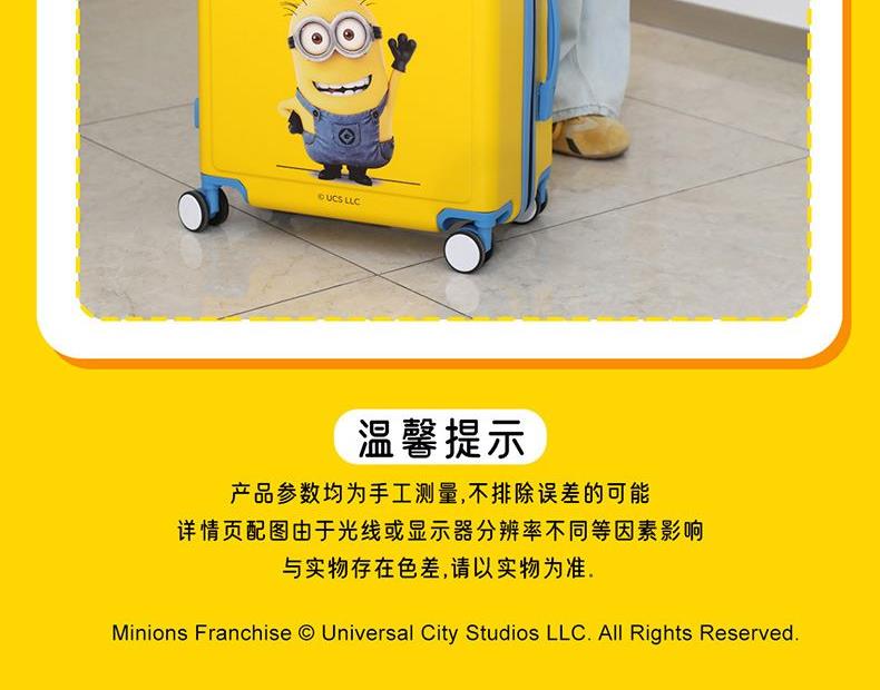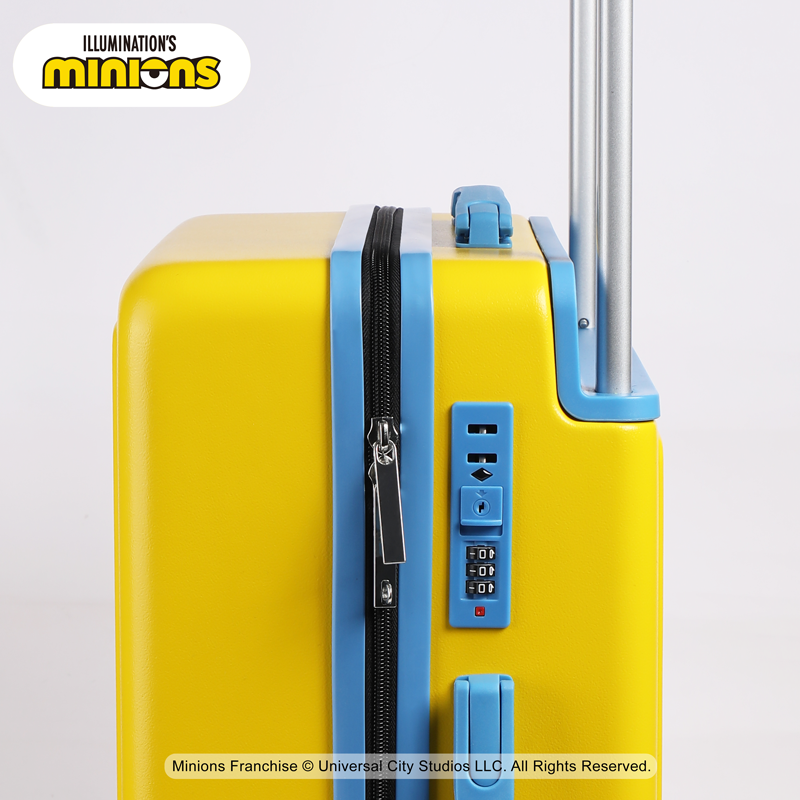 材 质:ABS磨砂纹 产品尺寸:56.5*44*24CM 包装尺寸:57.5*45*25CM 产品净重:3.38KG 整箱重量:4.23KG 萌力全开,小黄人陪你行天下 遇见小黄人,遇见无限欢乐 轻便耐用,旅行好帮手,轻盈而坚固,让你在旅途中毫无负担 静音万向轮,滑行无声更省心 先进的密码锁系统, 安全可靠,守护你的每一段旅程 不仅是行李箱,更是时尚单品