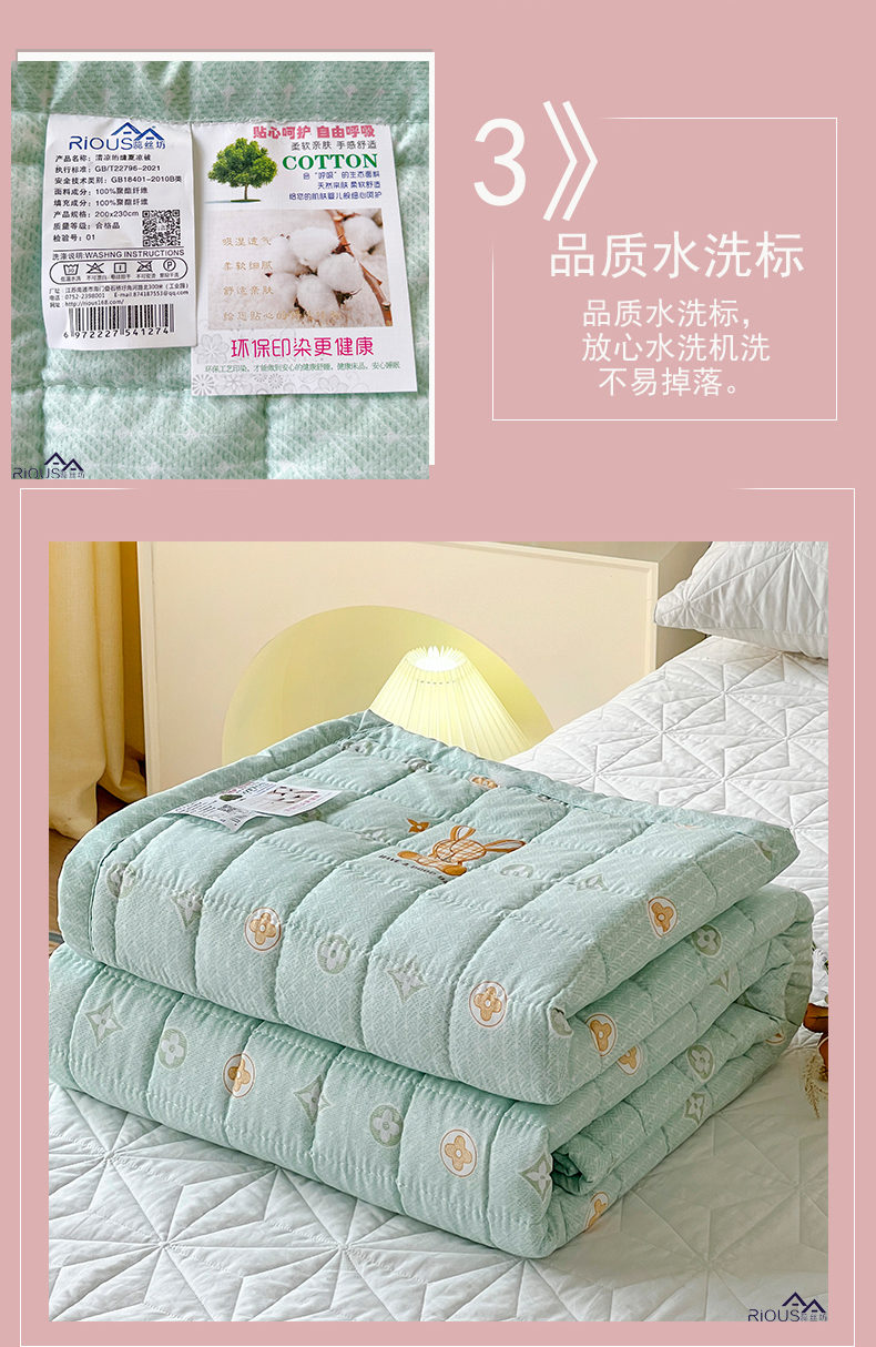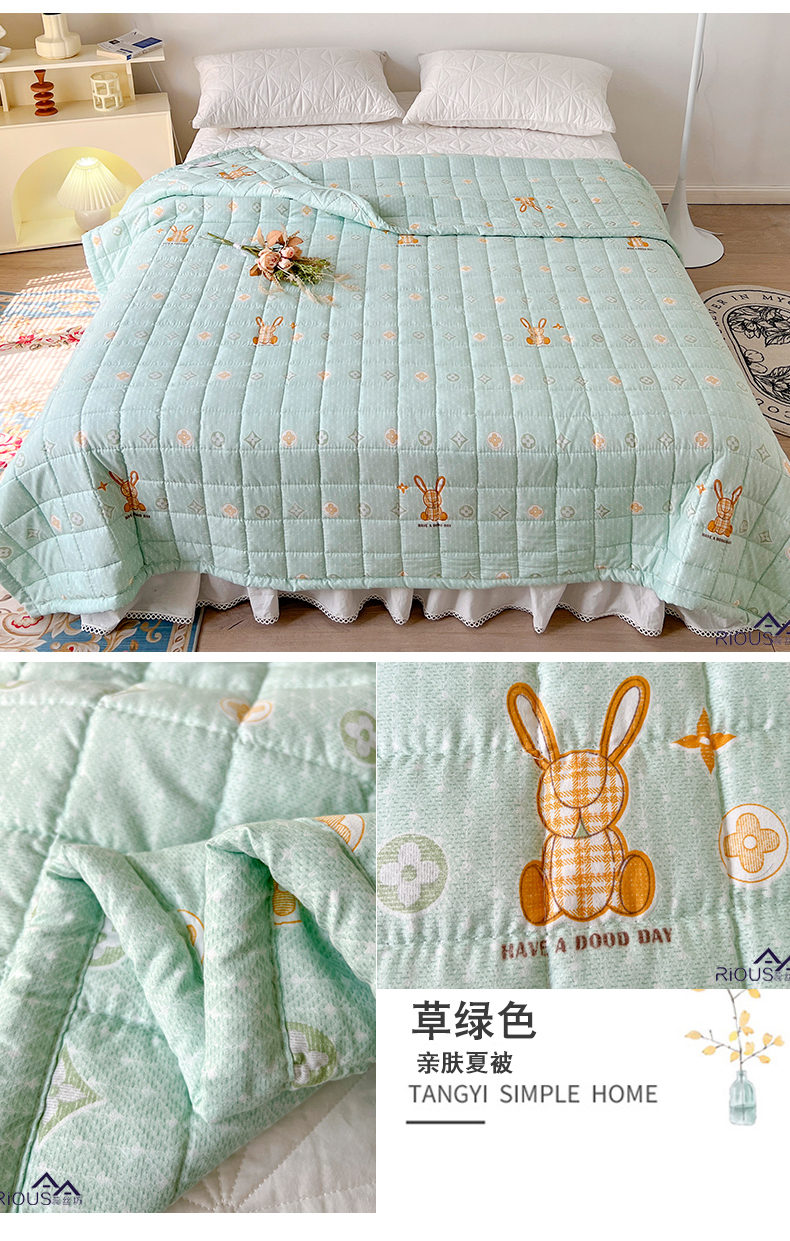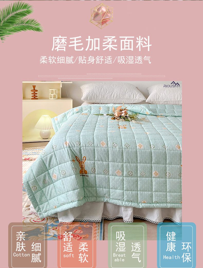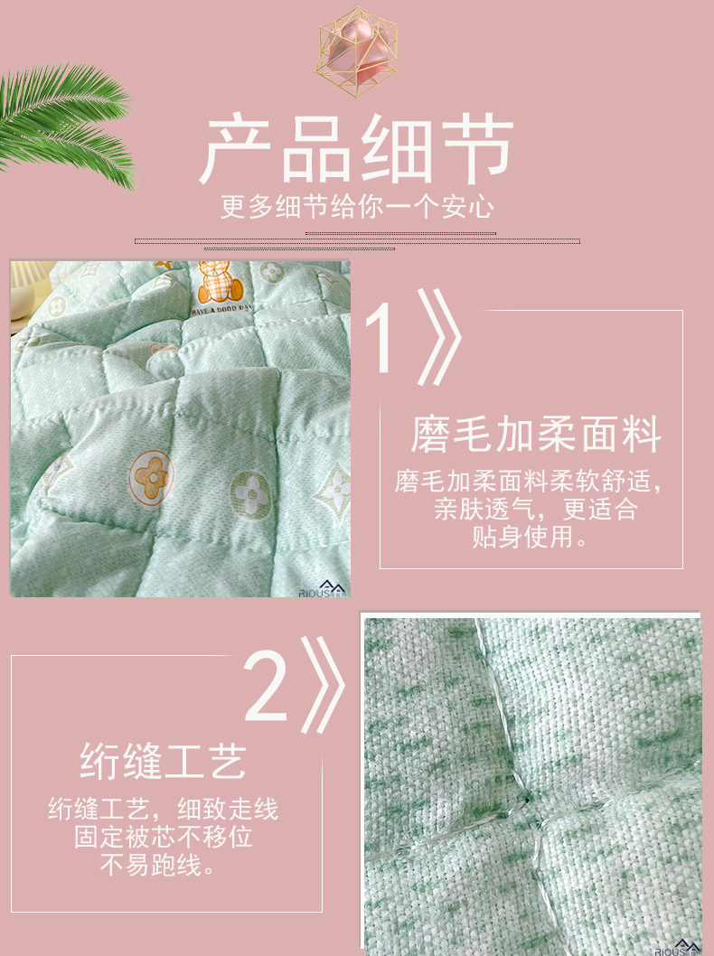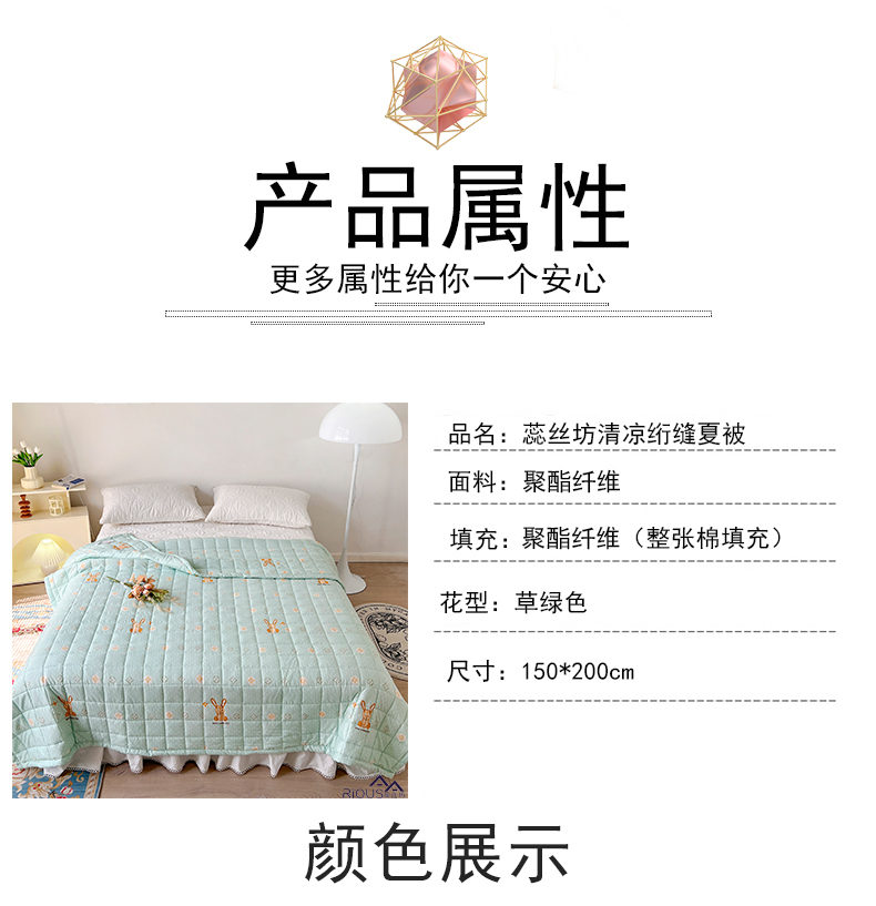 规 格:150*200cm 花 型:草绿色 面 料:磨毛面料(聚酯纤维) 填充物:整张羽丝绒棉(聚酯纤维) 工 艺:定位绗缝 1.面料是磨毛面料,透气不闷热,轻盈不压身,不起球,耐水洗,不变形。越洗越柔软,细腻柔软。 2.加密的绗缝宽包边,正方格工艺,再加上整张羽丝绒填充,整张棉更加平整挺括,更加耐用,长期使用都不用担心内芯缠绕导致结块结板,不用担心跑棉的问题,直接机洗手洗均可以,解放双手,省时省力。