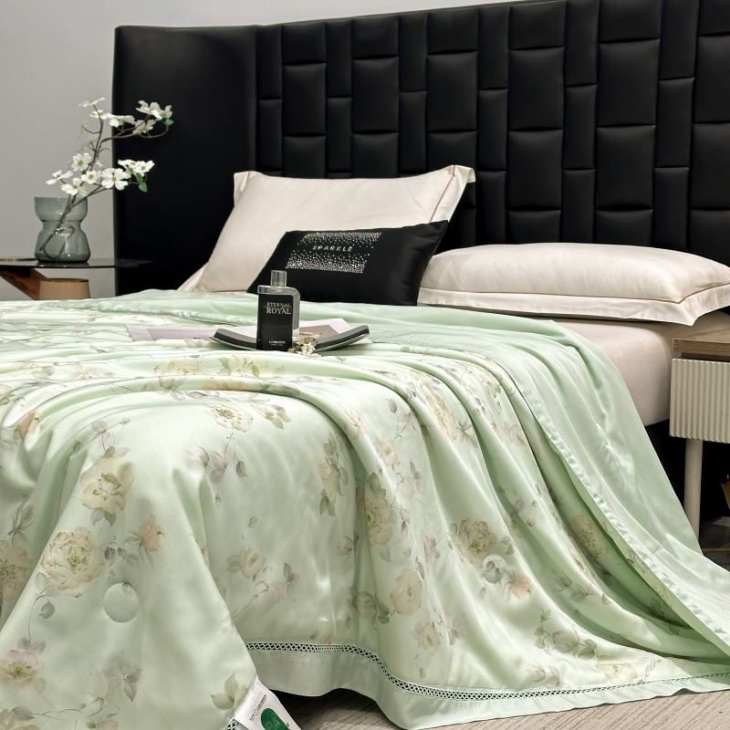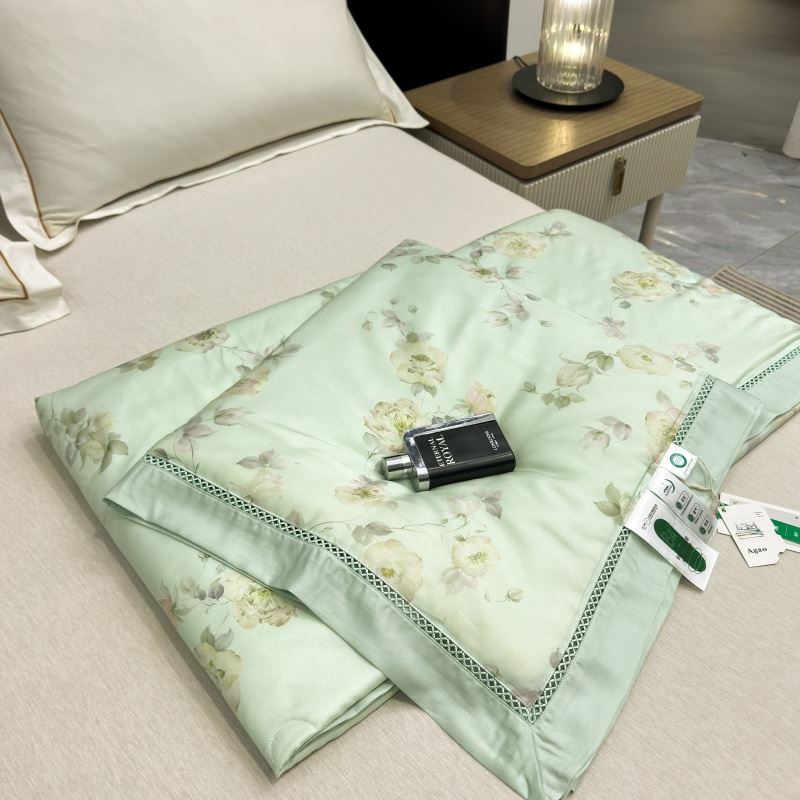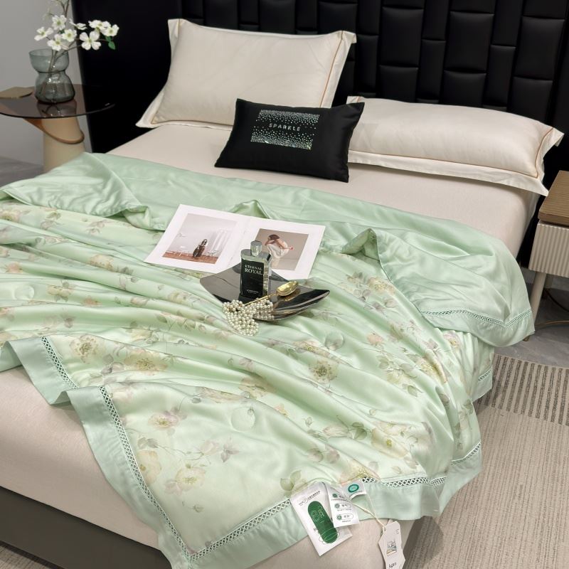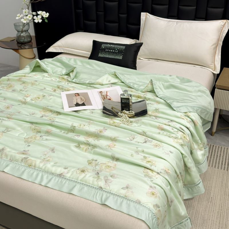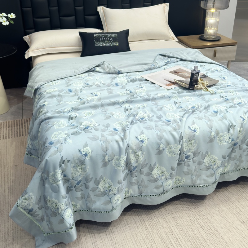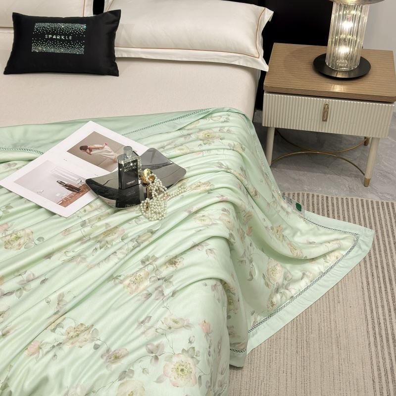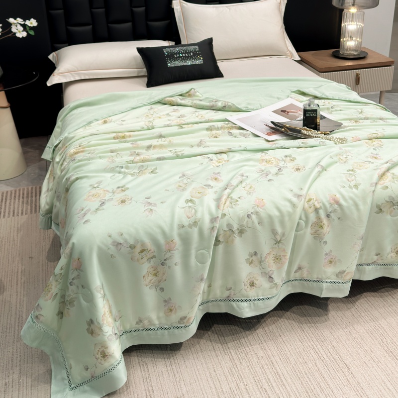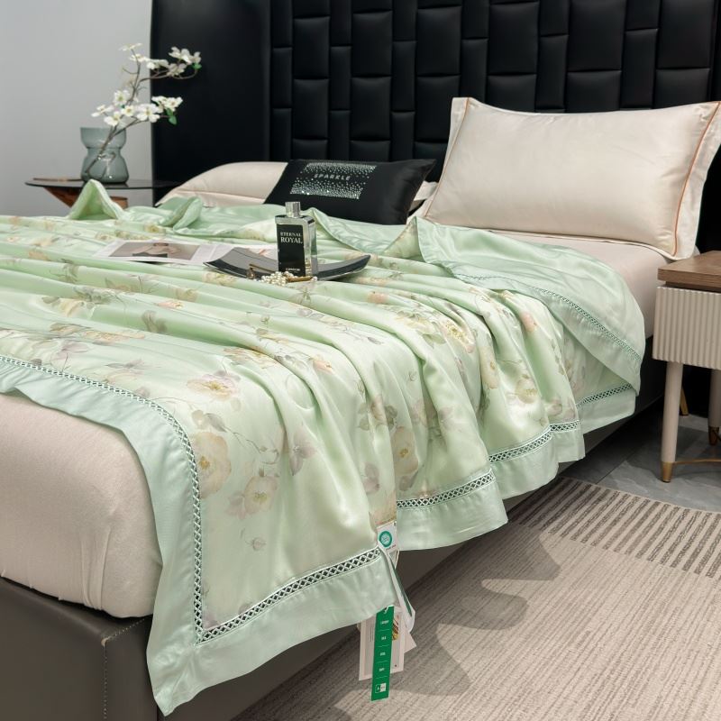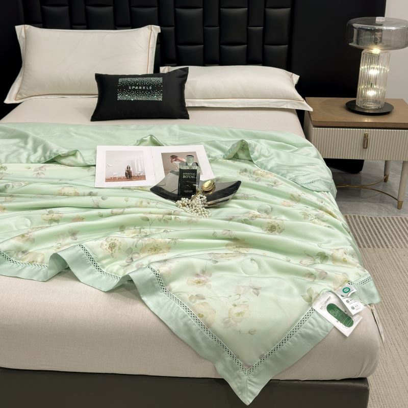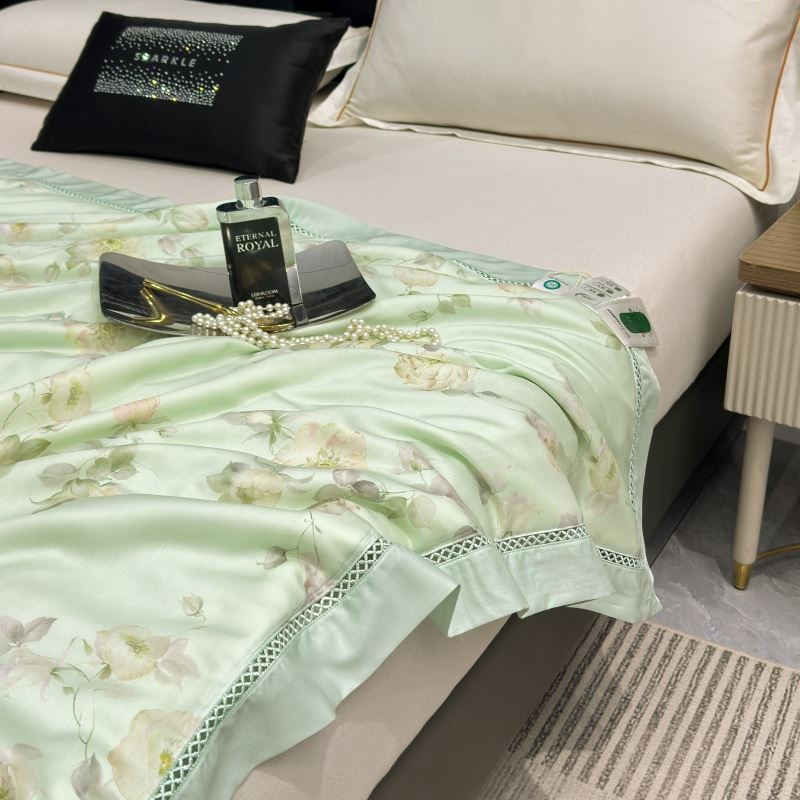超细旦莱赛尔纤维,面料光泽自然 手感细腻 透气滑爽 温而不燥,你值得拥有,数码印花工艺,不掉色,久用如新。 采用宽边镂空花边工艺,简约时尚。 【面料】莱赛尔纤维 【规格】150*200 cm