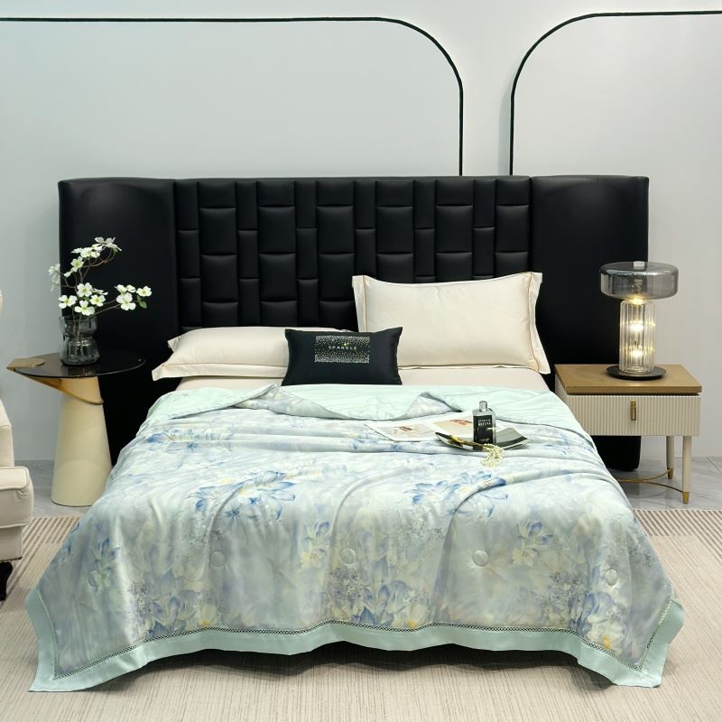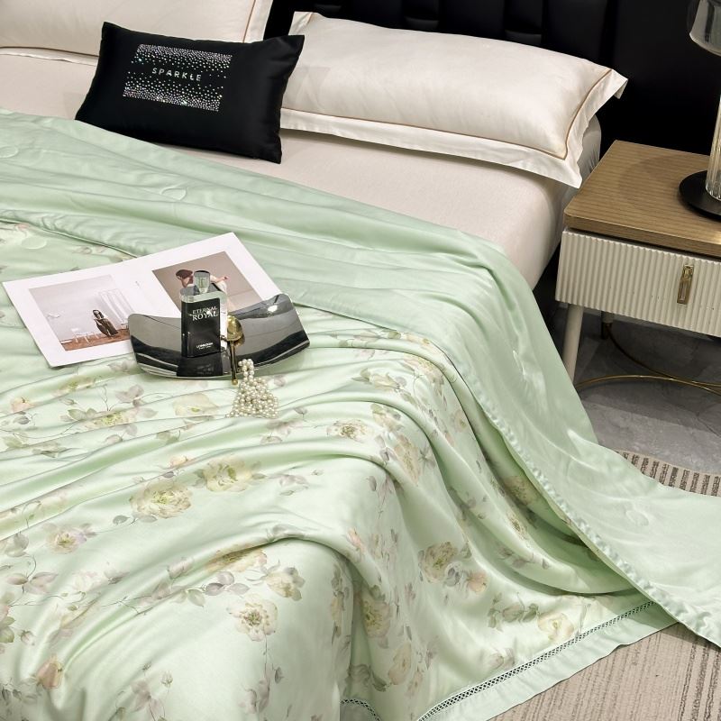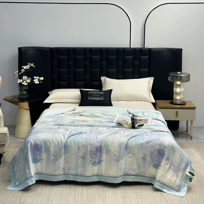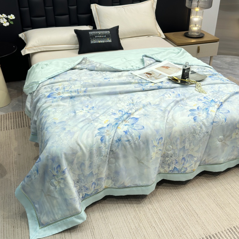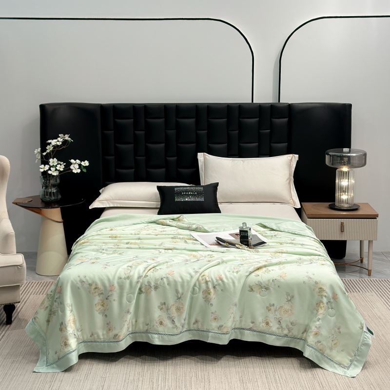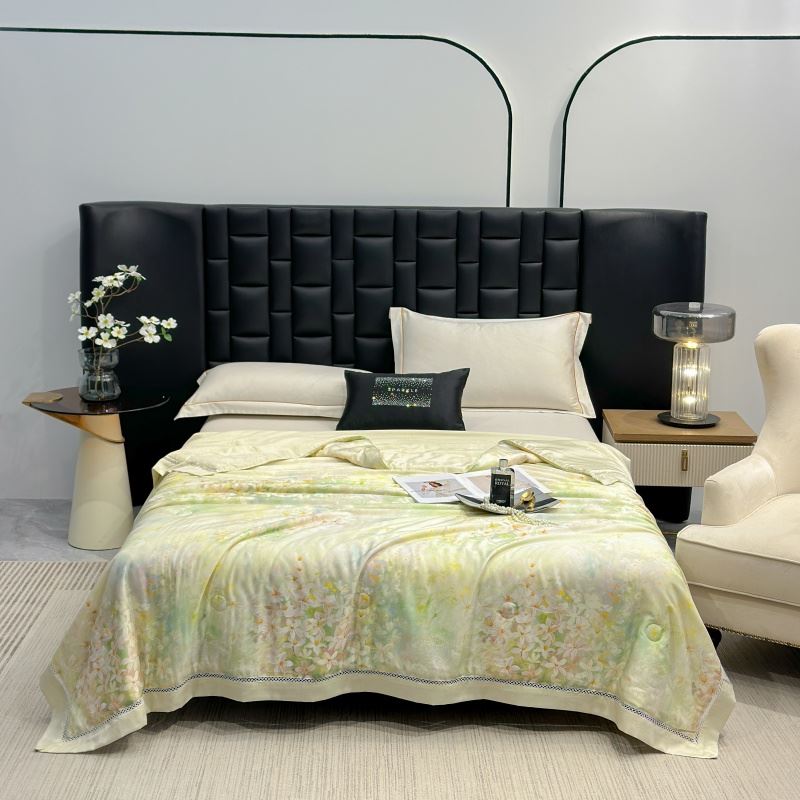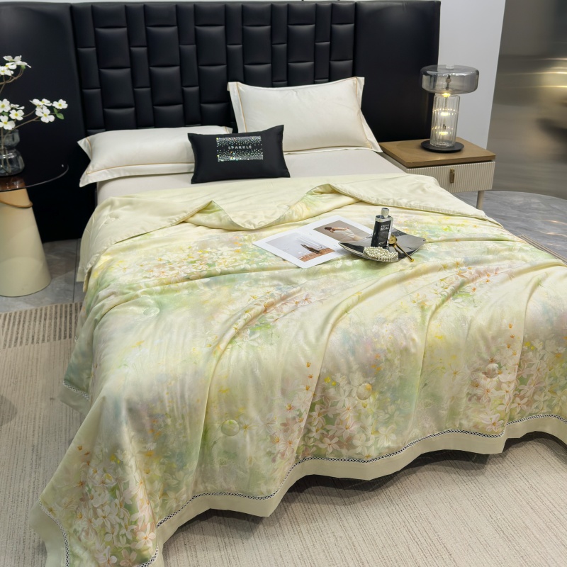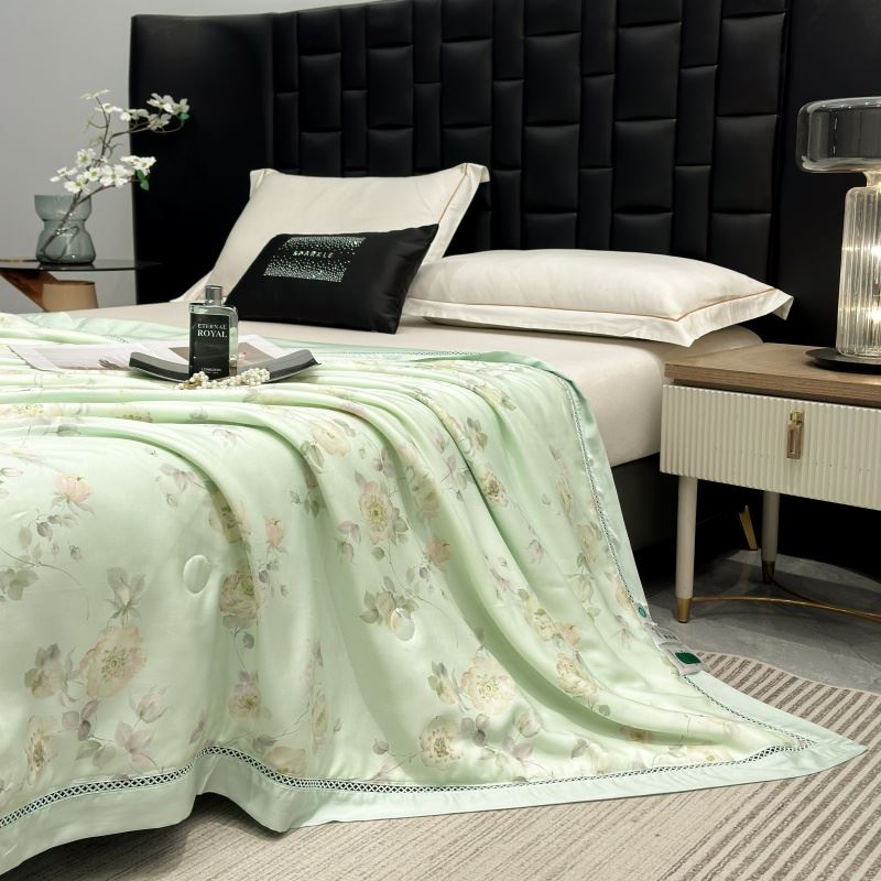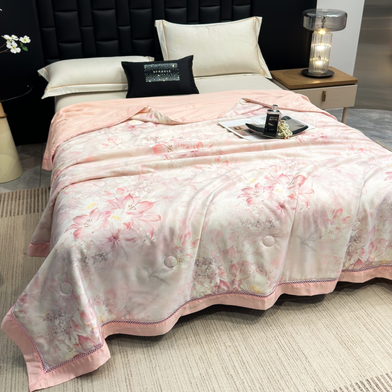超细旦莱赛尔纤维,面料光泽自然 手感细腻 透气滑爽 温而不燥,你值得拥有,数码印花工艺,不掉色,久用如新。 采用宽边镂空花边工艺,简约时尚。 【面料】莱赛尔纤维 【规格】150*200 cm