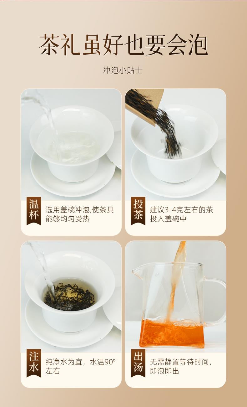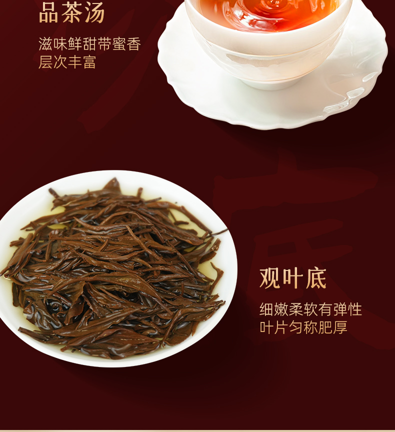 5.干茶=色泽乌润 金芽显露 茶汤=花果蜜香 红润透亮 叶底=鲜嫩均匀 完整舒展