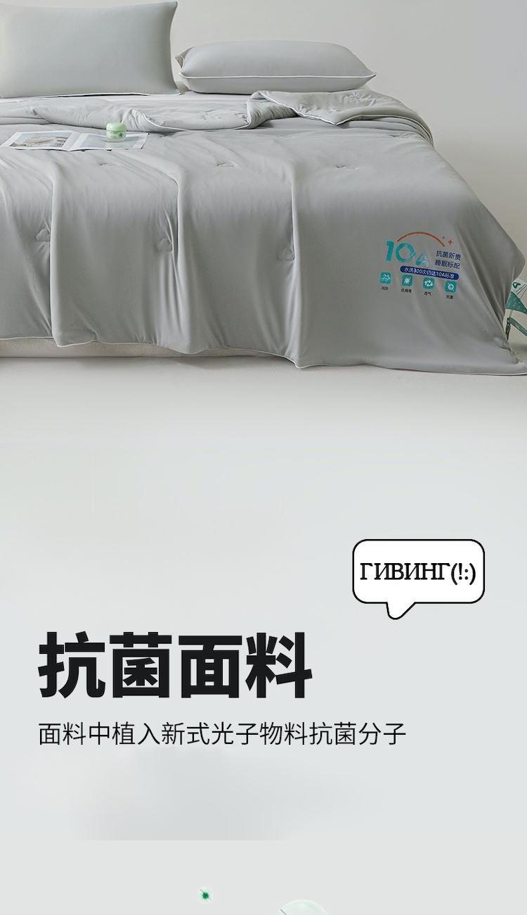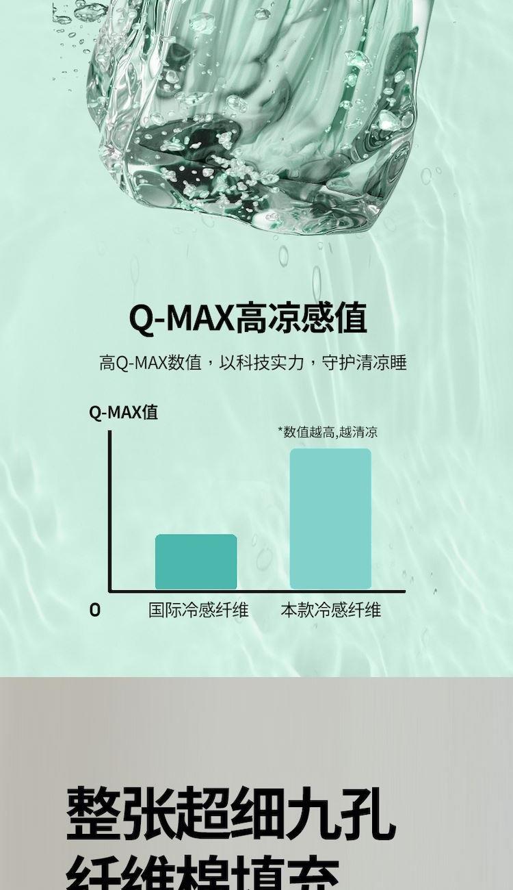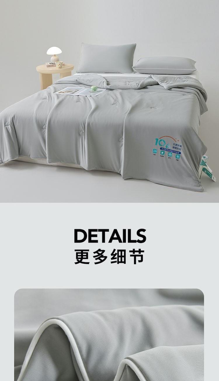 规格:200*230cm 面料:凉感纱(氨纶+聚酯纤维) 填充:羽丝棉(聚酯纤维) 重量:1.5kg 卖点:1.良好的透气度,给您清爽的舒适 2.利用独特的纤维断面结构,从而降低身体的温度 3.生产过程中不添加任何荧光剂,从里到外都很安心