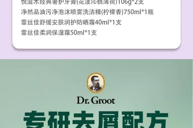 克洛特睿嫣头皮专研洗发水(干痒头皮用)700ml*1瓶 丝丽诺妃丝丽润活专护奢养洗发水1000ml*1瓶 安宝笛蓓缦香氛焕肤沐浴露(温暖麝香)600ml*1瓶 安宝笛浪漫邂逅丝绒香水身体乳400ml*1瓶 竹盐喜马拉雅粉盐益护清新派缤牙膏(沁爽薄荷)285g*1瓶 竹盐喜马拉雅粉盐精华美白派缤牙膏(星耀花香)285g*1瓶 悦滋木经典奢护牙膏(花漾沁桃薄荷)106g*2支 净然品油污净泡沫喷雾洗洁精(柠檬香)750ml*1瓶 霏丝佳舒缓安肤润护防晒霜40ml*1支 霏丝佳柔润保湿霜50ml*1支