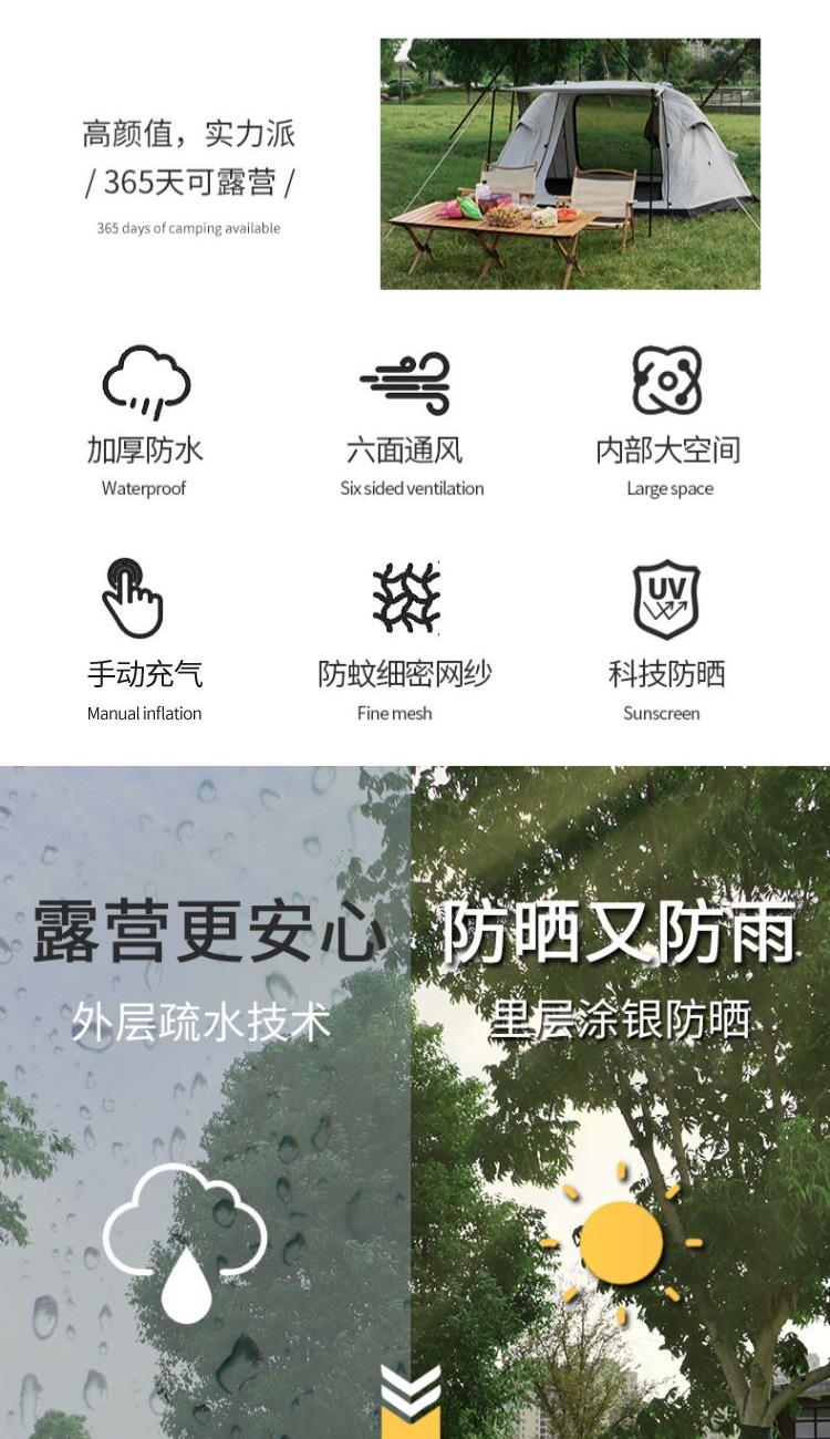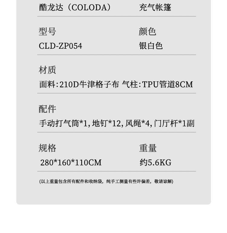 帐身:210D牛津格子布 PU2000 底料:210D牛津布PU3000 框架:TPU管Φ8cm,SBS尼龙拉链 杆子:铁管Φ16mm 1.2 m*2