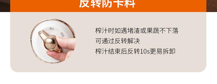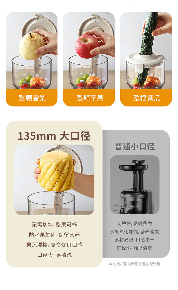产品规格: 额定电压:220V~50Hz 额定功率:120W 产品口径:135mm 外壳材质:PP 操作方式:旋钮操作 产品颜色:米白 产品特点: 135mm超大口径,果蔬免切整只榨取; 强扭力混榨电机,低温螺旋慢榨,保持水果原有风味; 无金属滤网,提高出汁率,清洁更轻松; 正转、反转双档位设计,反转防卡料; 鲜果接触部位全部采用食品级材料; 易拆易洗,一冲即净。