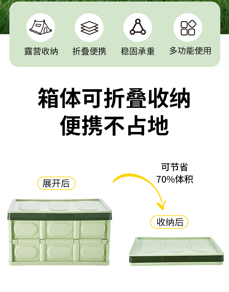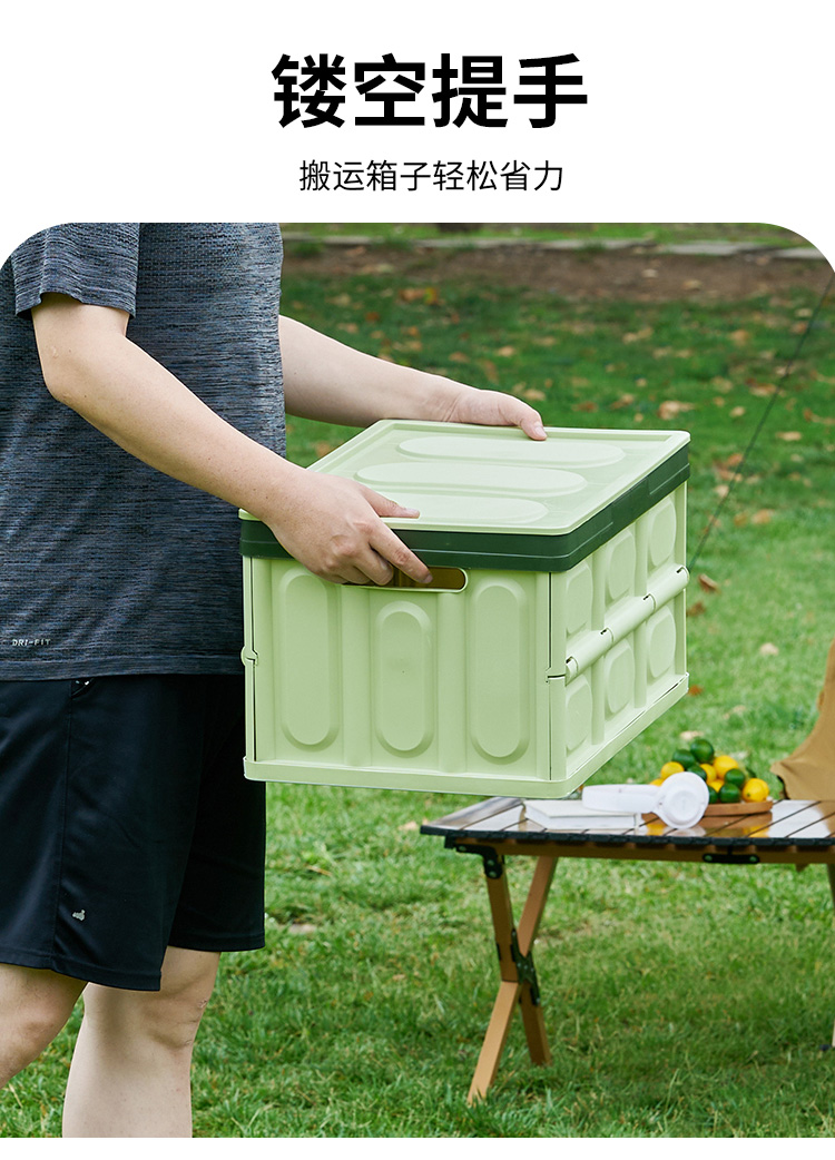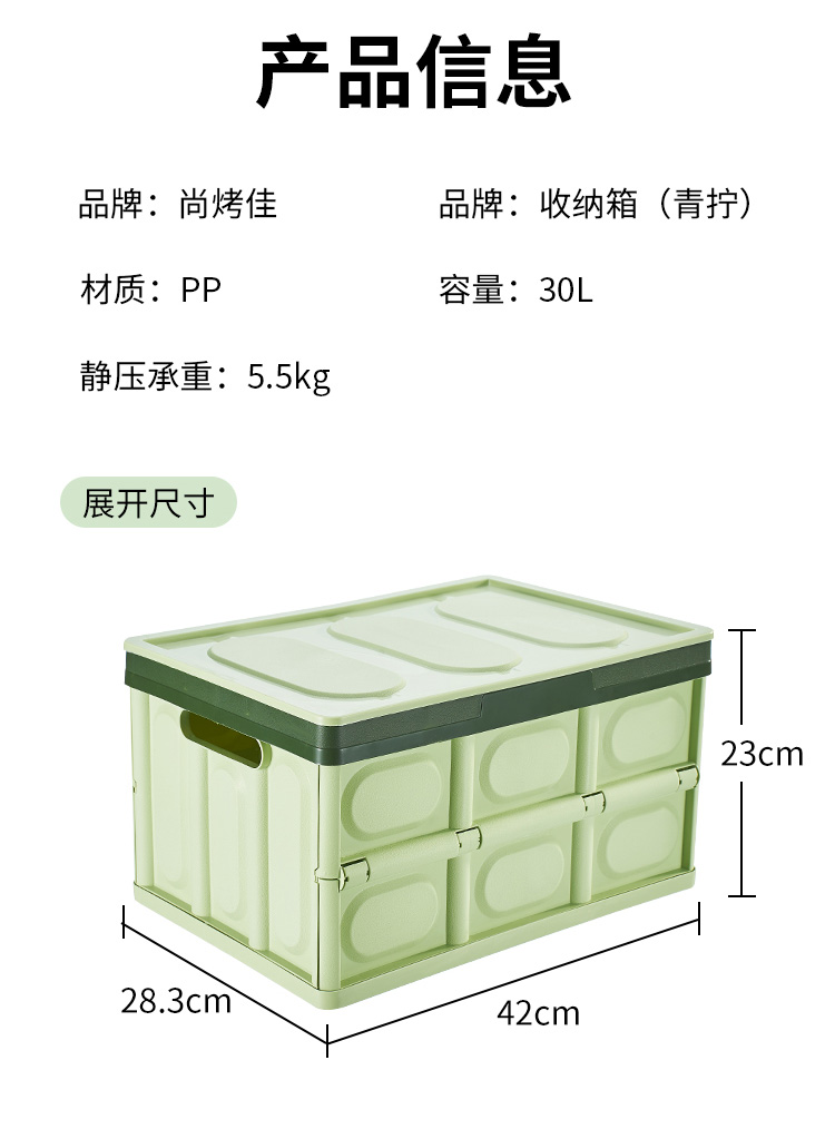 材质:PP 容量:30L 静压承重:5.5kg 尺寸:展开长42cm*宽28.3cm*高23cm 收纳:长42cm*宽28.3cm*高5.7cm