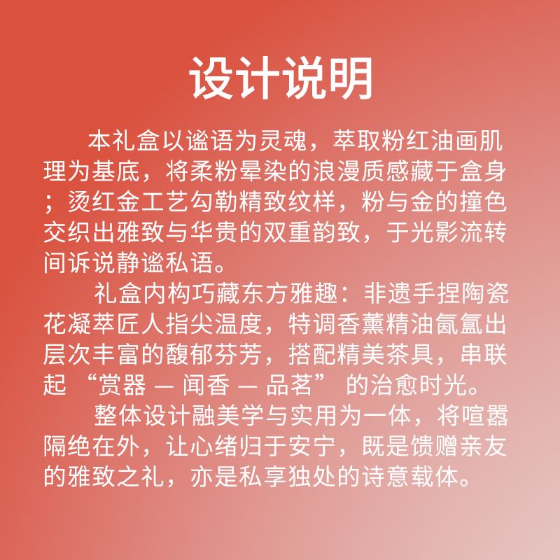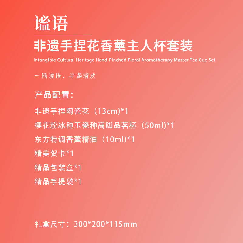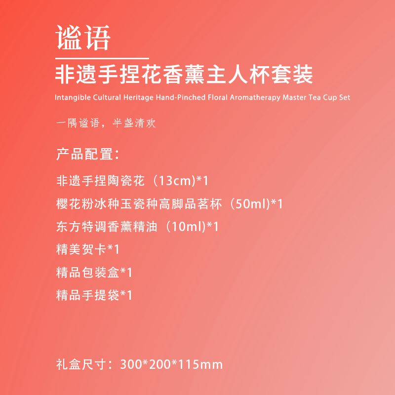 【产品配置】 非遗手捏陶瓷花(13cm)*1 樱花粉冰种玉瓷种高脚品茗杯(50ml)*1 东方特调香薰精油(10ml)*1 精美贺卡*1 精品包装盒*1 精品手提袋*1 【产品说明】 1、13cm大尺寸非遗手捏陶瓷花,兼具文化与艺术价值; 2、樱花粉高脚品茗杯,温润通透; 3、一套涵盖主人杯与香薰精油,适配独处品茗与疗愈场景; 4、樱花粉主调+繁花意象,传递松弛闲适的生活氛围感; 5、配套精美包装与贺卡,仪式感拉满,适配女神节等场景。