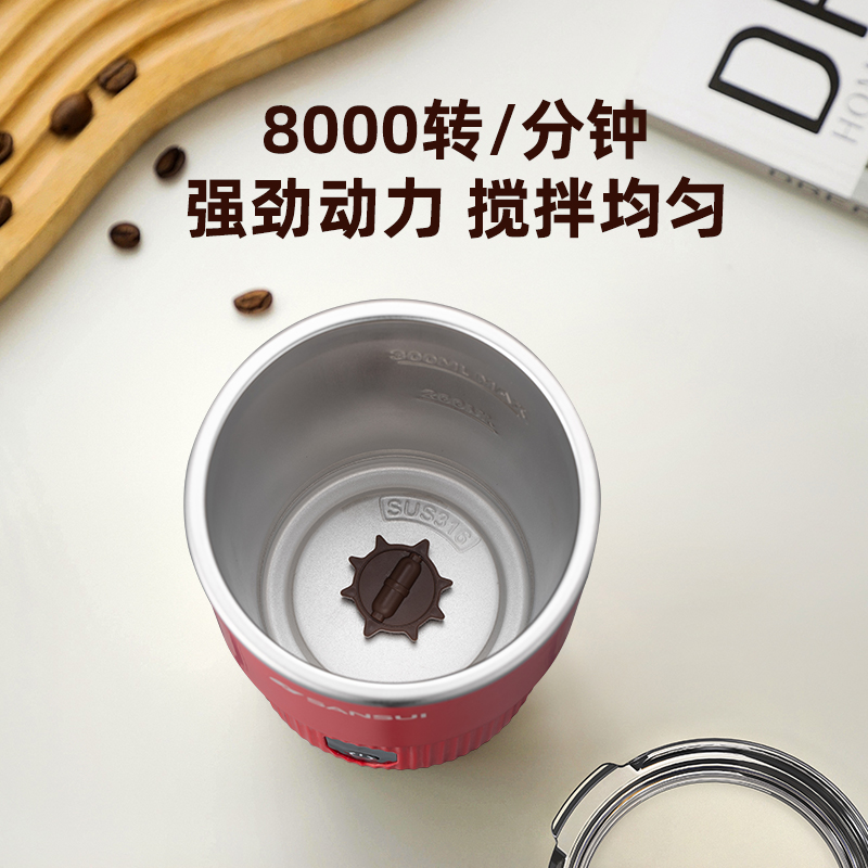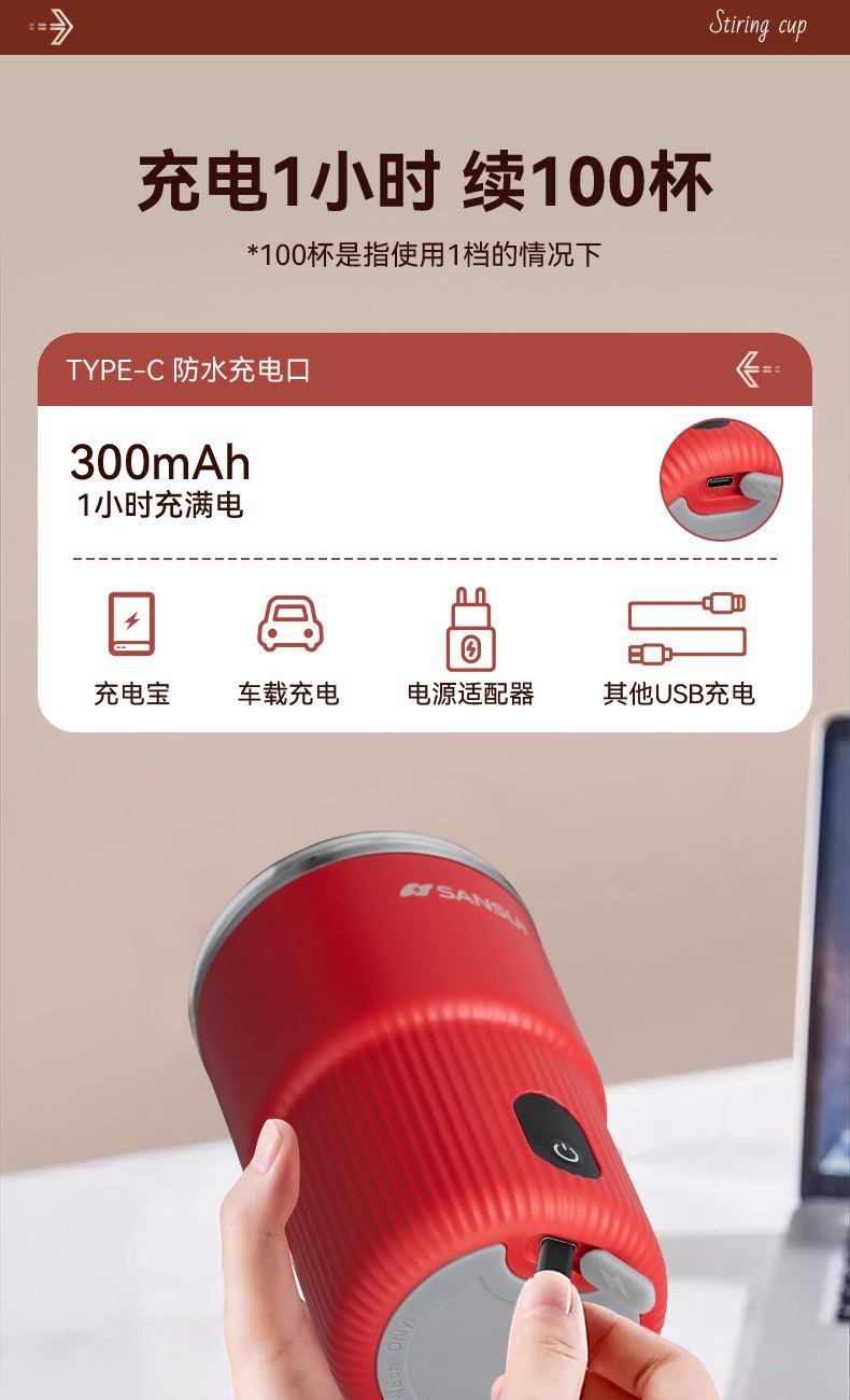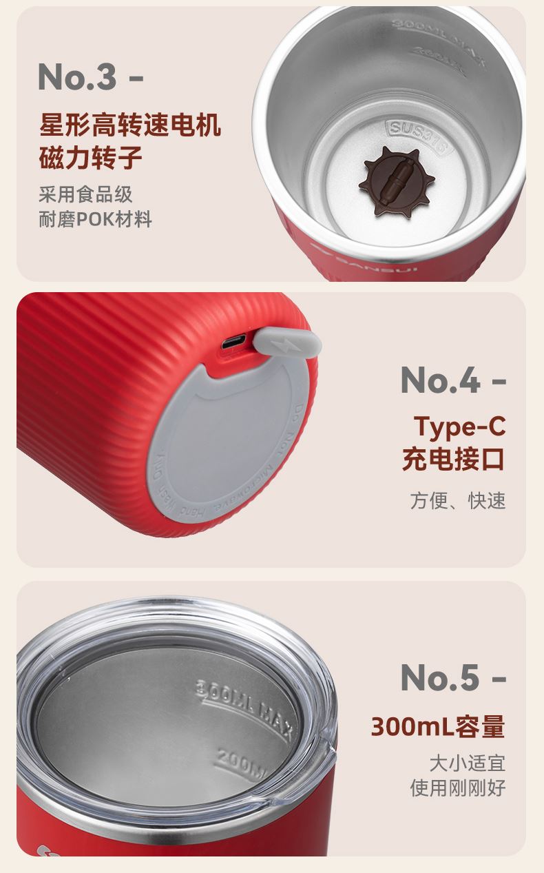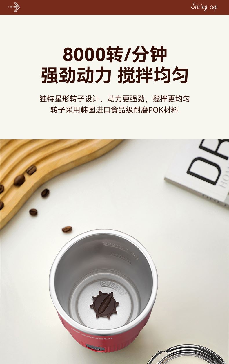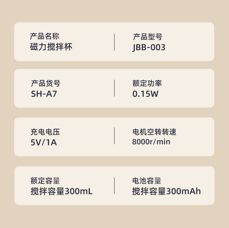 额定容量:300mL 充电电压:5V 充电电流:1A 额定功率:0.15W 额定电压:3.7V 全新升级数显磁力搅拌杯 316不锈钢内胆 一键搅拌、整杯300mL 8000转强劲动力、整机防水、温度、电量显示设计 快慢两档搅拌控制 磁力转子采用食品级耐磨POK材料 包装方式:彩包+网购包装