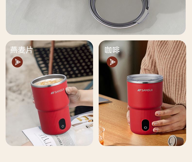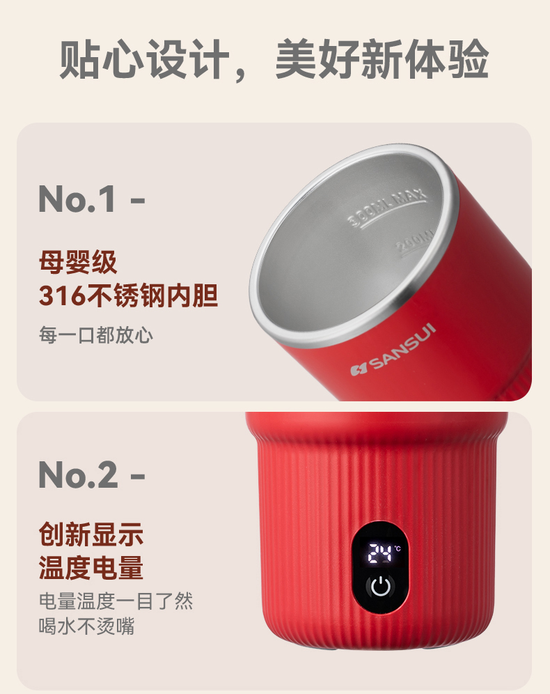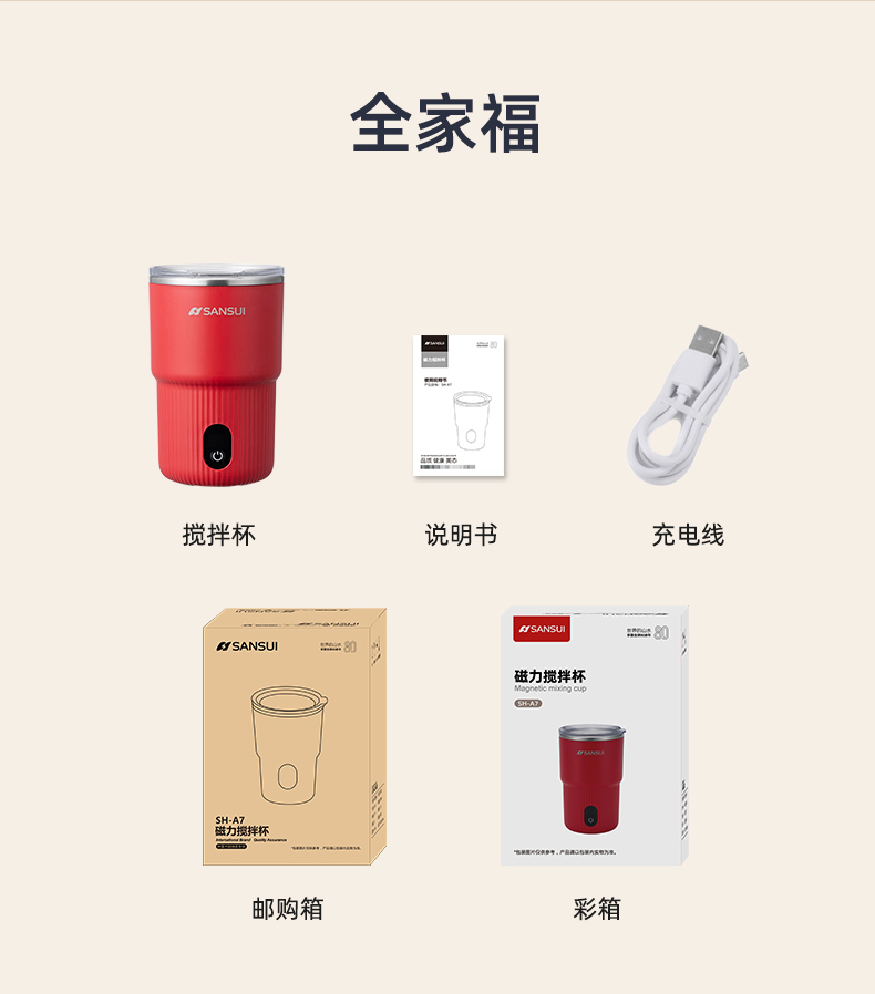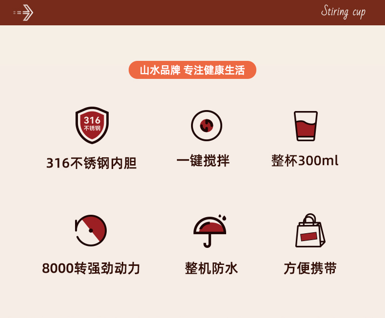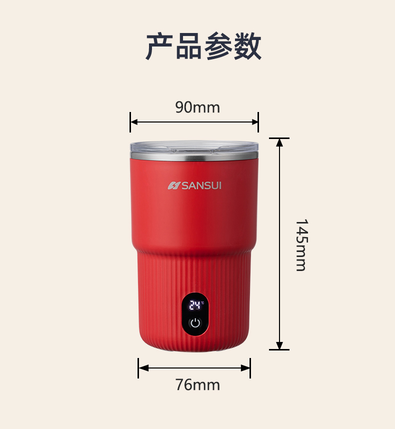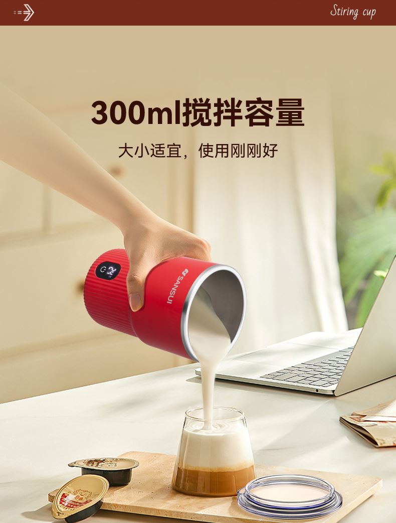 额定容量:300mL 充电电压:5V 充电电流:1A 额定功率:0.15W 额定电压:3.7V 全新升级数显磁力搅拌杯 316不锈钢内胆 一键搅拌、整杯300mL 8000转强劲动力、整机防水、温度、电量显示设计 快慢两档搅拌控制 磁力转子采用食品级耐磨POK材料 包装方式:彩包+网购包装