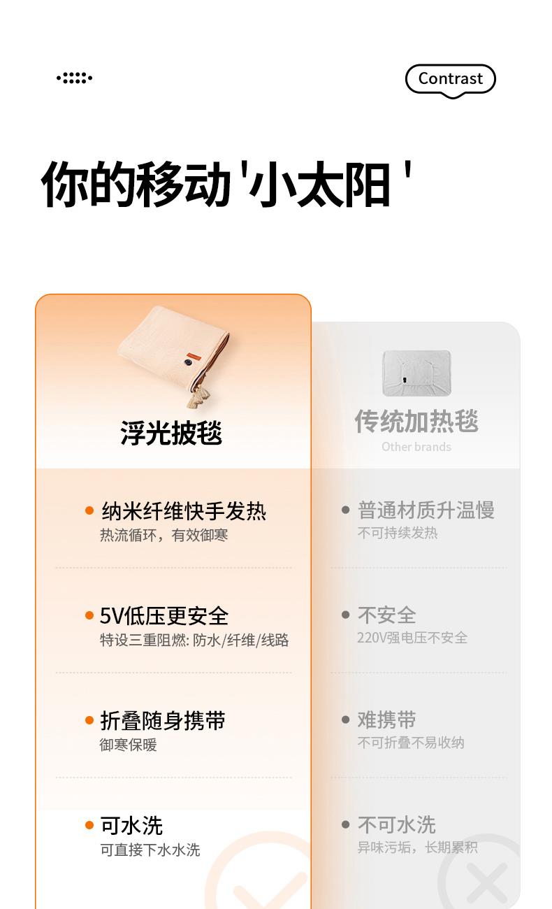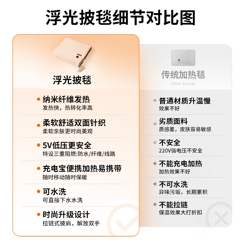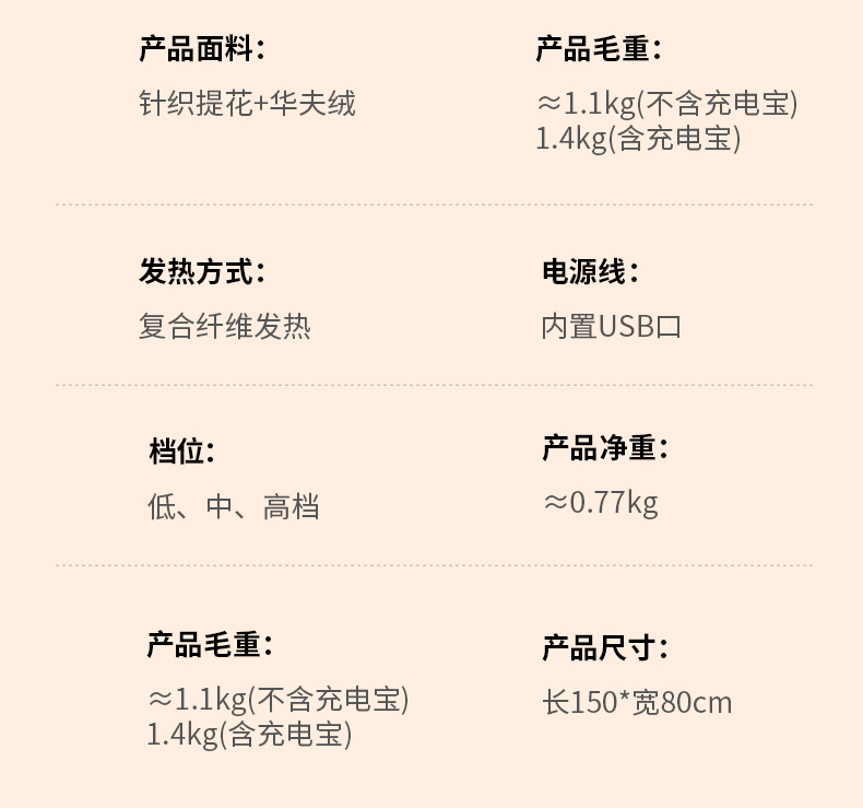 型号:高配款SDN-2099 输入电压: 5V 输入功率: 10W 充电宝:1万毫安 户外、办公、居家都可用的便携式移动电热披肩暖身毯、两种应用模式: 1、用充电宝供电使用 2、USB电源接口插手机充电器使用,5V低电压更安全、三重安全保障、复合纤维快速发热、全毯可水洗、三挡温度可调、可披可盖多功能暖身毯、折叠收纳方便、防静电针织提花面料透气性好柔软舒适、四季可用冬暖披肩/夏凉薄被 包装方式:礼盒+泡沫袋