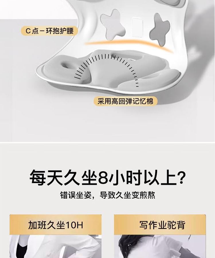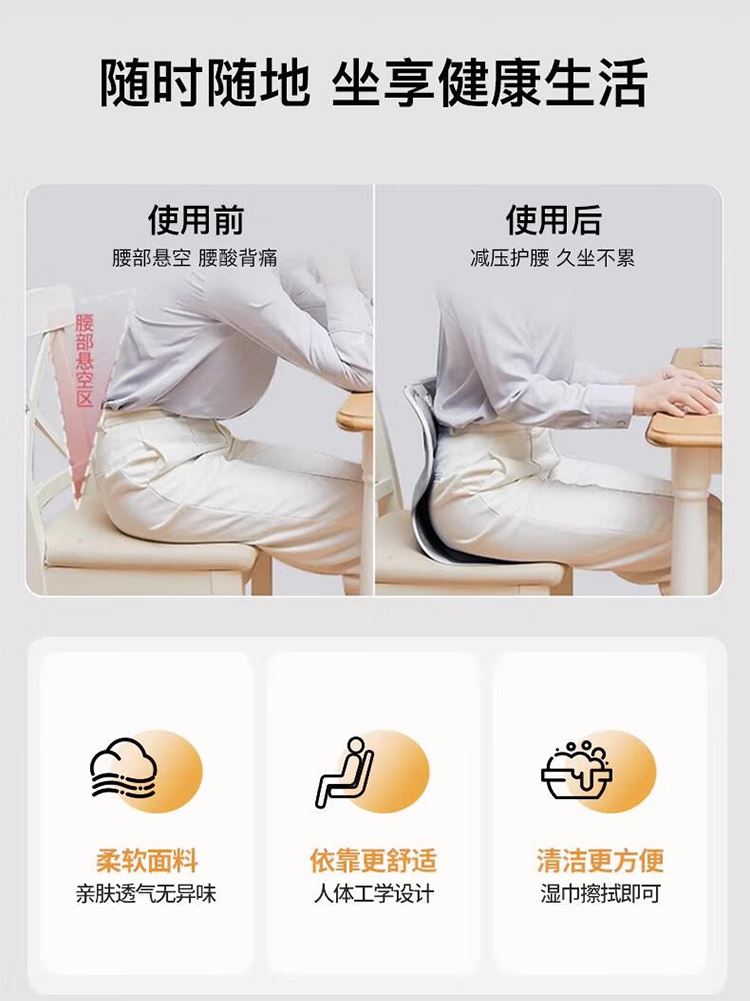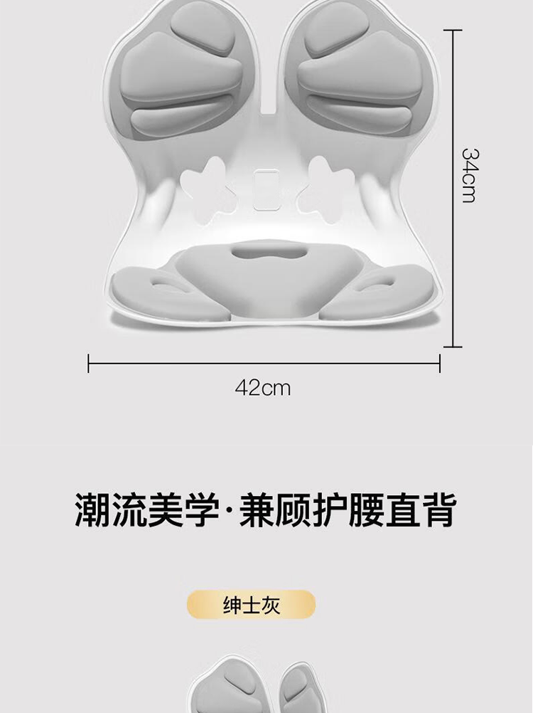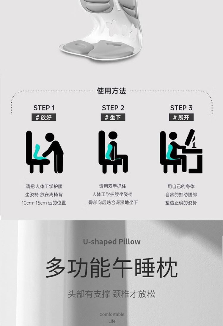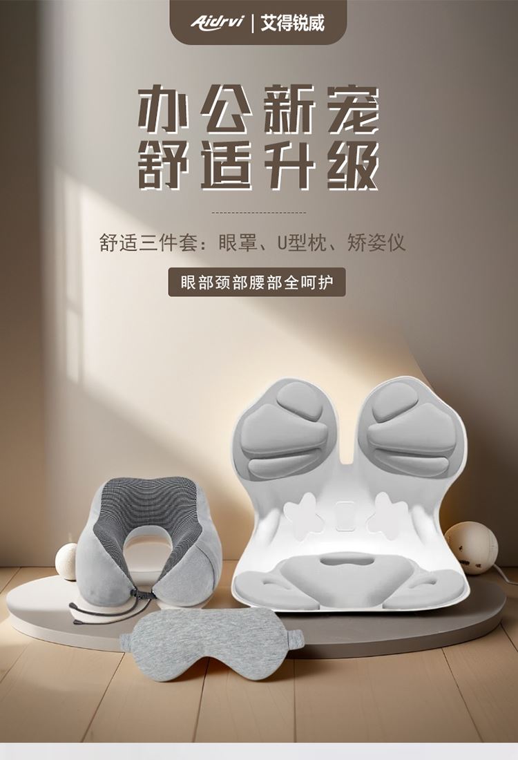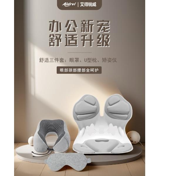产品尺寸:护腰矫姿仪:42x32x34cm/护颈枕:28*26*14cm/护眼罩:23*8*9cm 产品材质:聚丙烯+记忆棉+天竺棉 套装组合:护颈枕+护眼罩+护腰矫姿仪 彩盒尺寸:42*30*36cm 外箱尺寸:63*45.5*76cm 护颈枕:适用不同场合使用,居家休闲,办公工作,出差旅行,携带方便; 护腰矫姿仪:S型人体工程学+尾椎设计,科学护腰,背部镂空,散热不闷,舒适就坐; 护眼罩:人体工程学设计,便携收纳,睡觉更香;