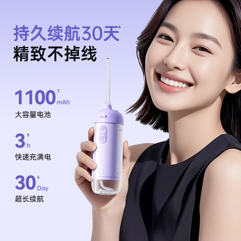 便携式大容量冲牙器 产品型号:O16 【支持logo定制 40支起】 颜色:白色、紫色、绿色、黑色 (更多颜色可以定制) 配置:冲牙器主机*1 喷嘴*4 充电线*1 脉冲频率:1700次/分 产品模式:4种模式 产品水压:40-120PSl 水箱容量:200ml 额定功率:8W 电池容量:1100mAh 续航时间:60天 充电接口:Type-C 防水等级:lPX8