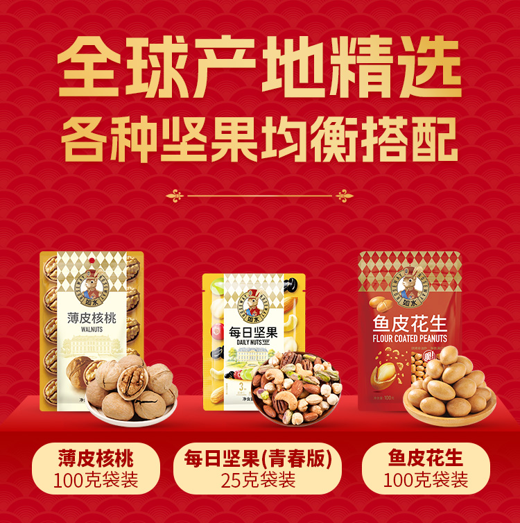 如水红运桶礼盒 净含量:565g 如水薄皮核桃100g 如水每日坚果(青春版)25g 如水鱼皮花生100g 如水怪味胡豆100g 如水黄油坚果小曲奇40g 如水坚果红枣小桃酥90g 如水原味山楂条110g