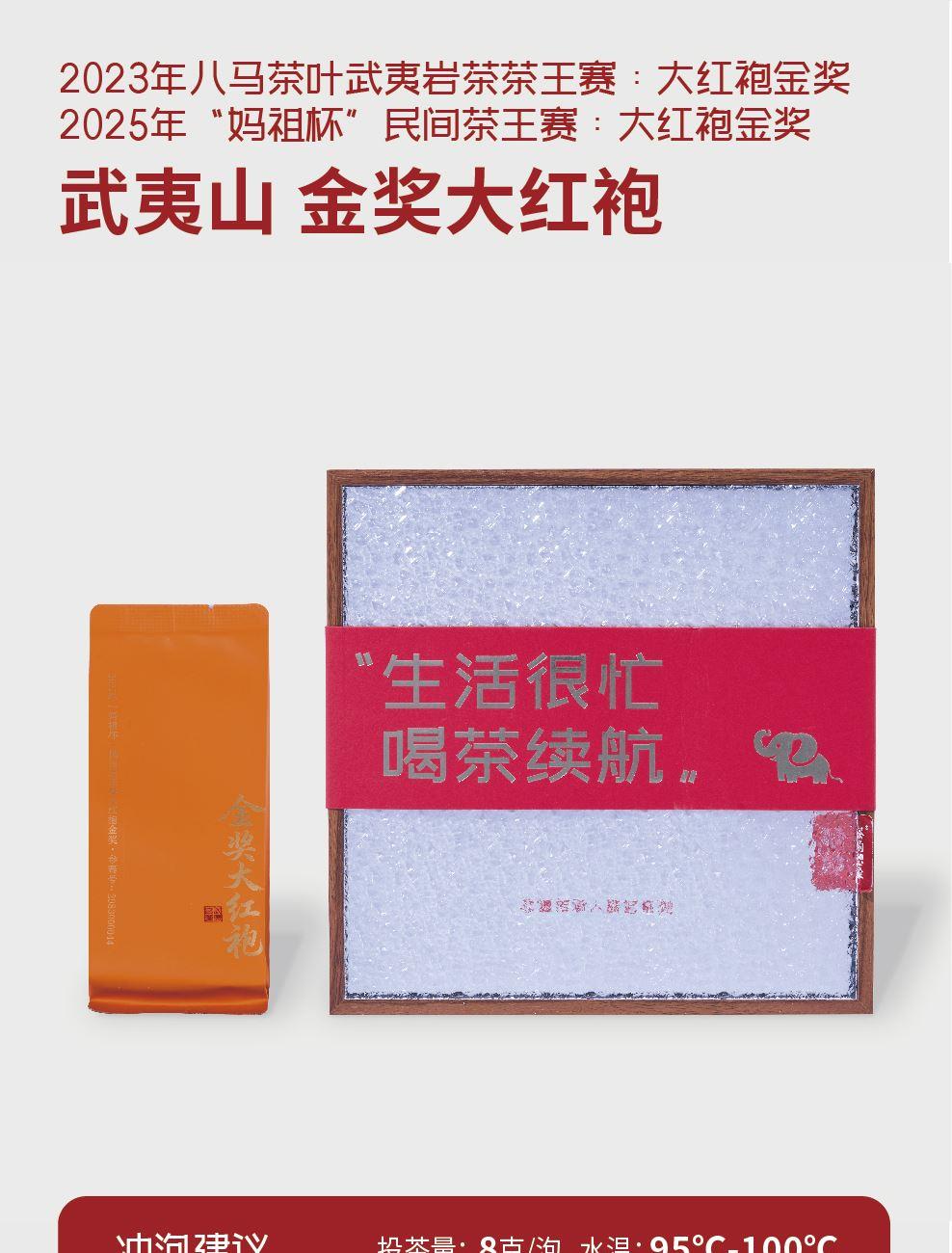 2025年“妈祖杯”民间茶王赛:大红袍金奖 此款大红袍,滋味醇厚,岩韵十足,香气高昂馥郁,具有花粉香、花果香,让您喝到武夷岩茶获奖茶的滋味感受。